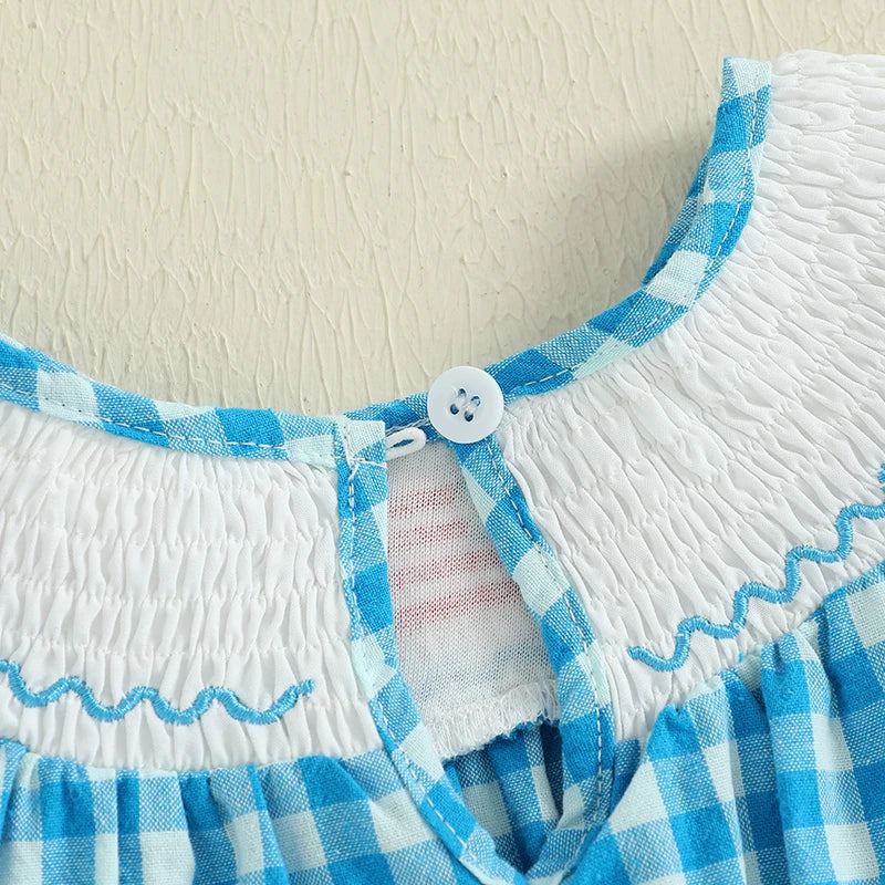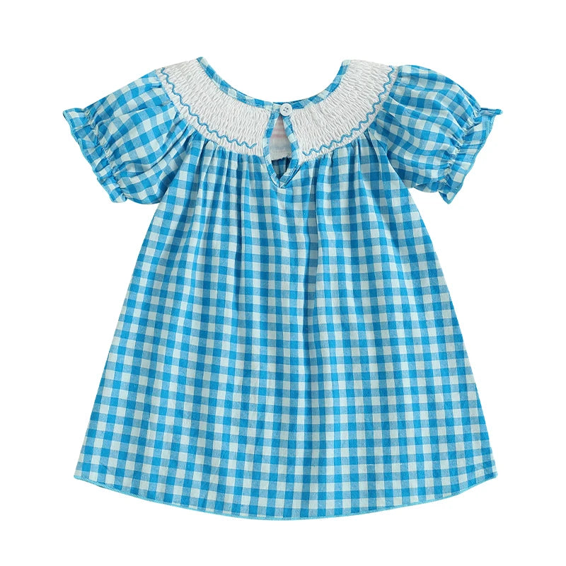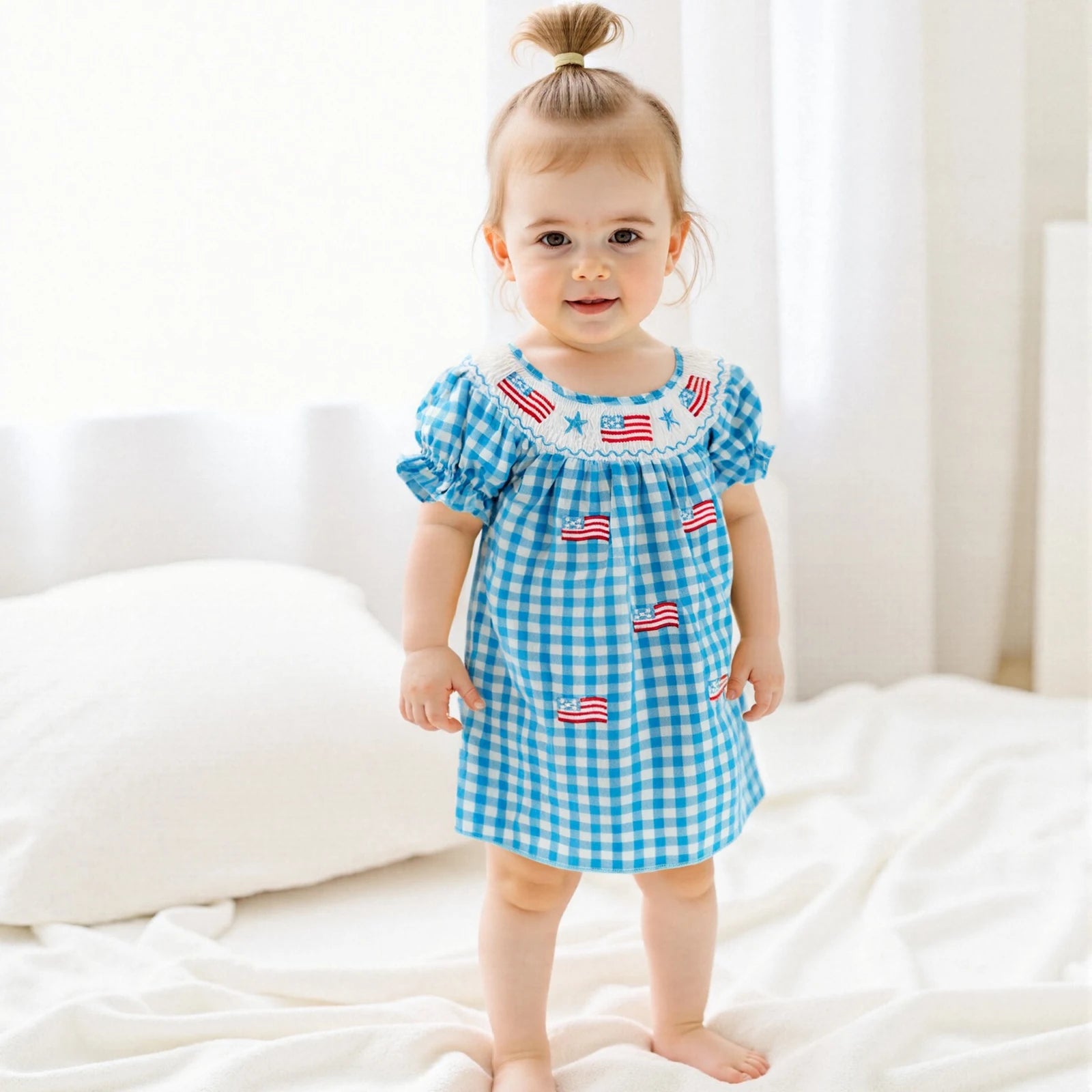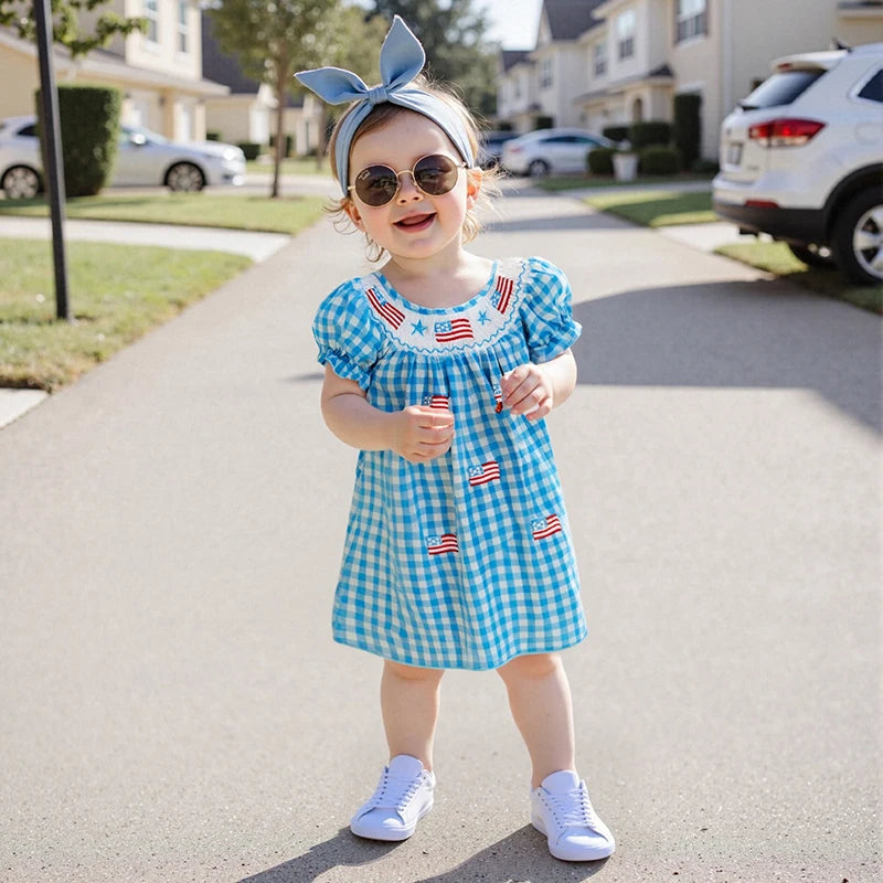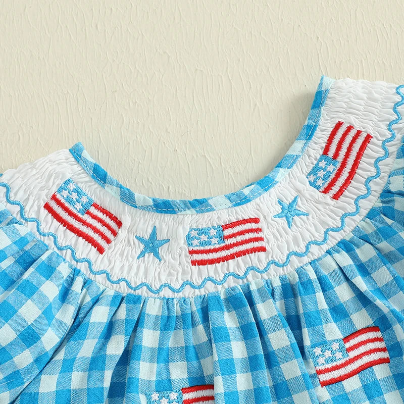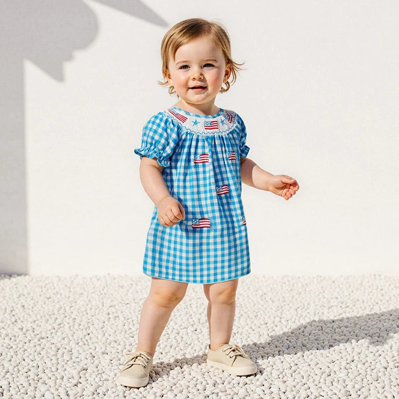 0-4Y Kids Girl’s Short Sleeve Embroidery Crew Neck Plaid Flags Print A-Line Dress