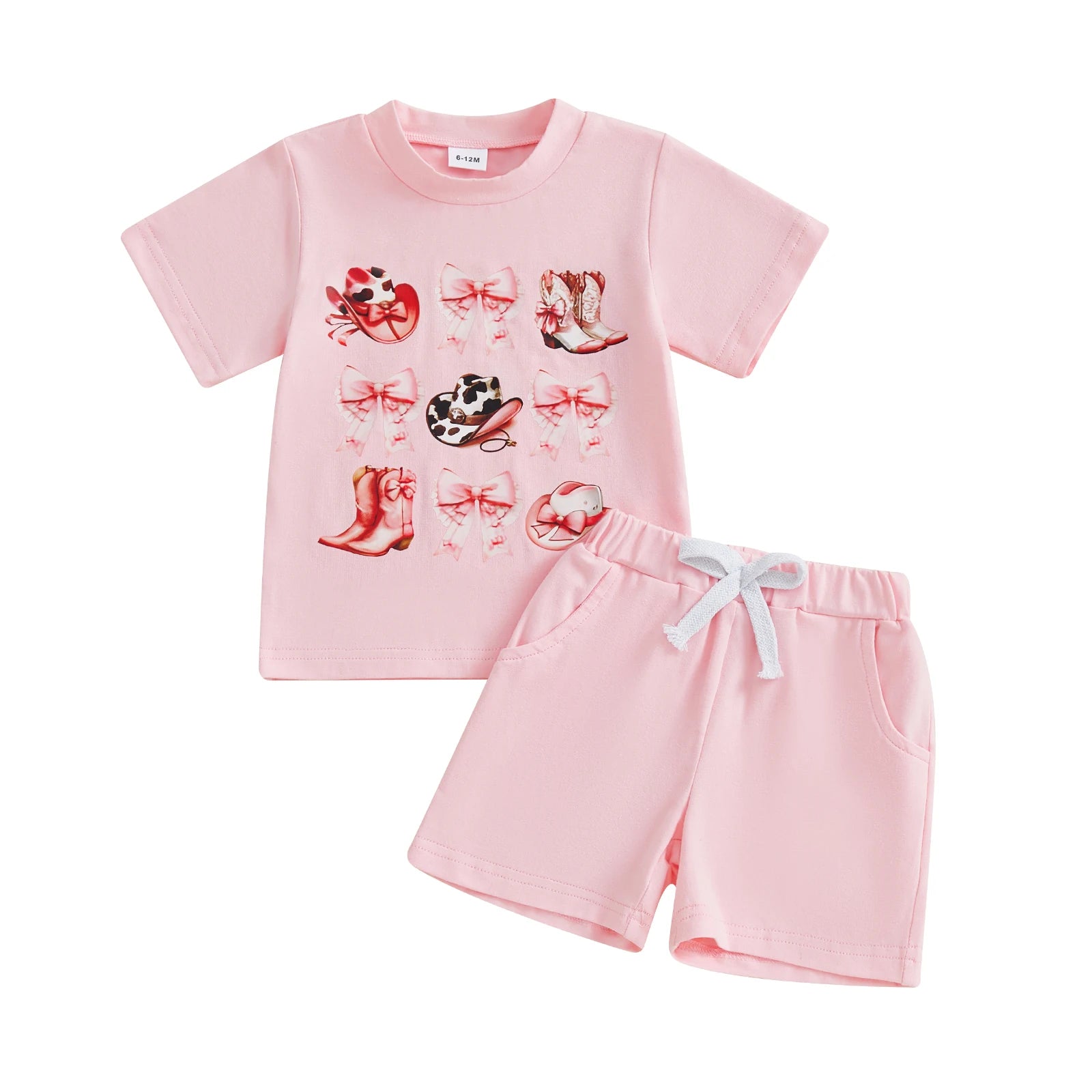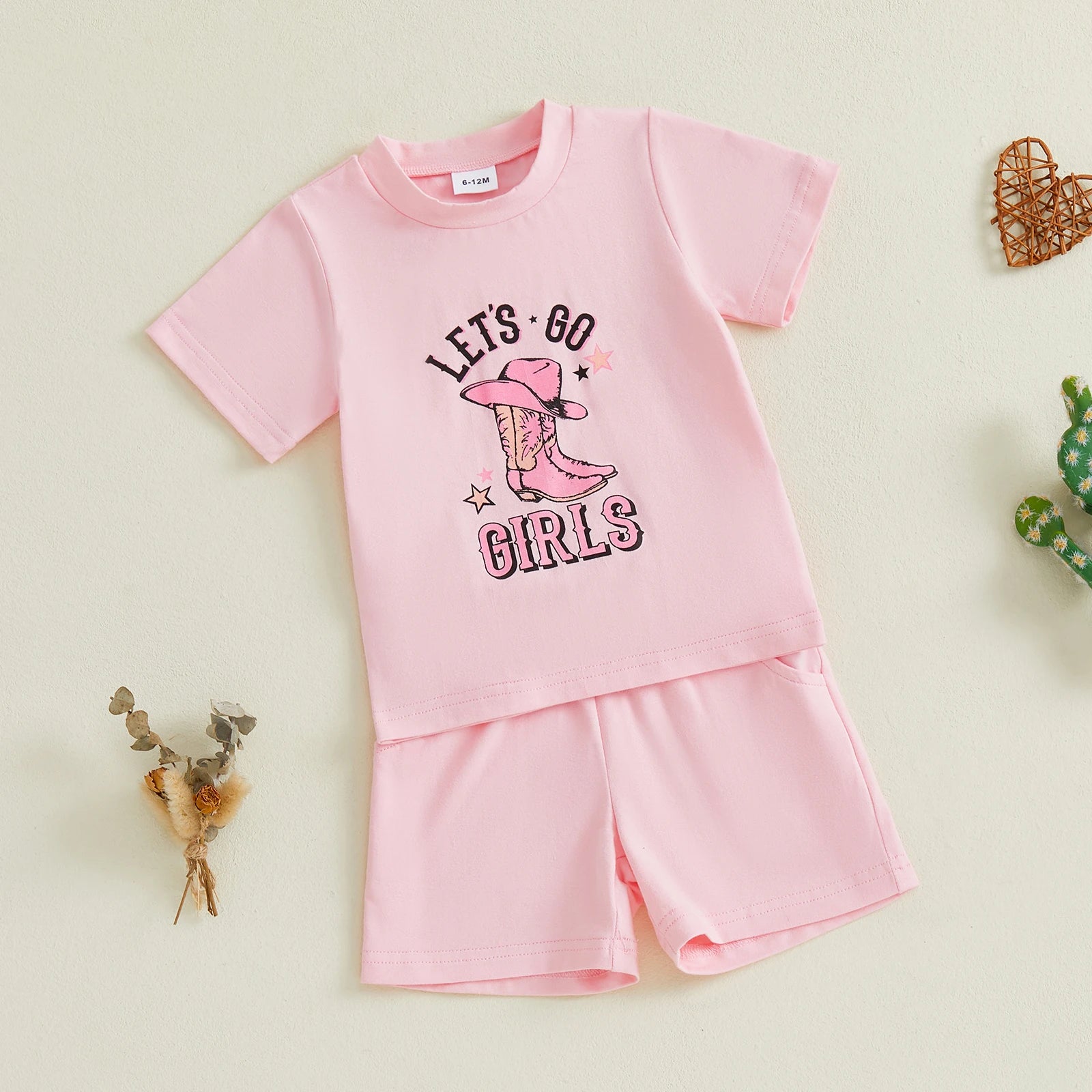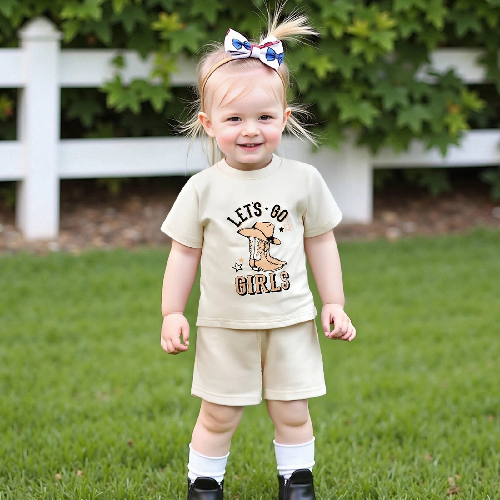 0-4Y Kids Girls Clothes Set Short Sleeve Crew Neck Letters Boots Print T-shirt with Shorts