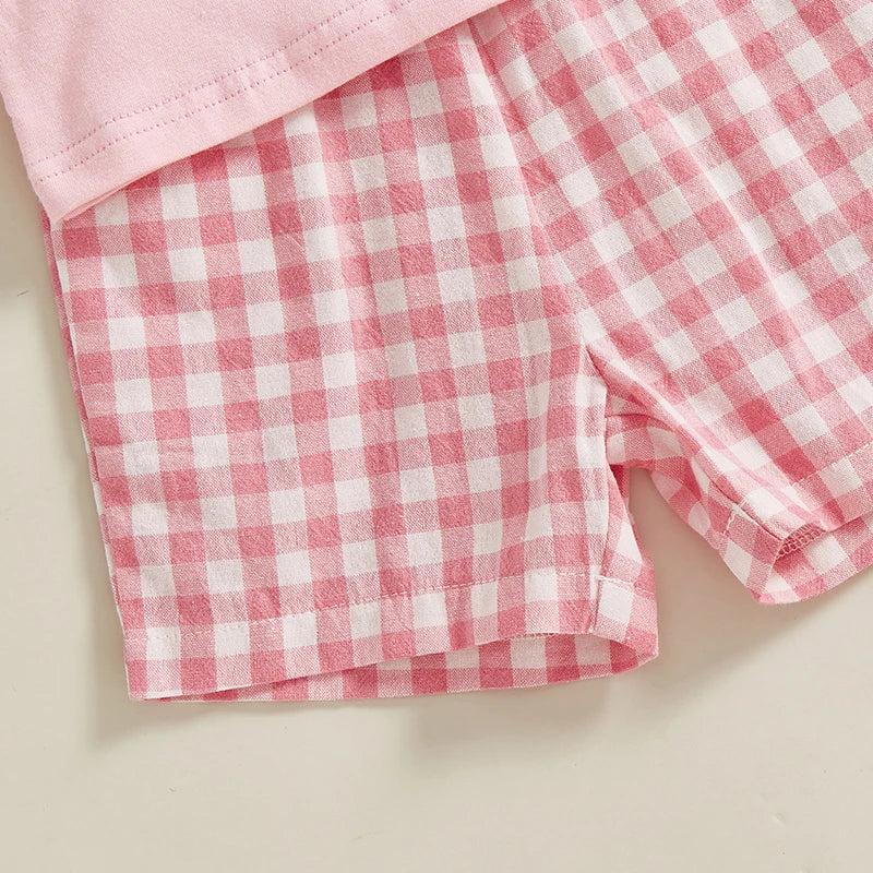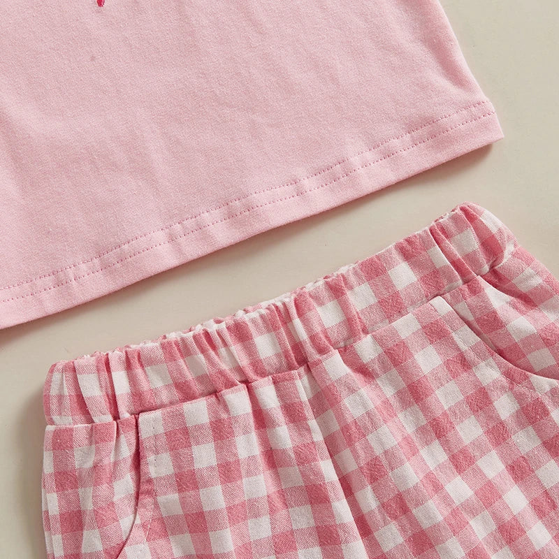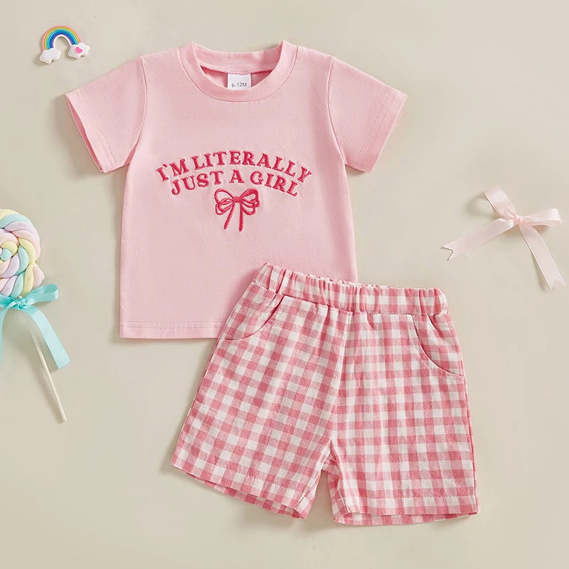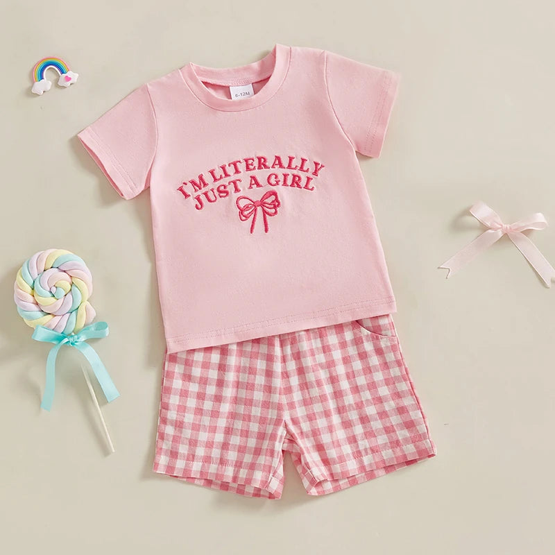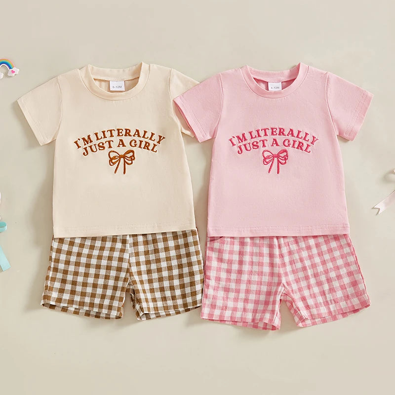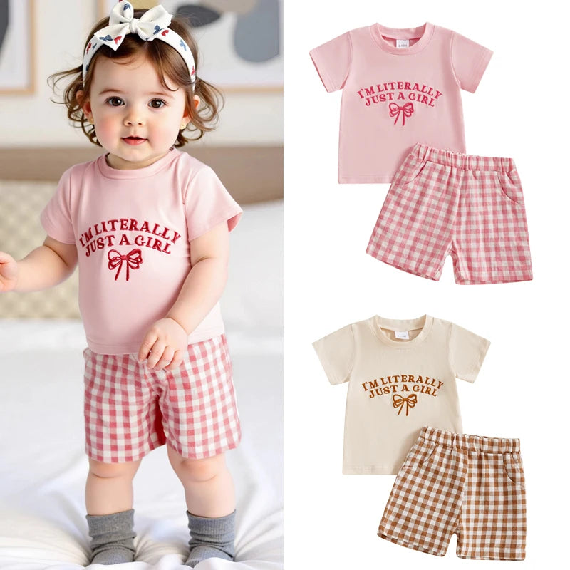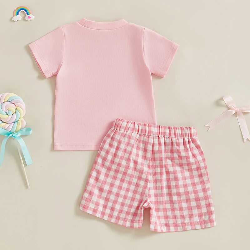 0-4Y Kids Girls Summer Clothes Sets 2pcs Outfits Short Sleeve Letter Bow Embroidery T Shirts Plaid Shorts Sets