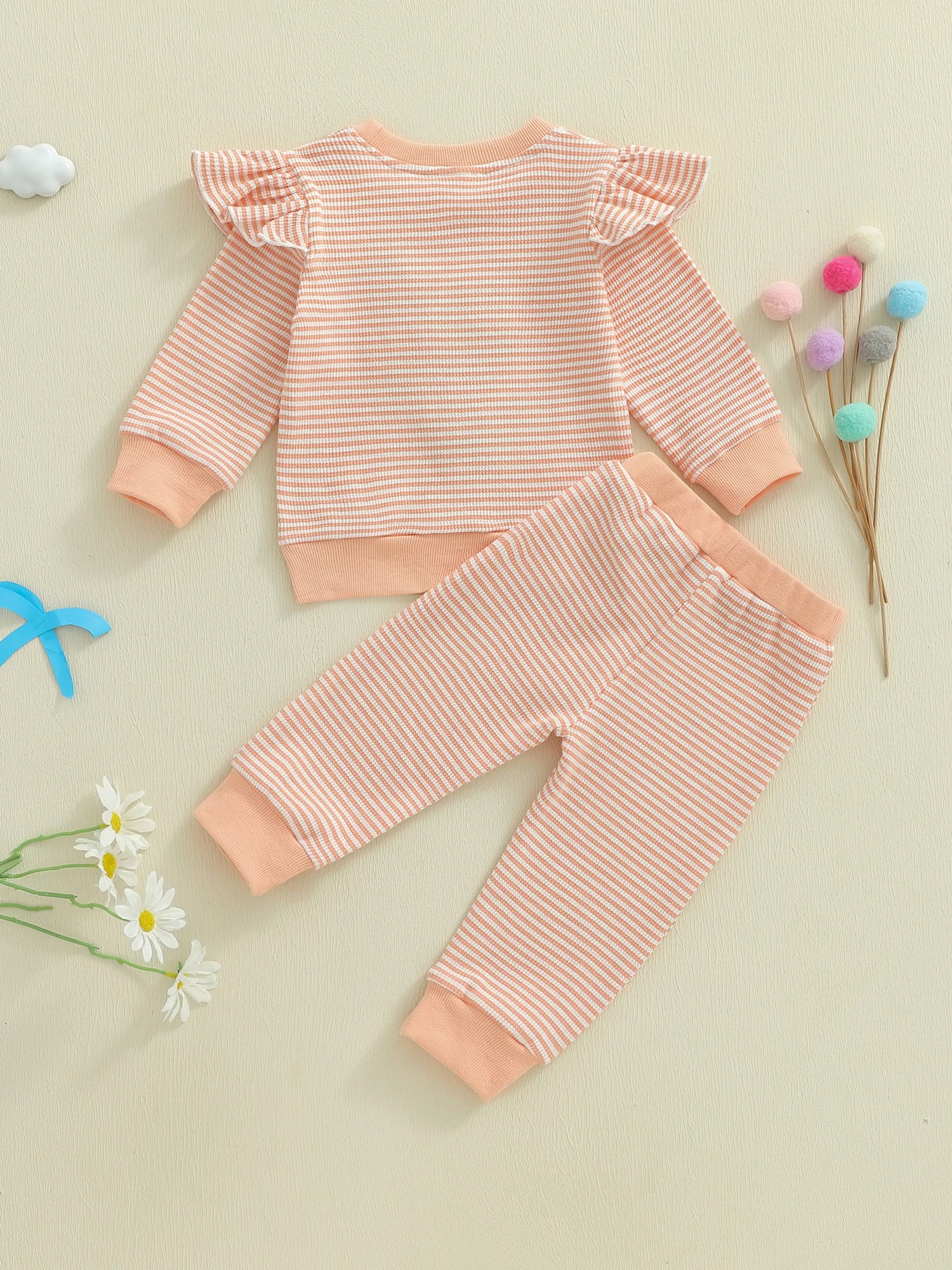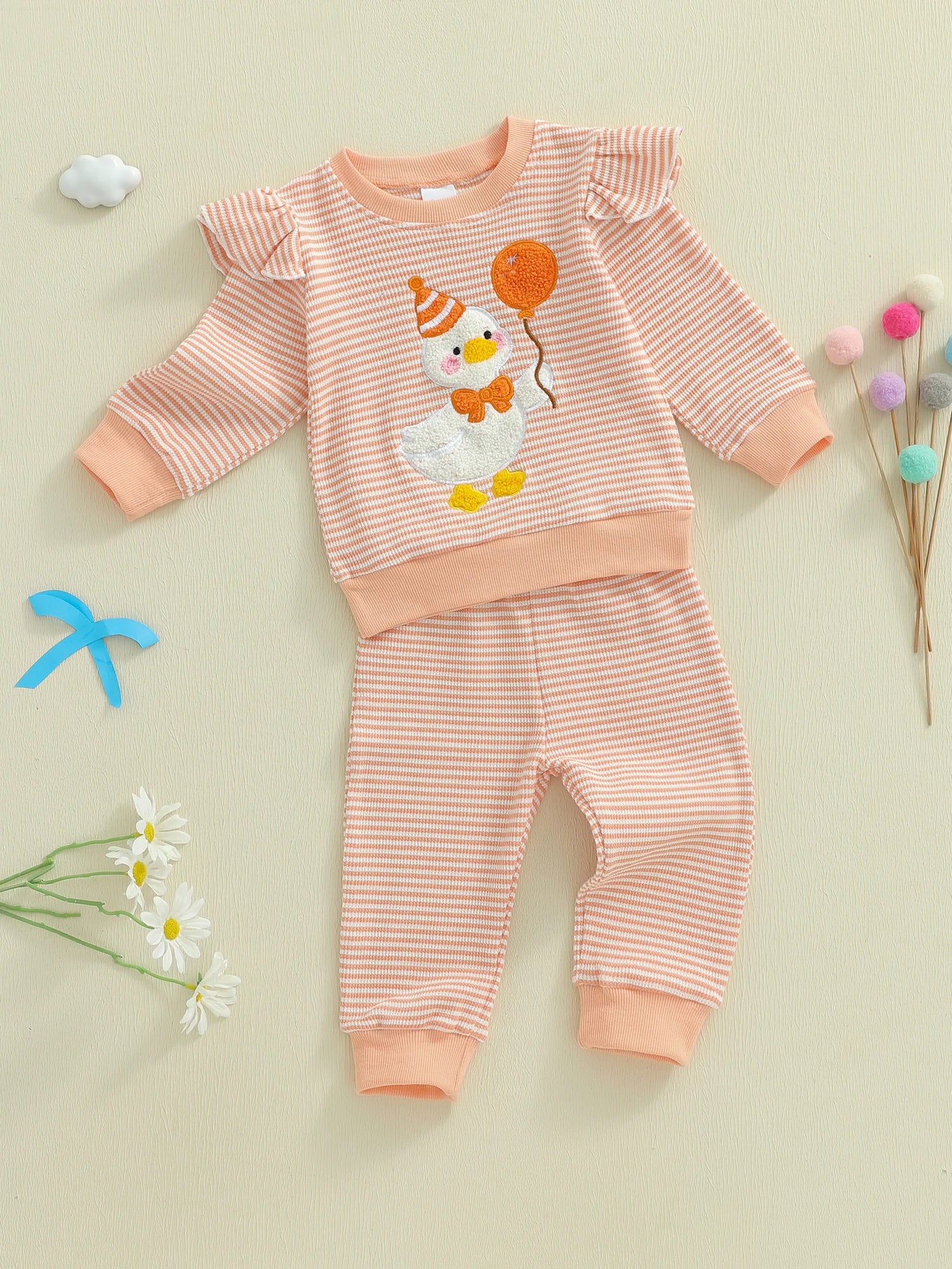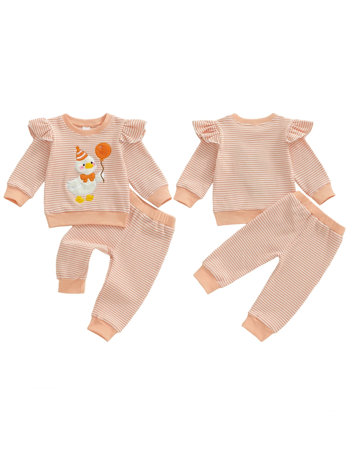 This charming two-piece outfit set features delightful goose embroidery on striped long sleeve tops paired with coordinating pants. Perfect for autumn and winter, this cosy ensemble keeps your little one warm and stylish throughout the cooler months.