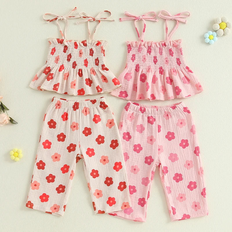 0-4Y Kids Girls Clothes Set Flower Print Sleeveless Lace Up Pleated Camisole with Trousers 2pcs Set