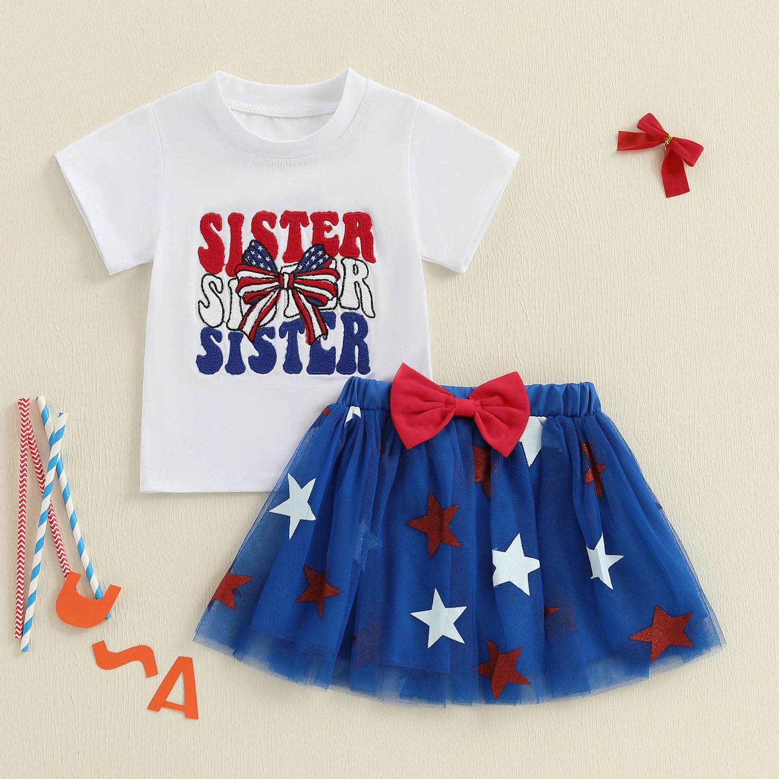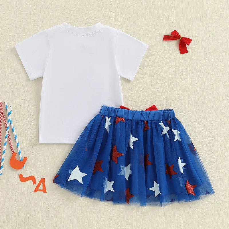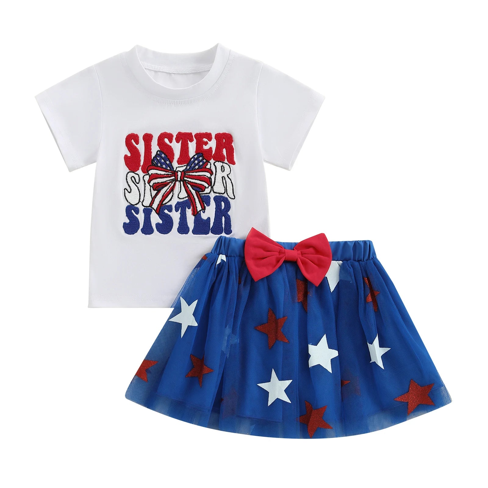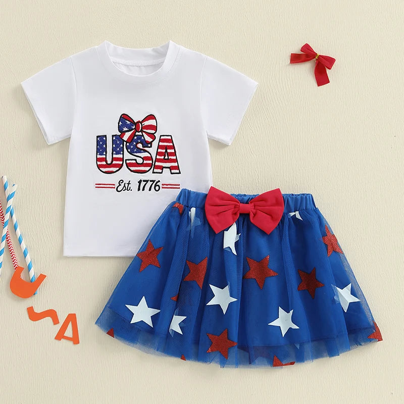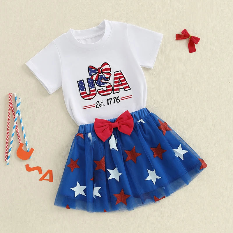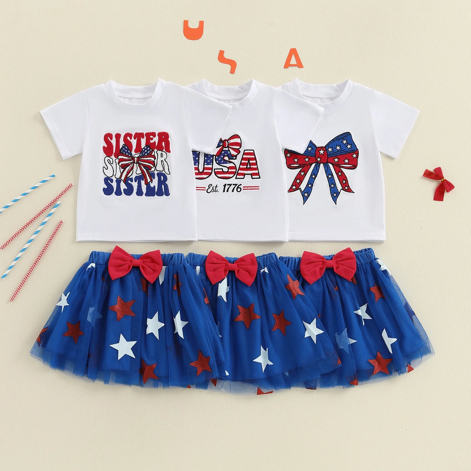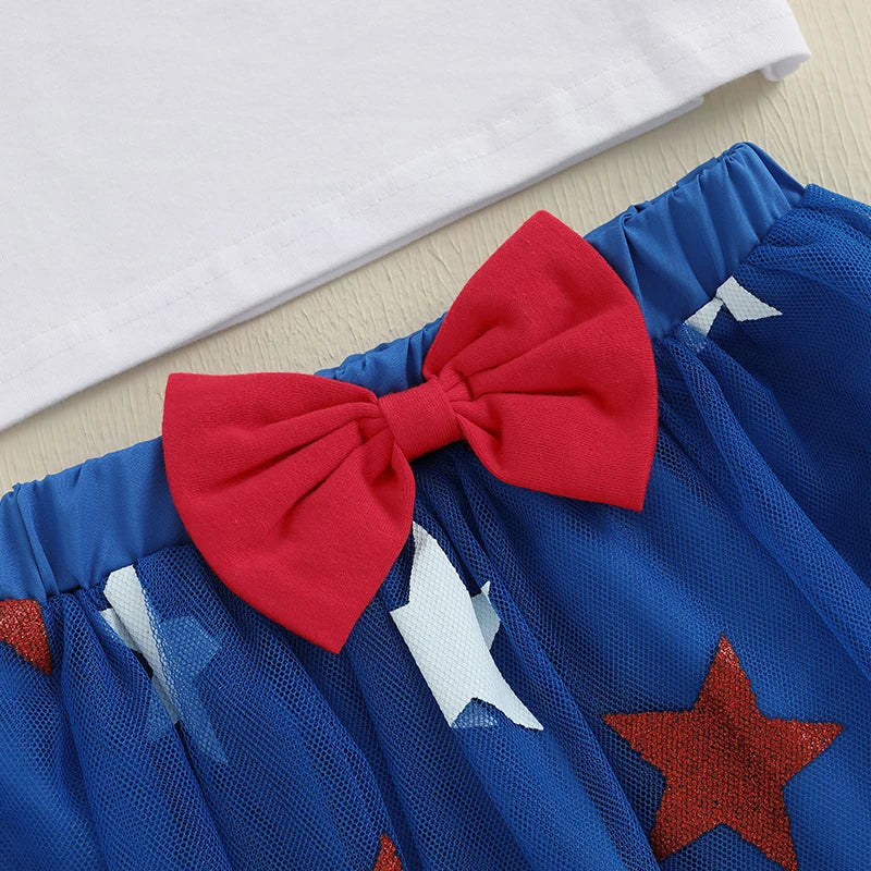 0-4Y Summer Kids Girls USA Clothes Set Short Sleeve Letter Bow Embroidery T Shirts Star Tulle Skirt