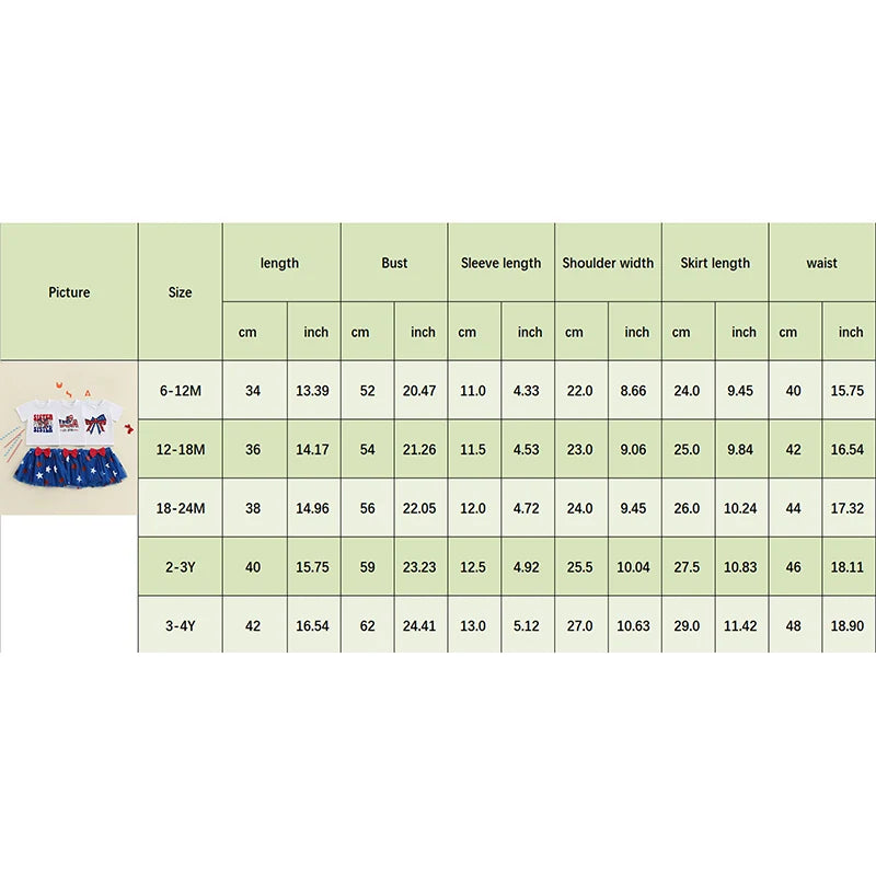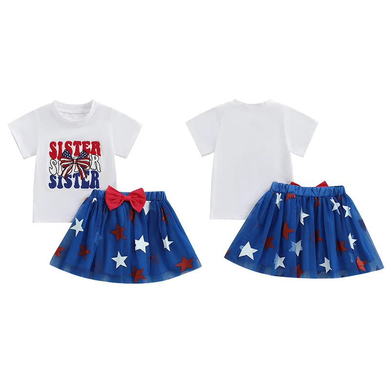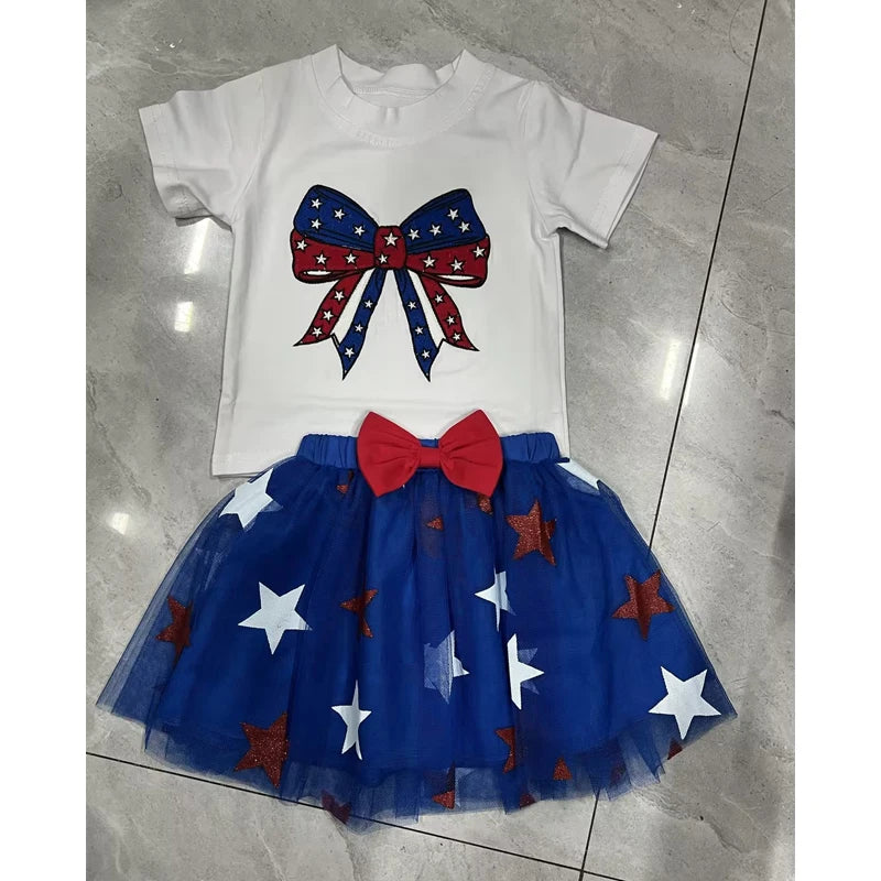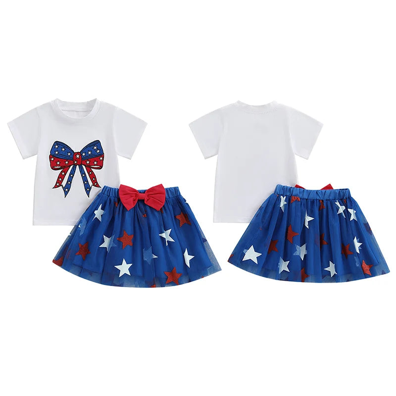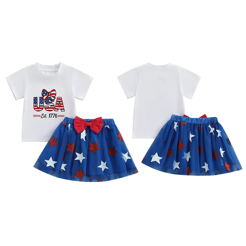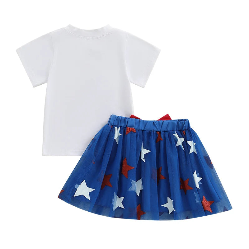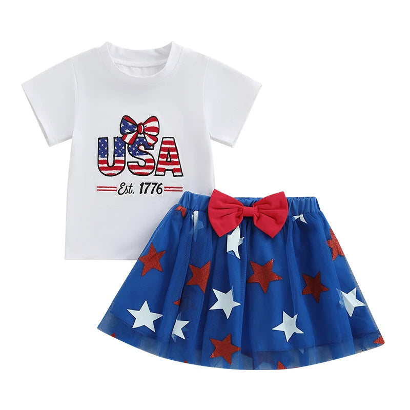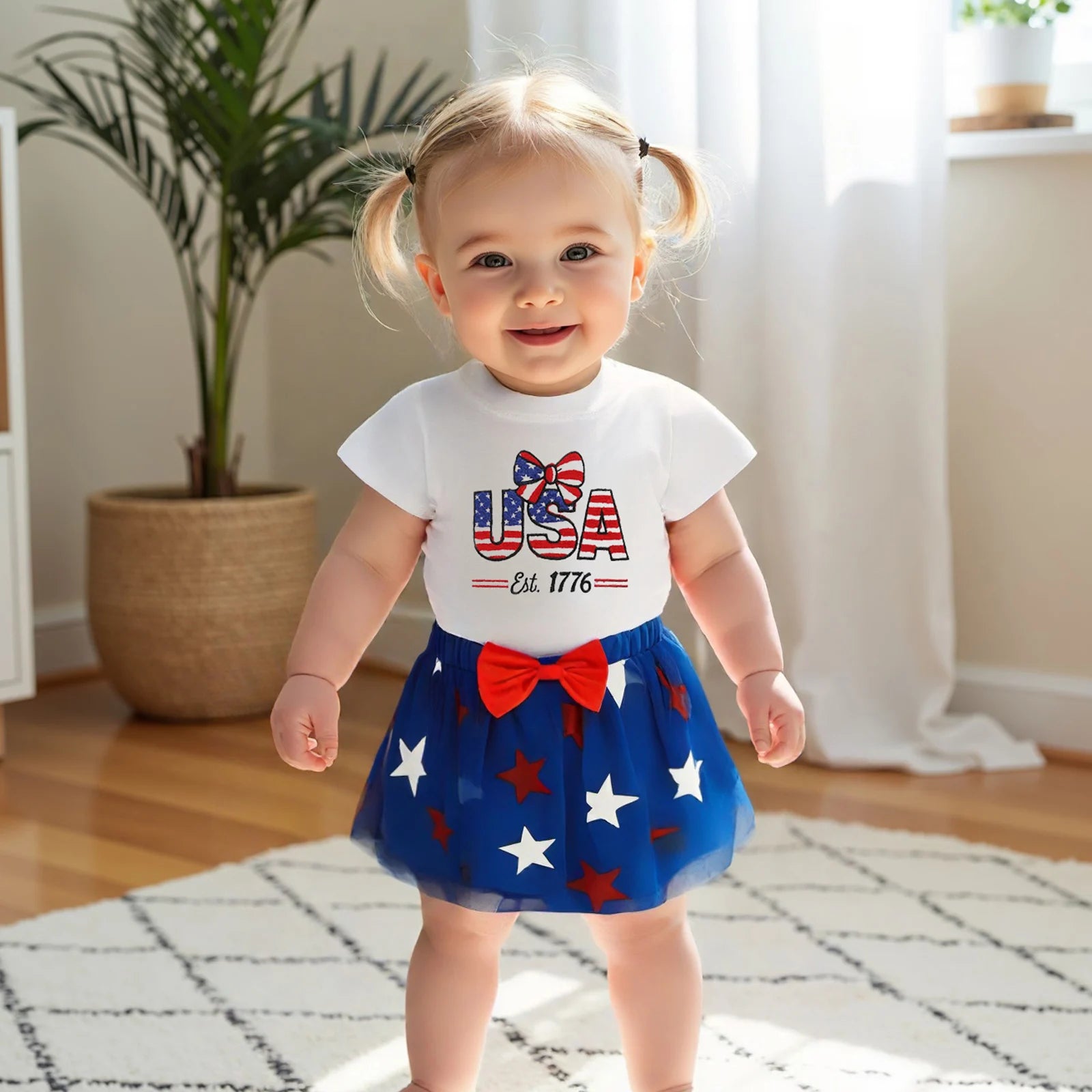 0-4Y Summer Kids Girls USA Clothes Set Short Sleeve Letter Bow Embroidery T Shirts Star Tulle Skirt