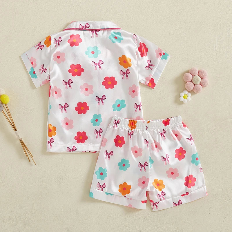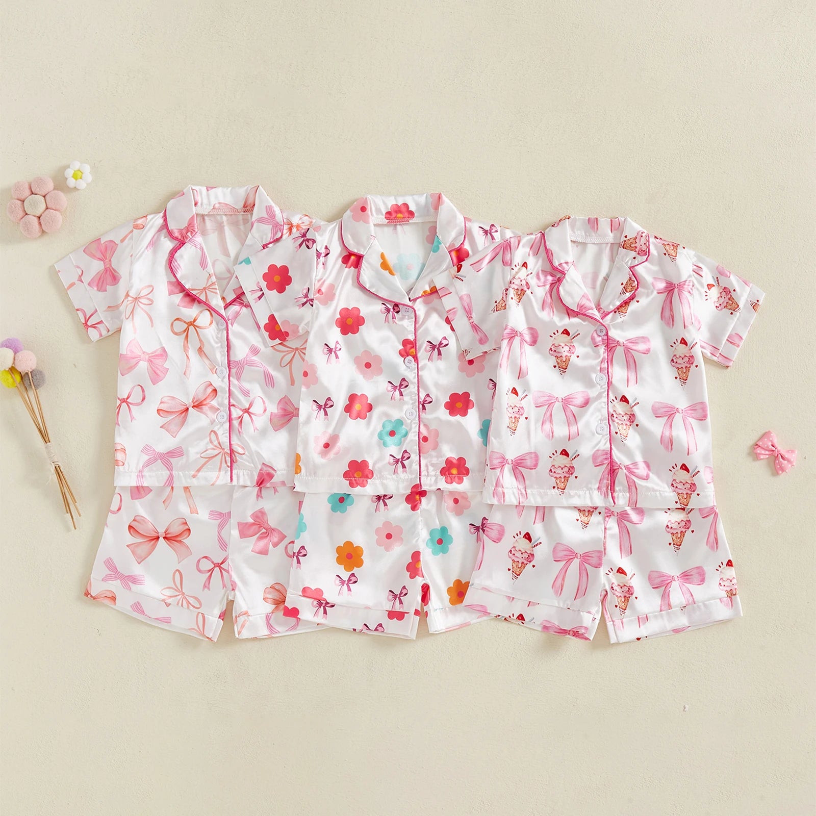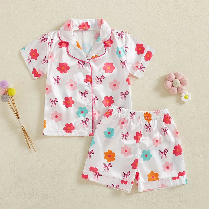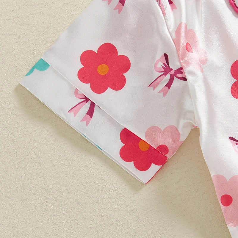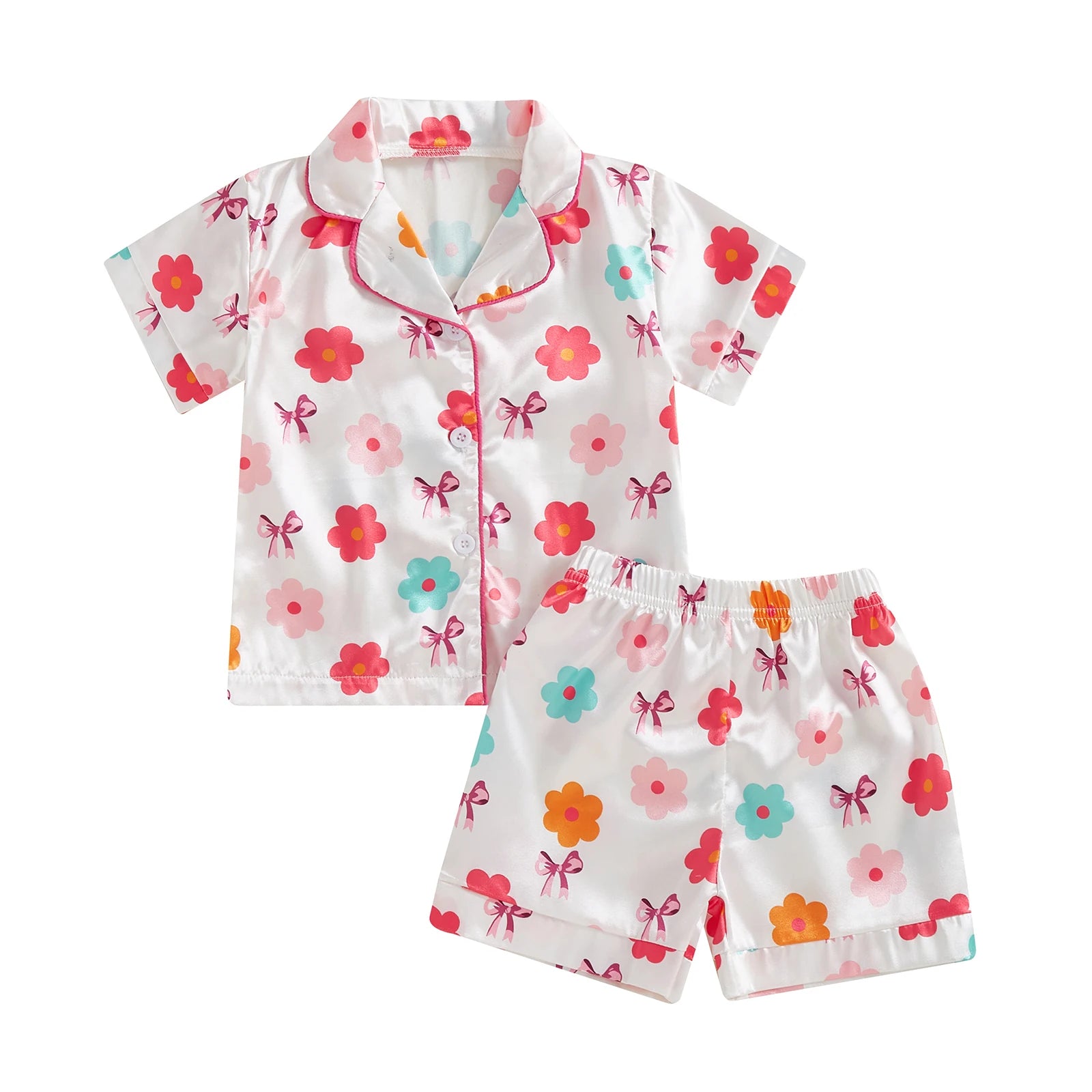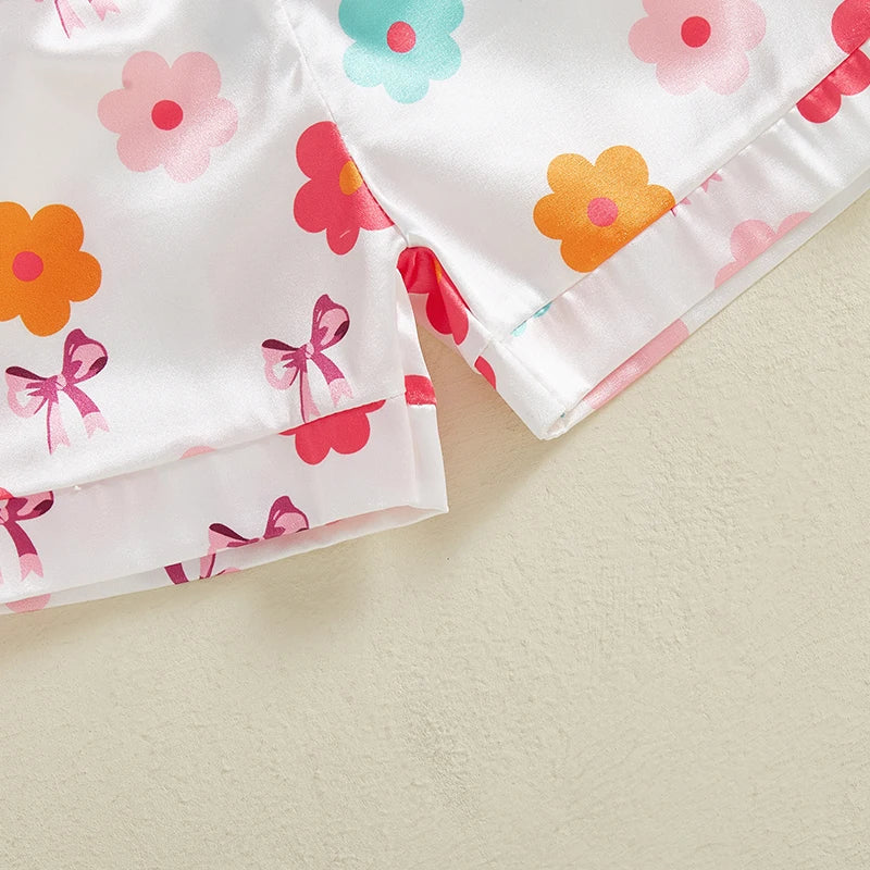 0-4Y Summer Kids Girls Summer Pyjamas Clothes Sets 2pcs Flower Bow Print Single Breasted Shirts and Shorts