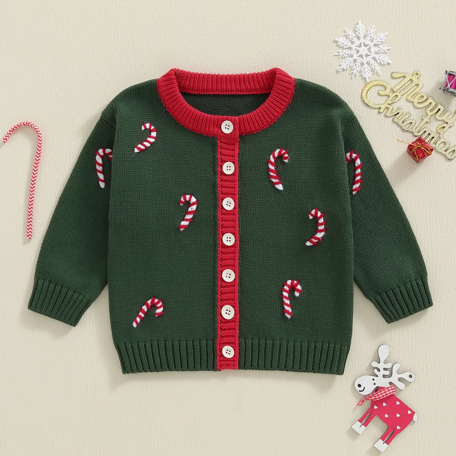 Toddler Baby Christmas Cardigan Sweater - Long Sleeve Button Down Candy Cane Embroidery