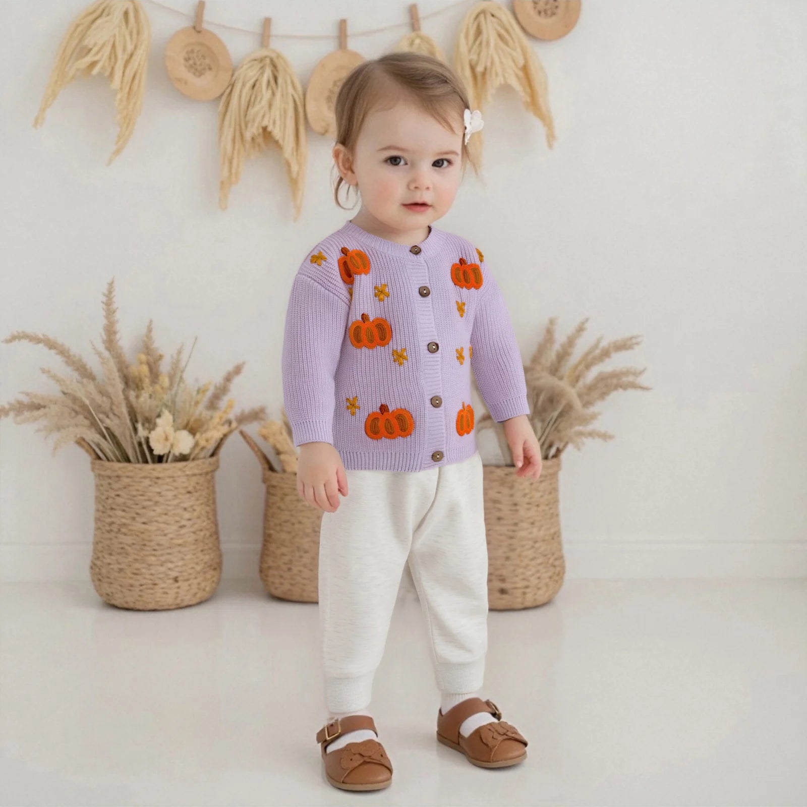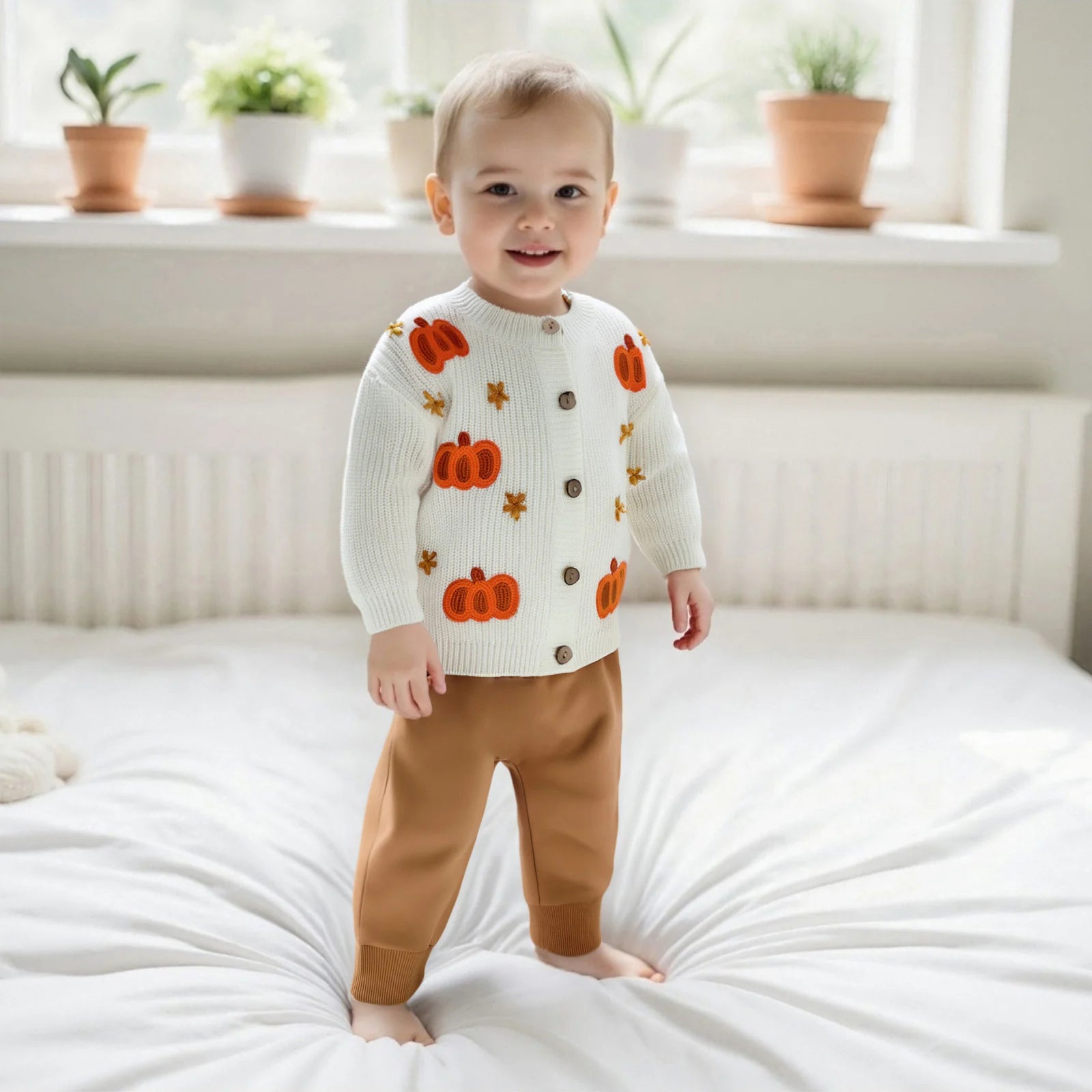 Get your little one ready for Halloween in style with this charming knit cardigan. Featuring delightful pumpkin embroidery and classic button-front design, this cosy sweater is perfect for autumn days, Halloween celebrations, and everyday wear throughout the season.