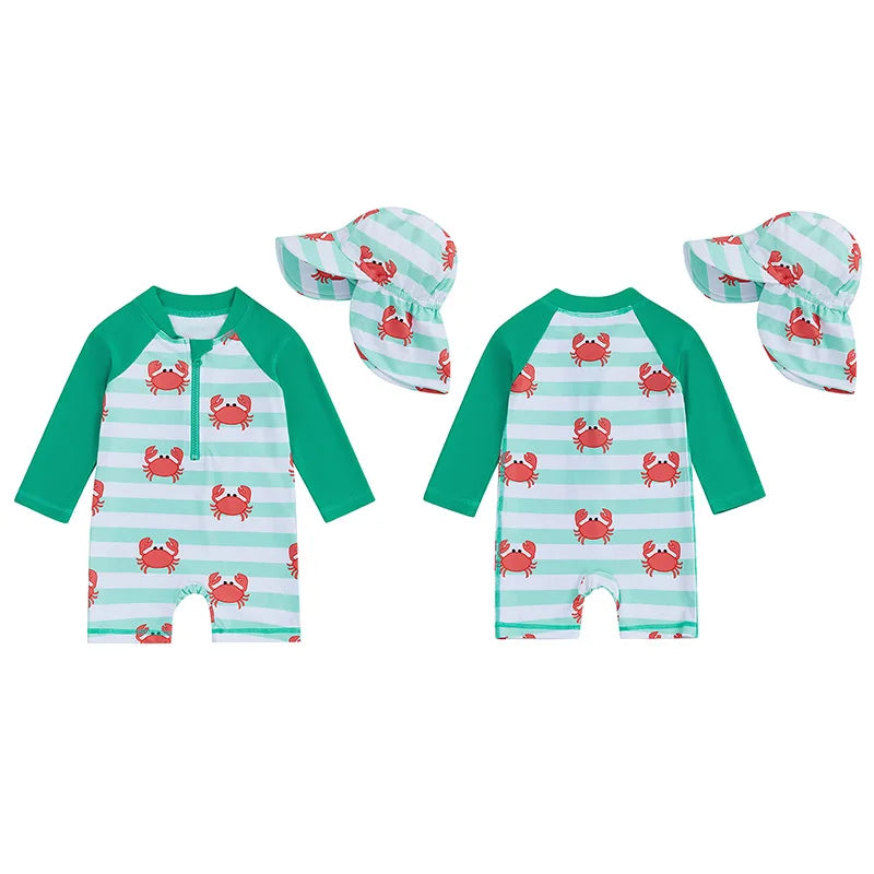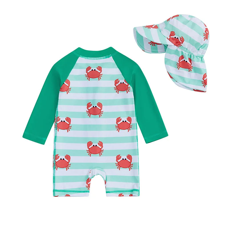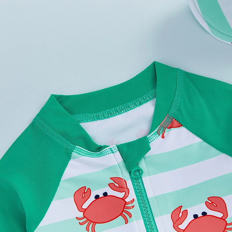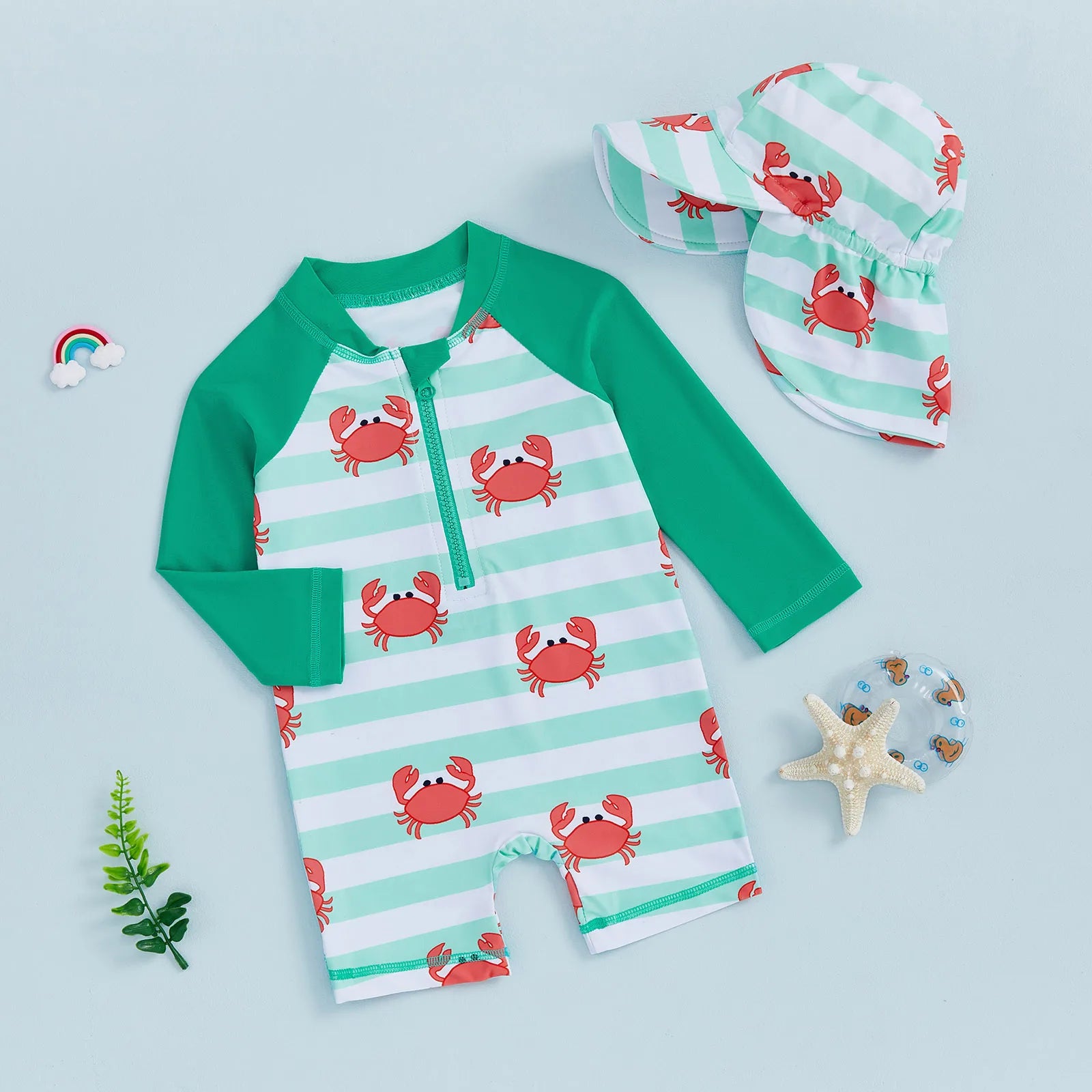 0-4Y Toddler Kids Boys Swimwear Summer Crab Stripe Print Zipper Rash Guard Swimsuit and Hat Beachwear