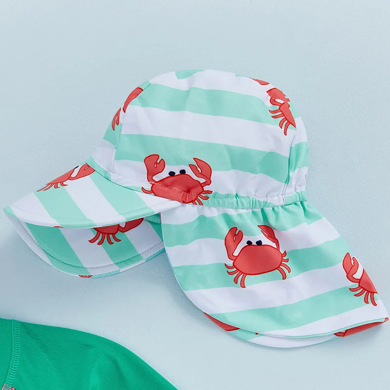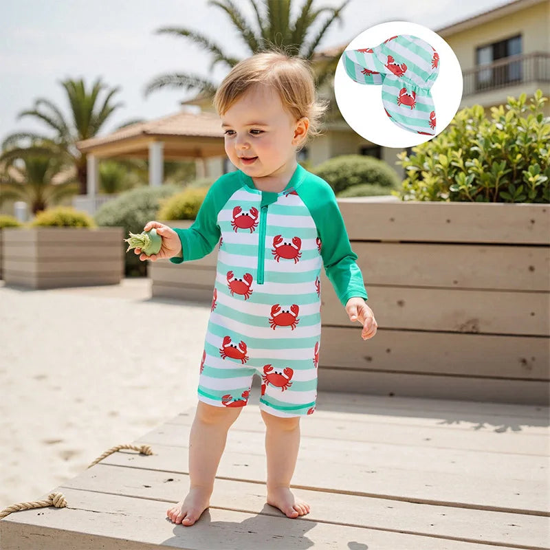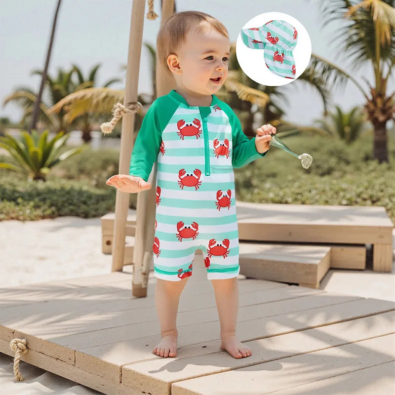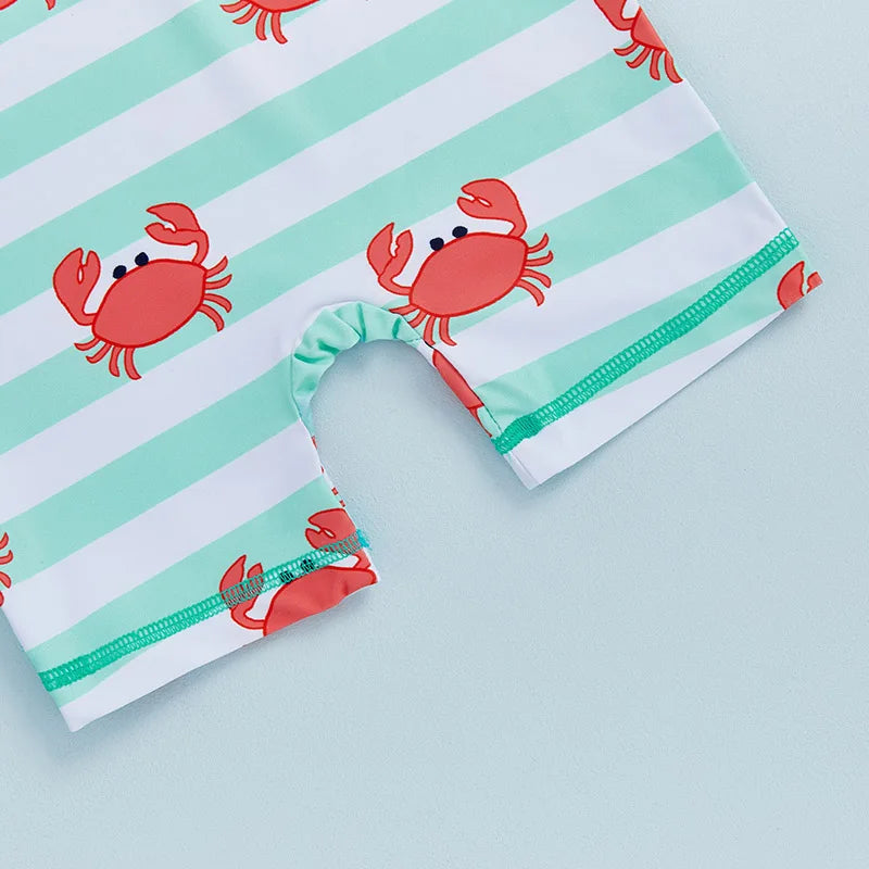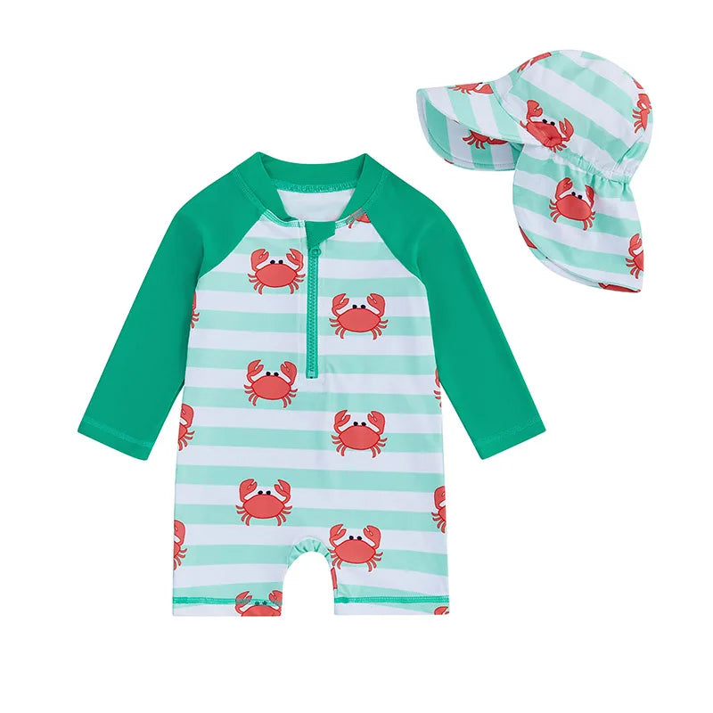 0-4Y Toddler Kids Boys Swimwear Summer Crab Stripe Print Zipper Rash Guard Swimsuit and Hat Beachwear
