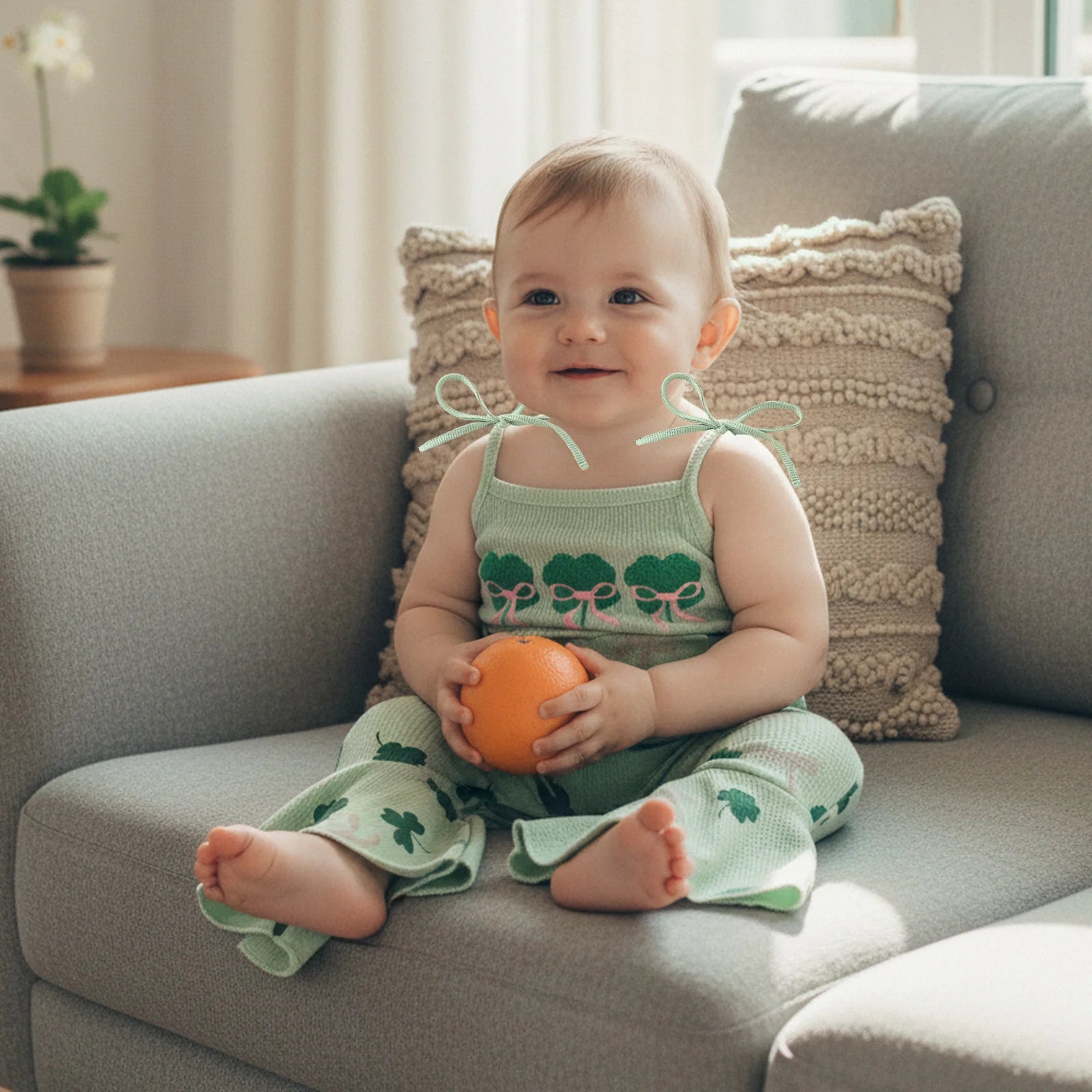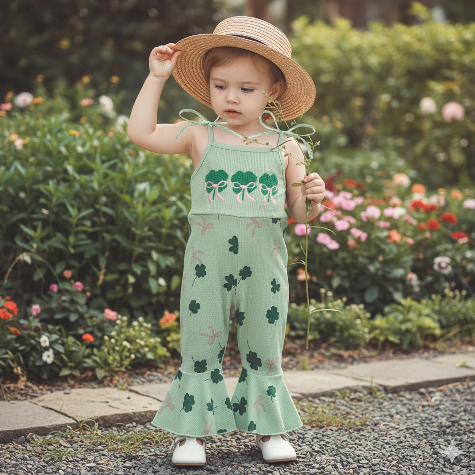 Celebrate Irish heritage and style with this charming overalls jumpsuit featuring adorable four-leaf clover and bow patterns. The sleeveless design with trendy bell bottom flare pants creates a playful, festive look perfect for St. Patrick's Day and beyond.