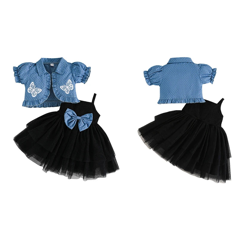 0-4Y Toddler Little Girls Summer Clothes Sets Butterfly Print Short Puff Sleeve Cardigan Tulle Strap Bow A Line Dress