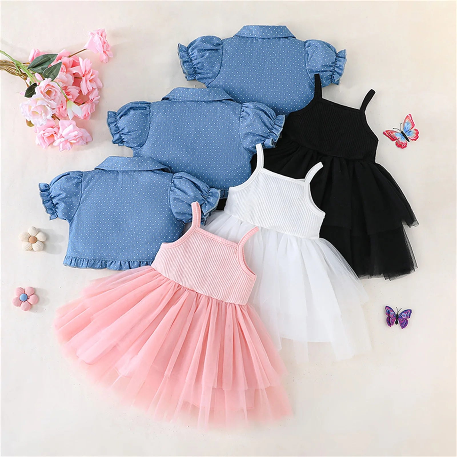 Toddler Girl Summer Outfits Tulle Spaghetti Strap Bow A Line Dress with Dot Butterfly Print Short Puff Sleeve Cardigan
