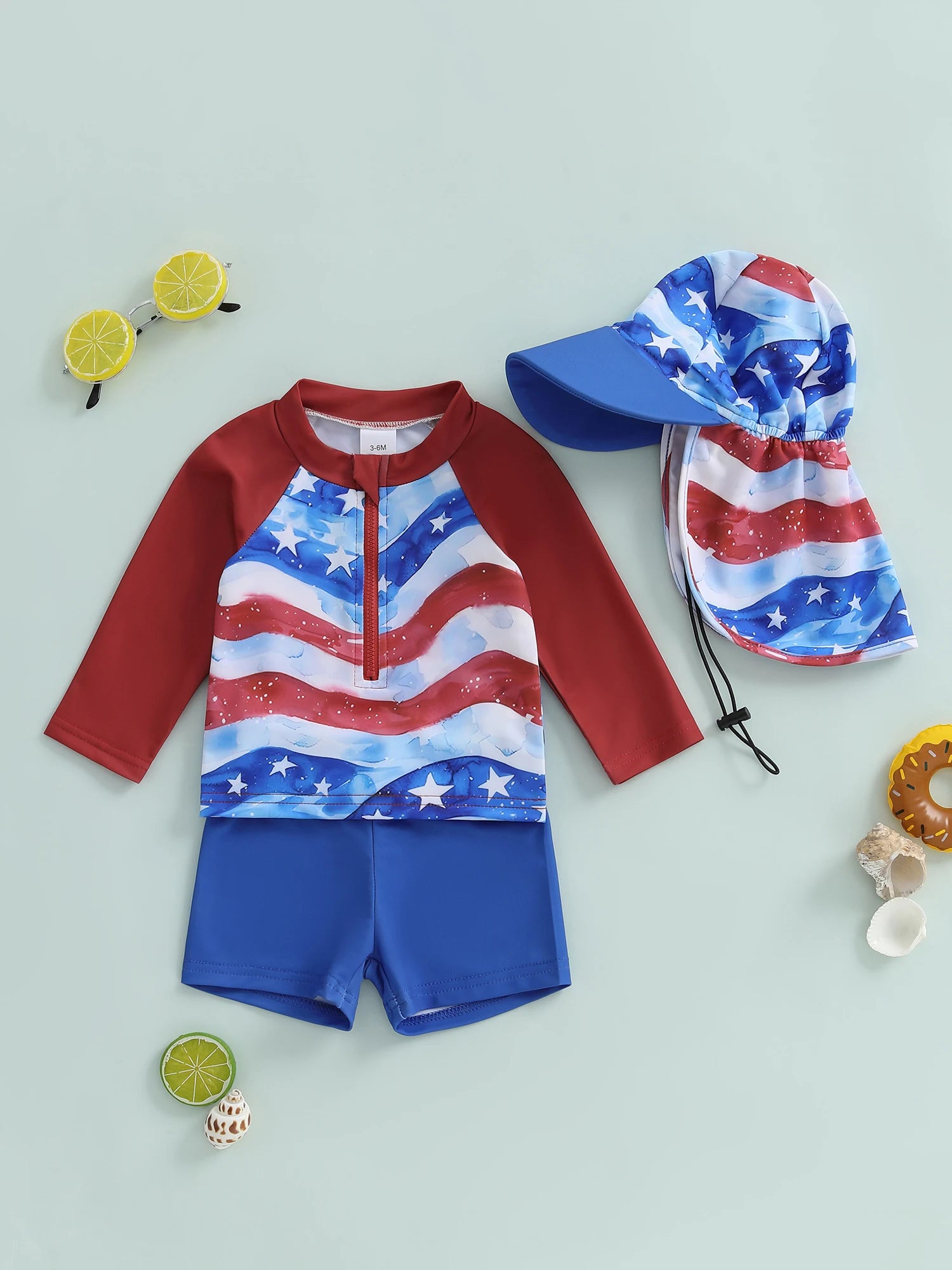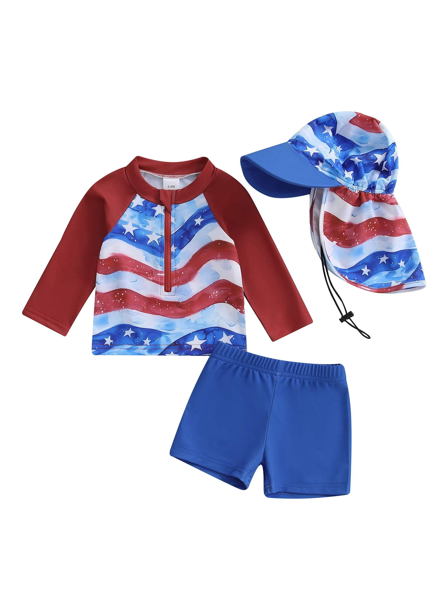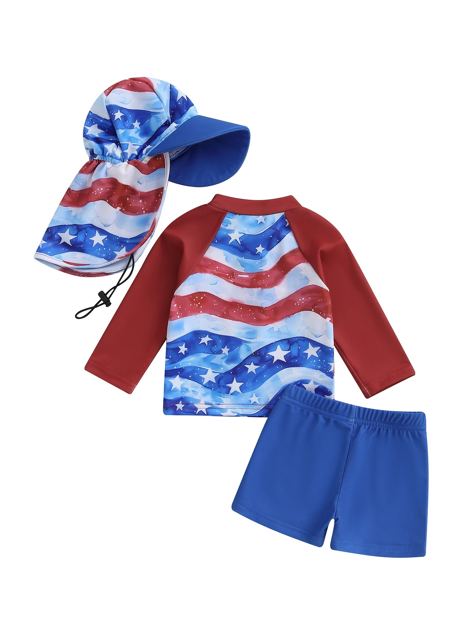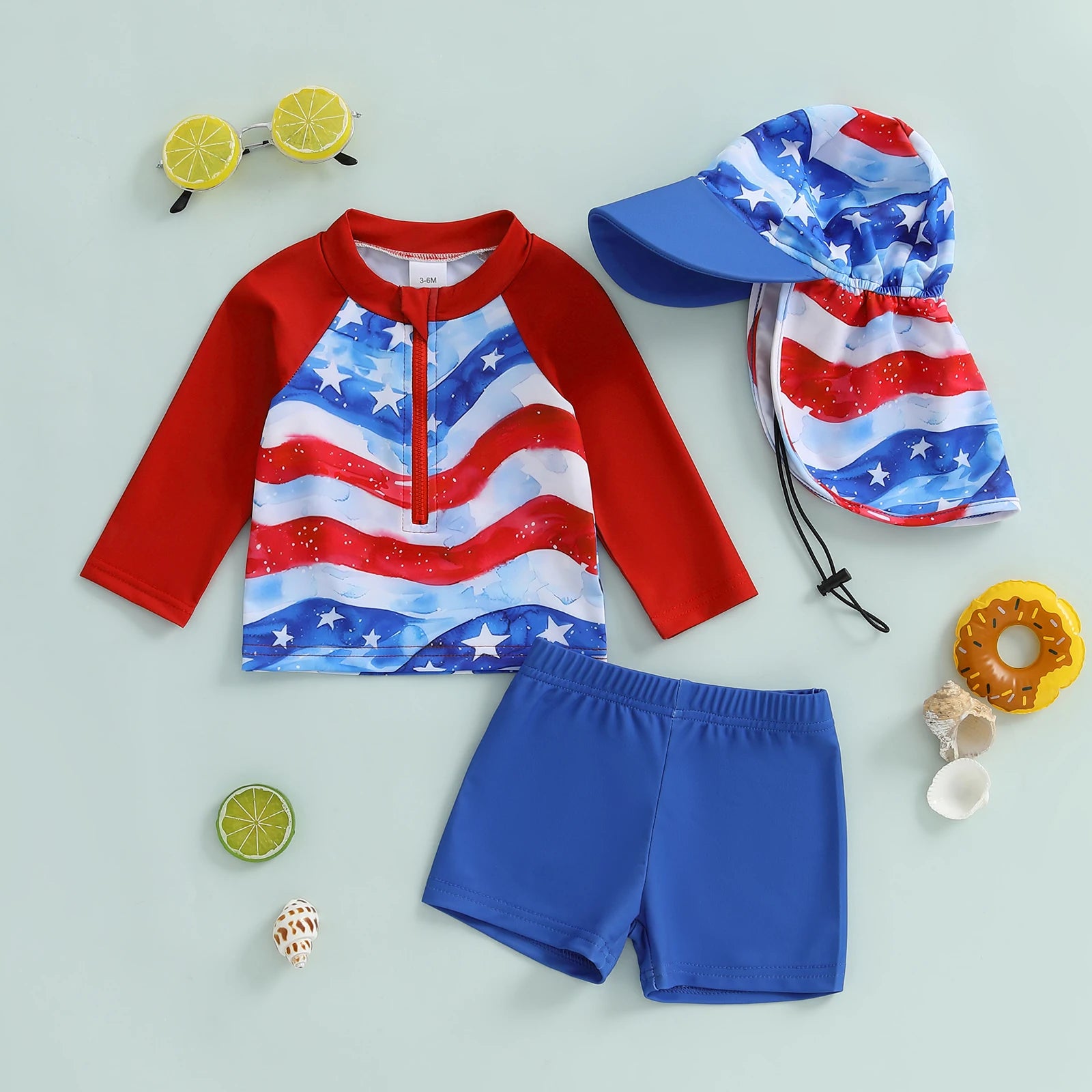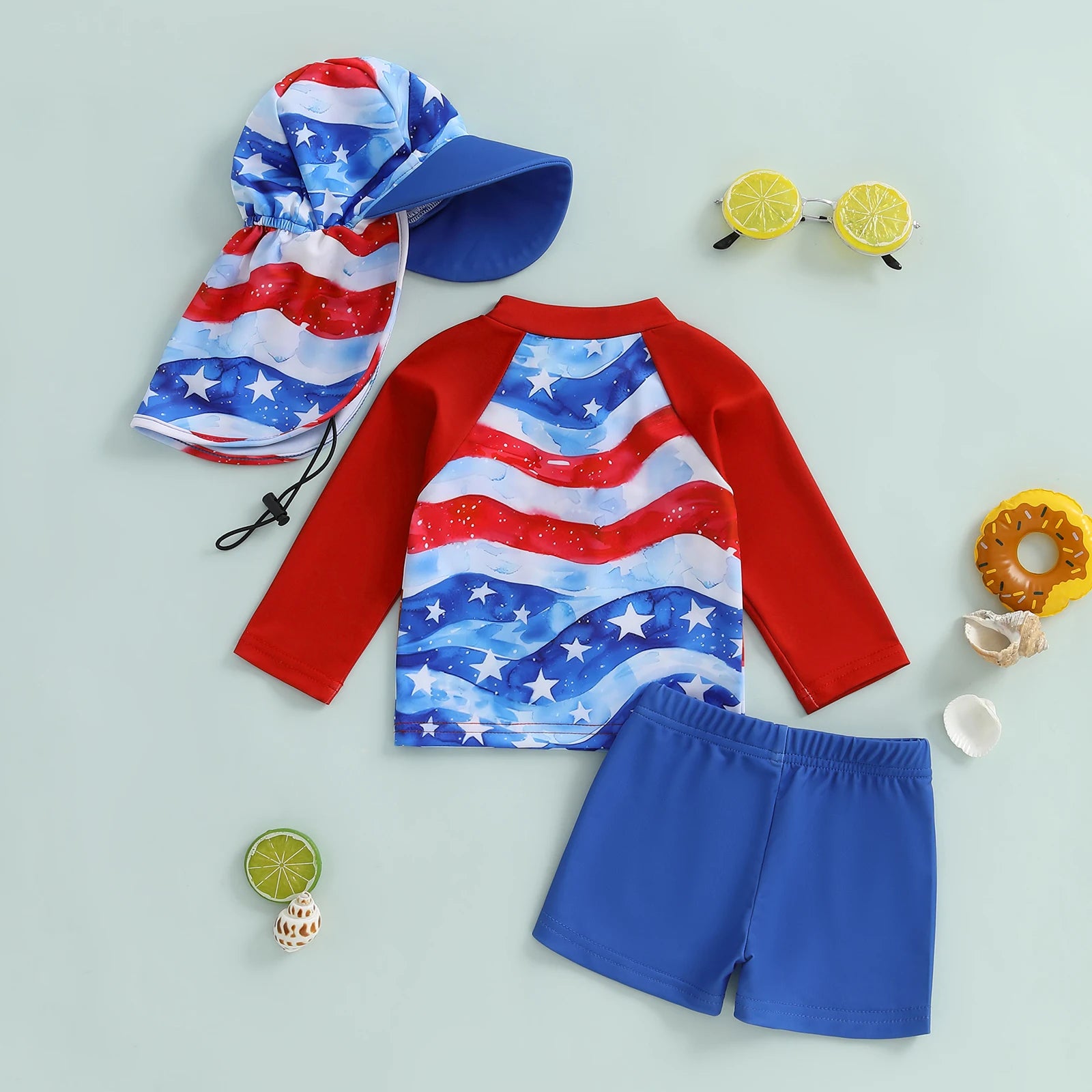 0-5Y American Flag Kids Boys 4th Swimwear Clothes Sets Long Sleeve Stars Print T-shirt with Shorts and Hat