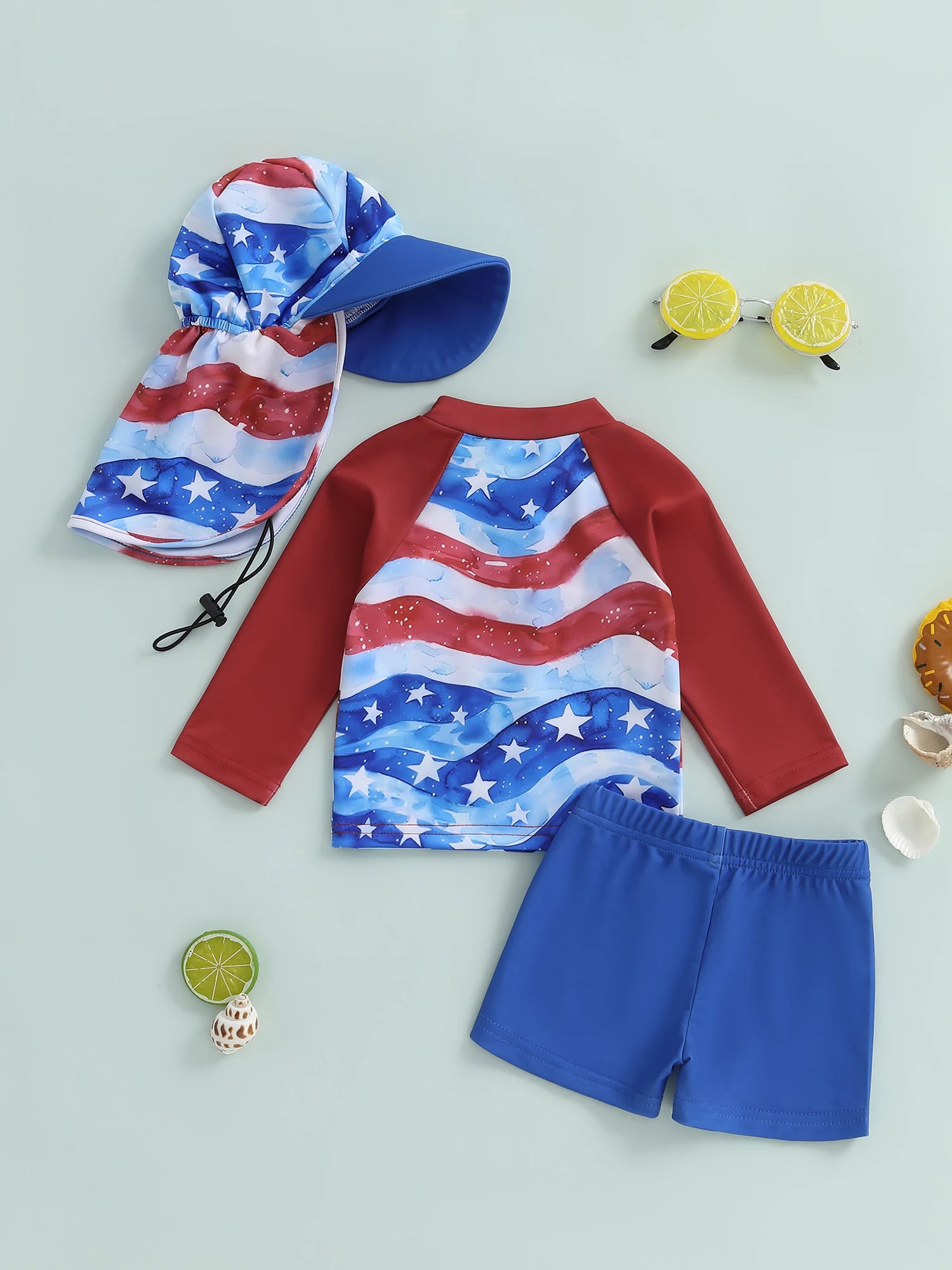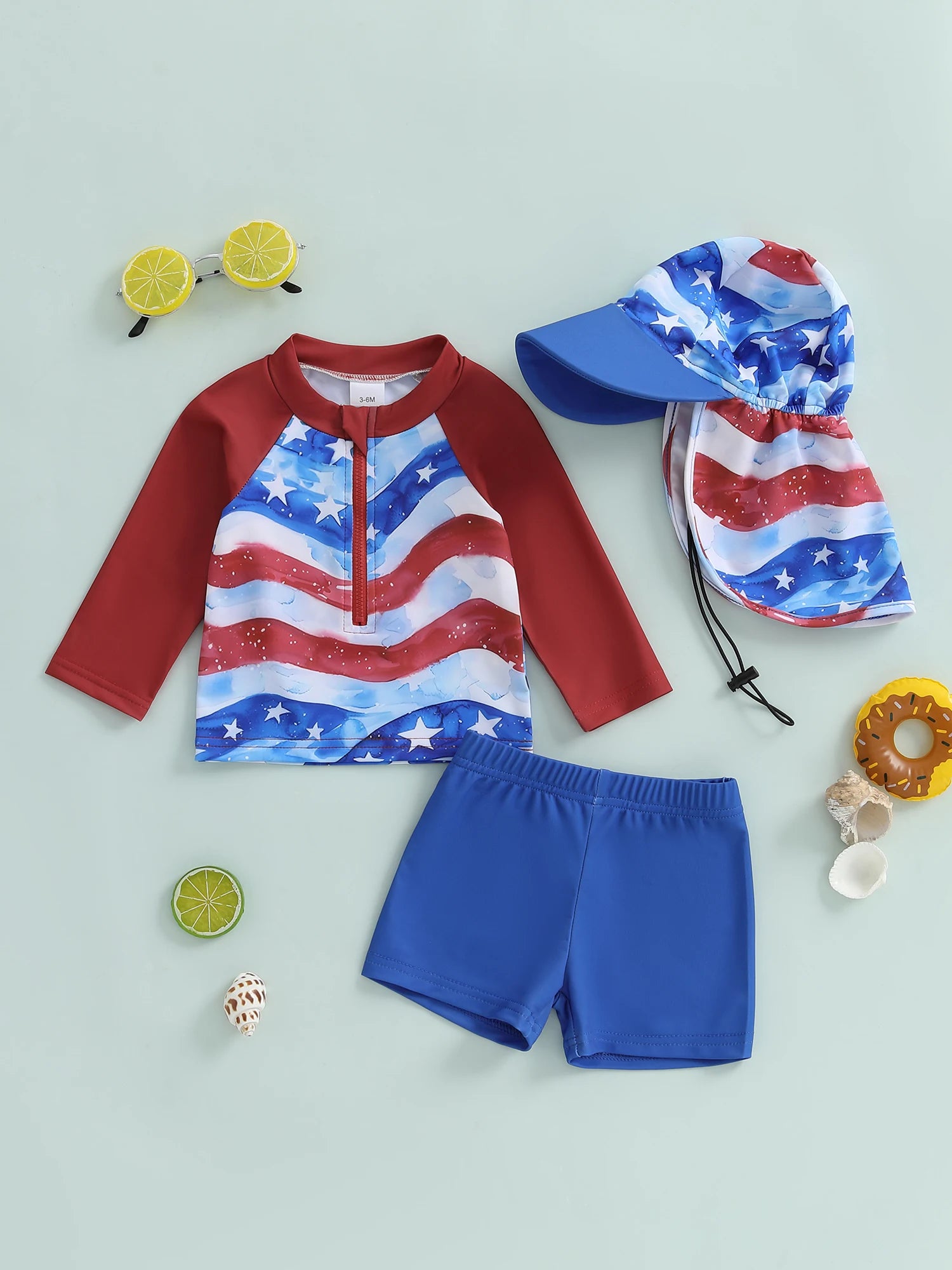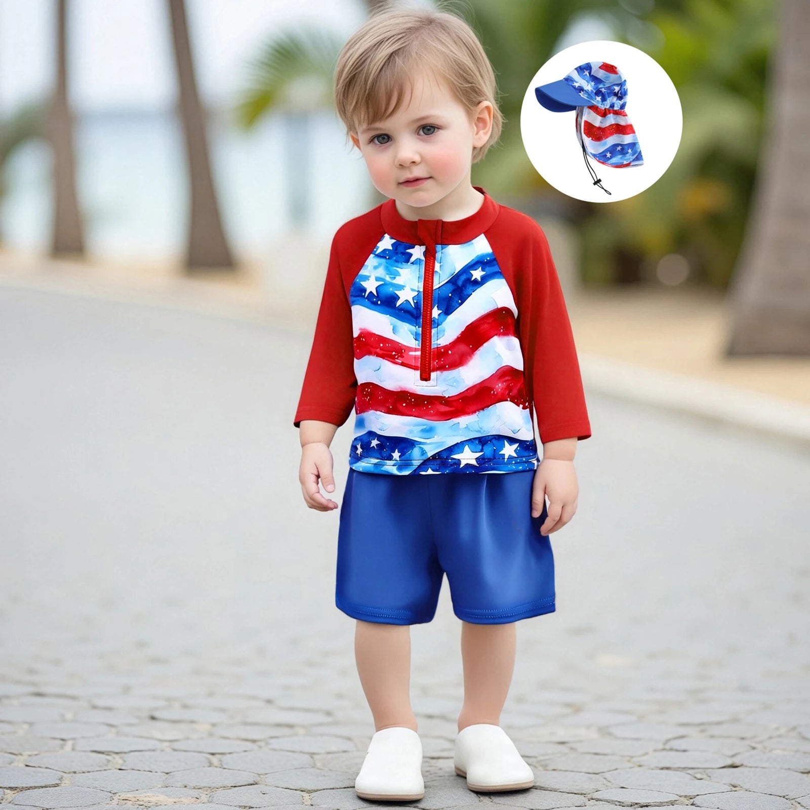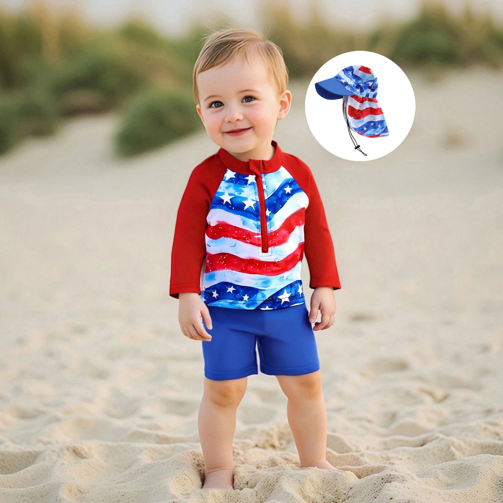 0-5Y American Flag Kids Boys 4th Swimwear Clothes Sets Long Sleeve Stars Print T-shirt with Shorts and Hat