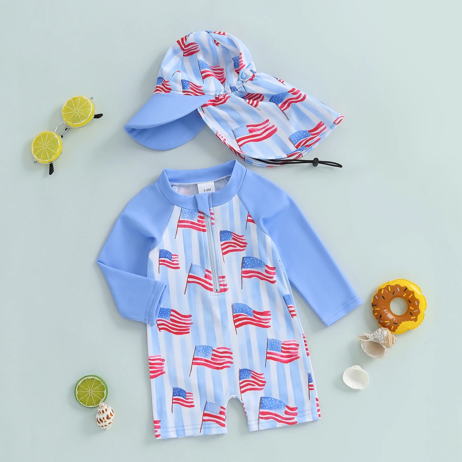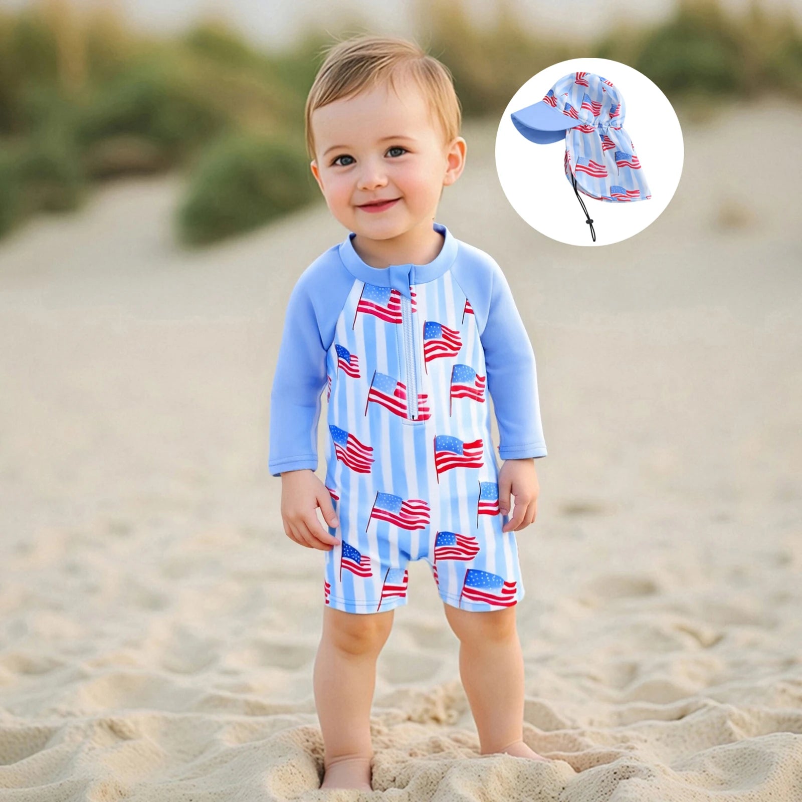 0-5Y Kids Boys Rash Guard Swimsuits Flag Print Long Sleeve Zip Up Bathing Suit with Neck Flap Sun Cap
