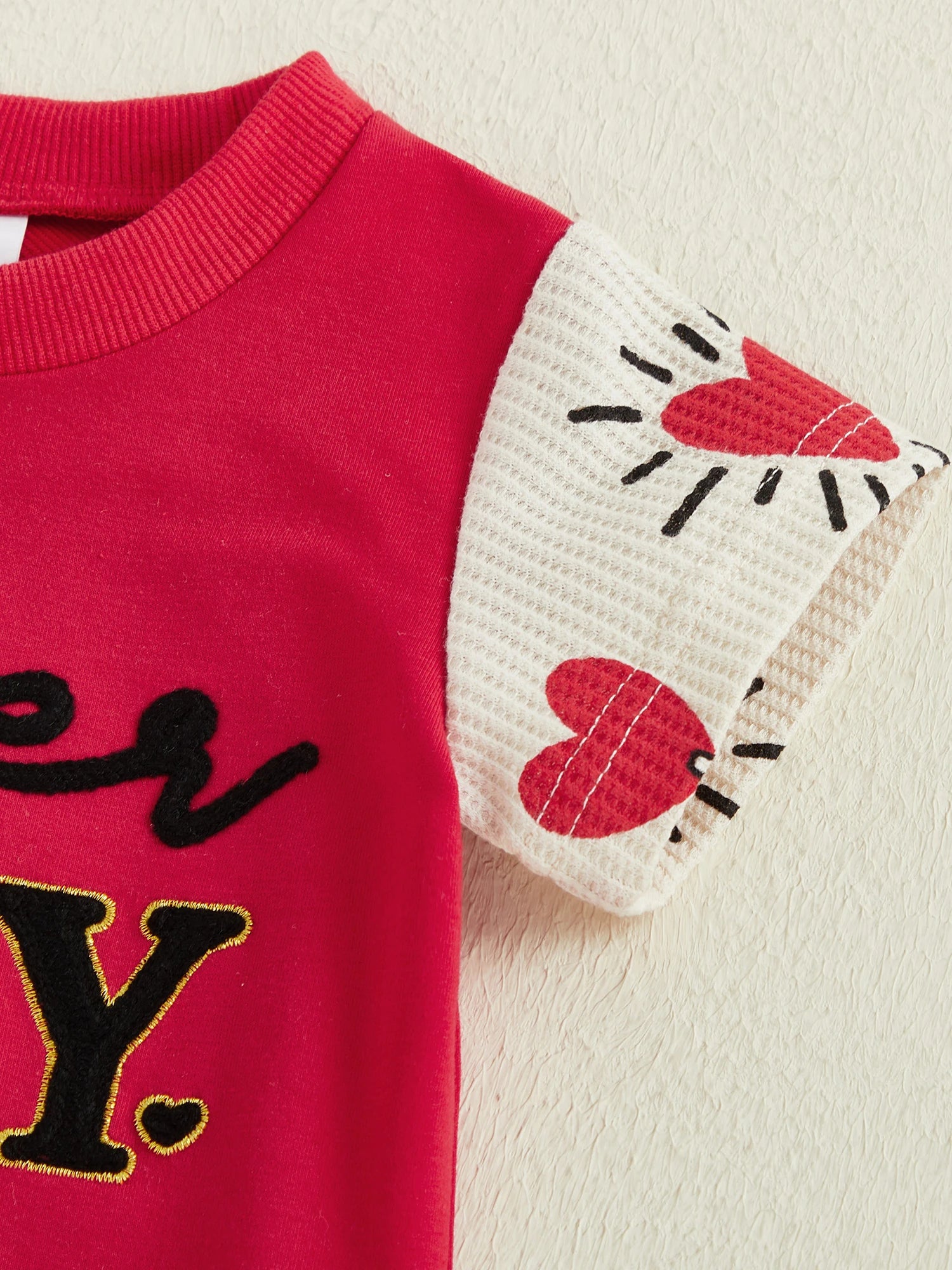Dress your little one in this charming Valentine's Day set featuring a letter embroidery t-shirt and playful candy heart shorts. Perfect for celebrating the day of love in style and comfort.