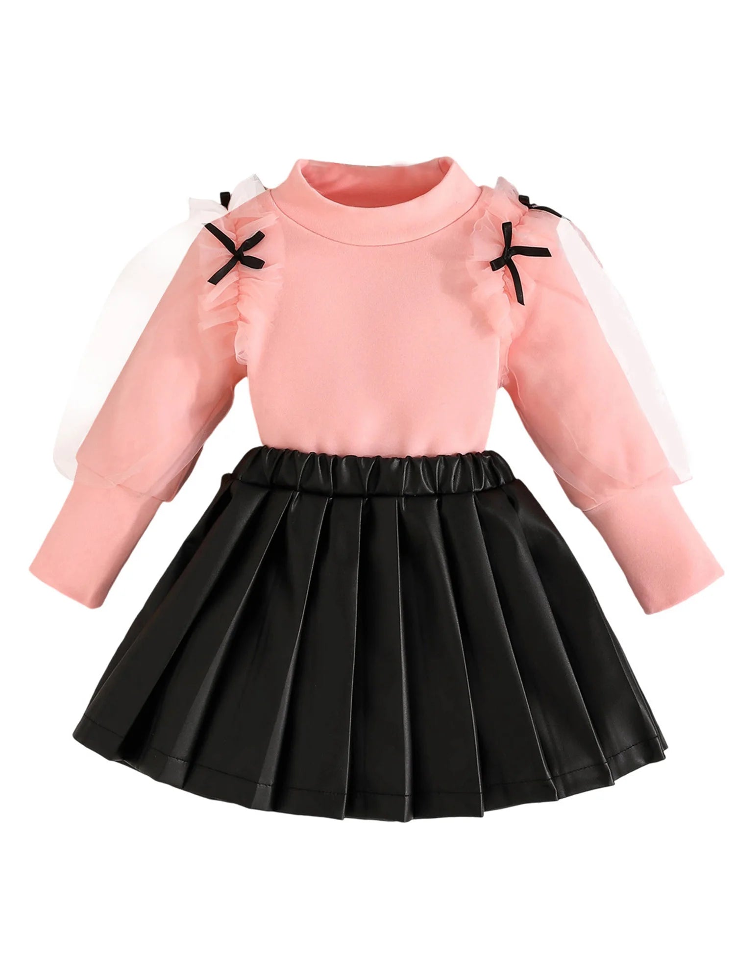 Toddler Kids Girls Fall Clothes Set - Mesh Bow Mock Neck Long Sleeve Top & Pleated Skirt