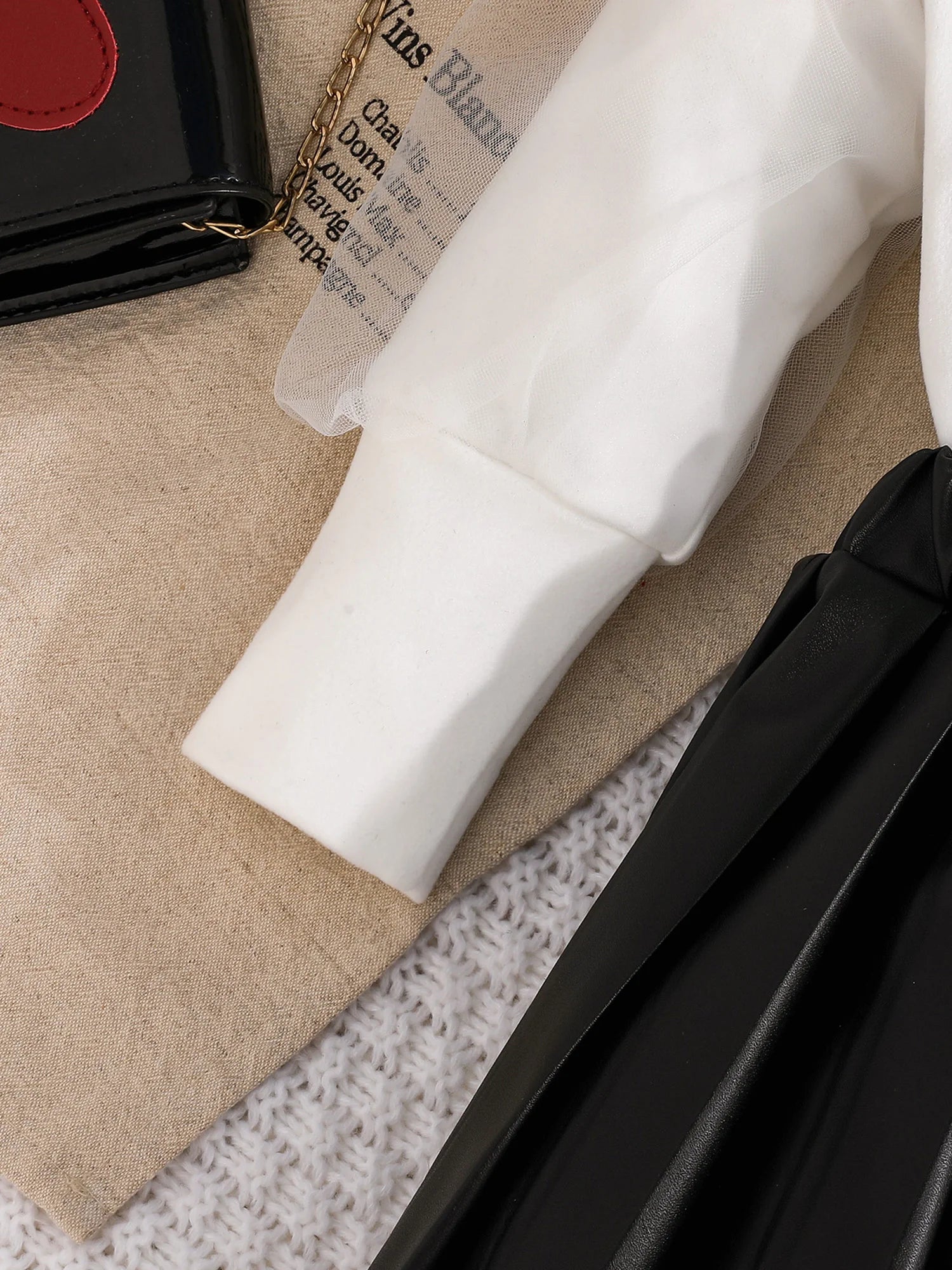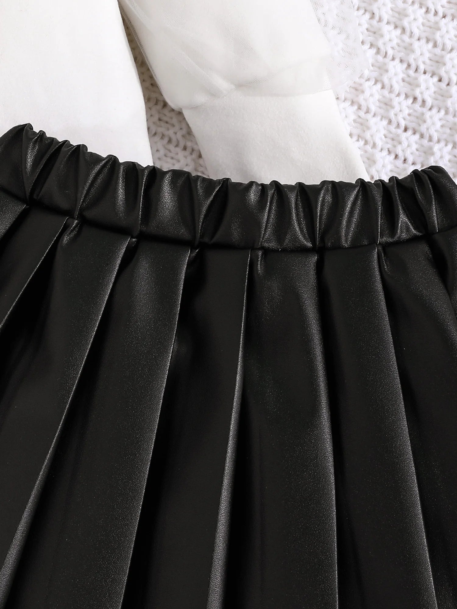Dress your little fashionista in style this autumn with this charming two-piece set. Featuring a sophisticated mock neck top with delicate mesh bow decoration and a coordinating pleated skirt, this outfit is perfect for school, parties, and special occasions.