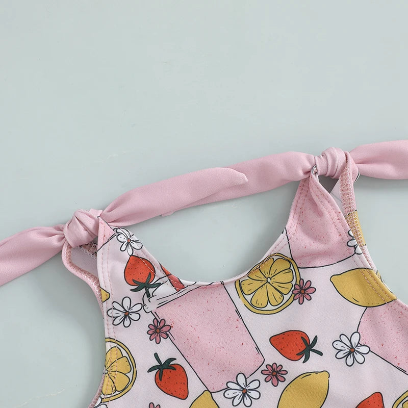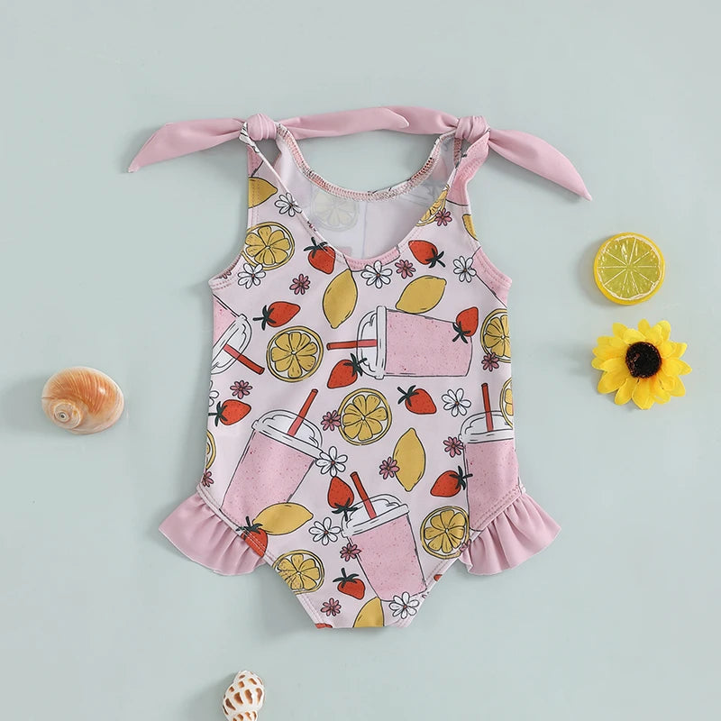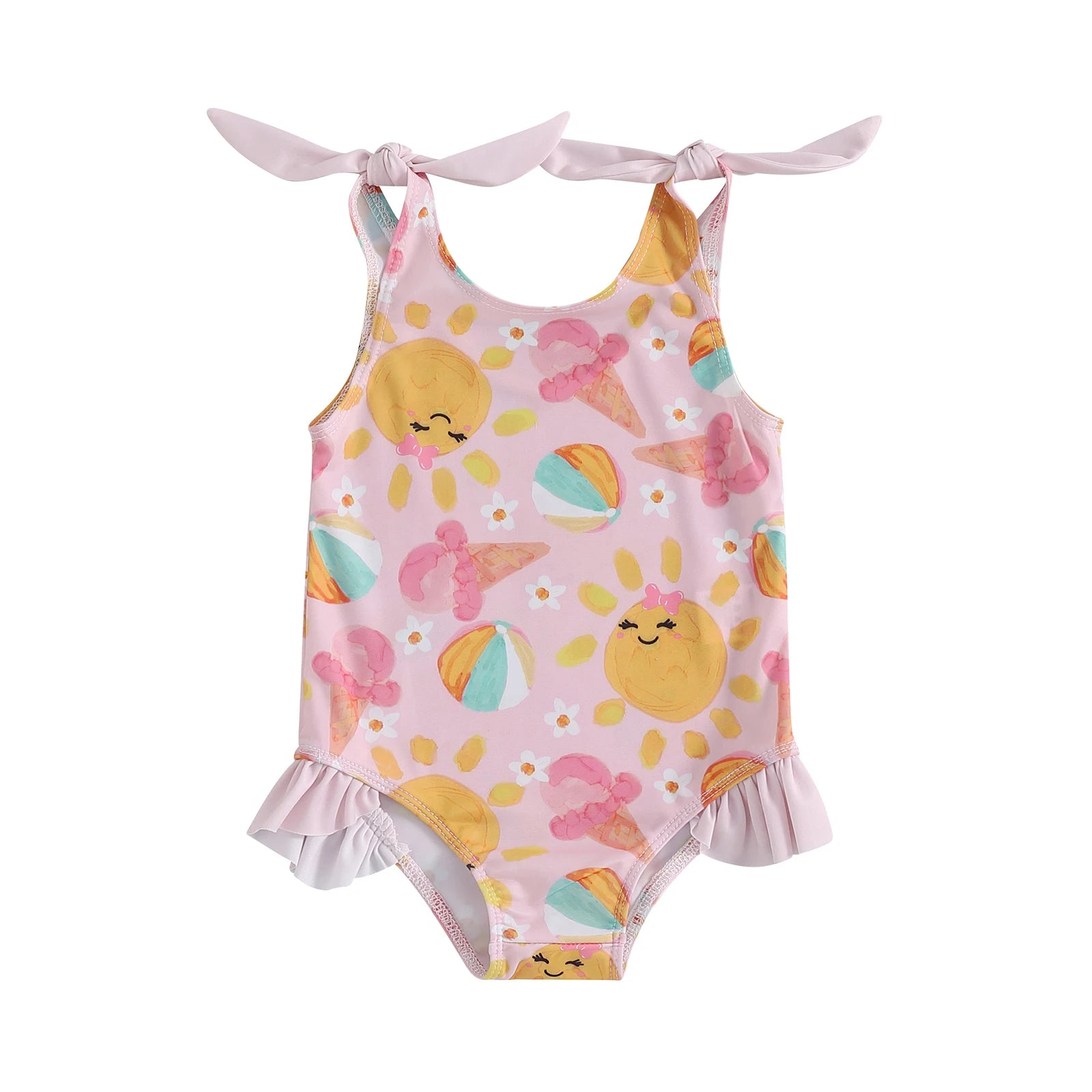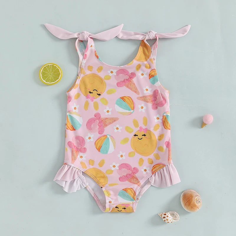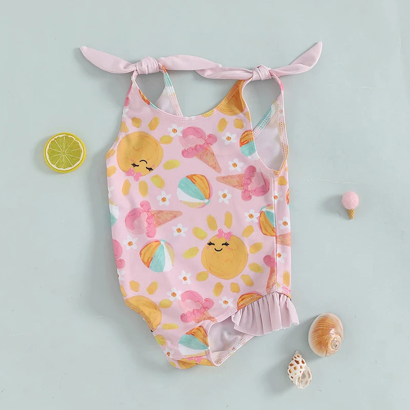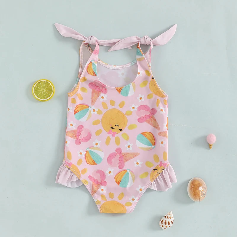 0-5Y Toddler Kids Girls Summer Swimsuits Cartoon Ice Cream Print Tie up Strap Ruffled Swimwear
