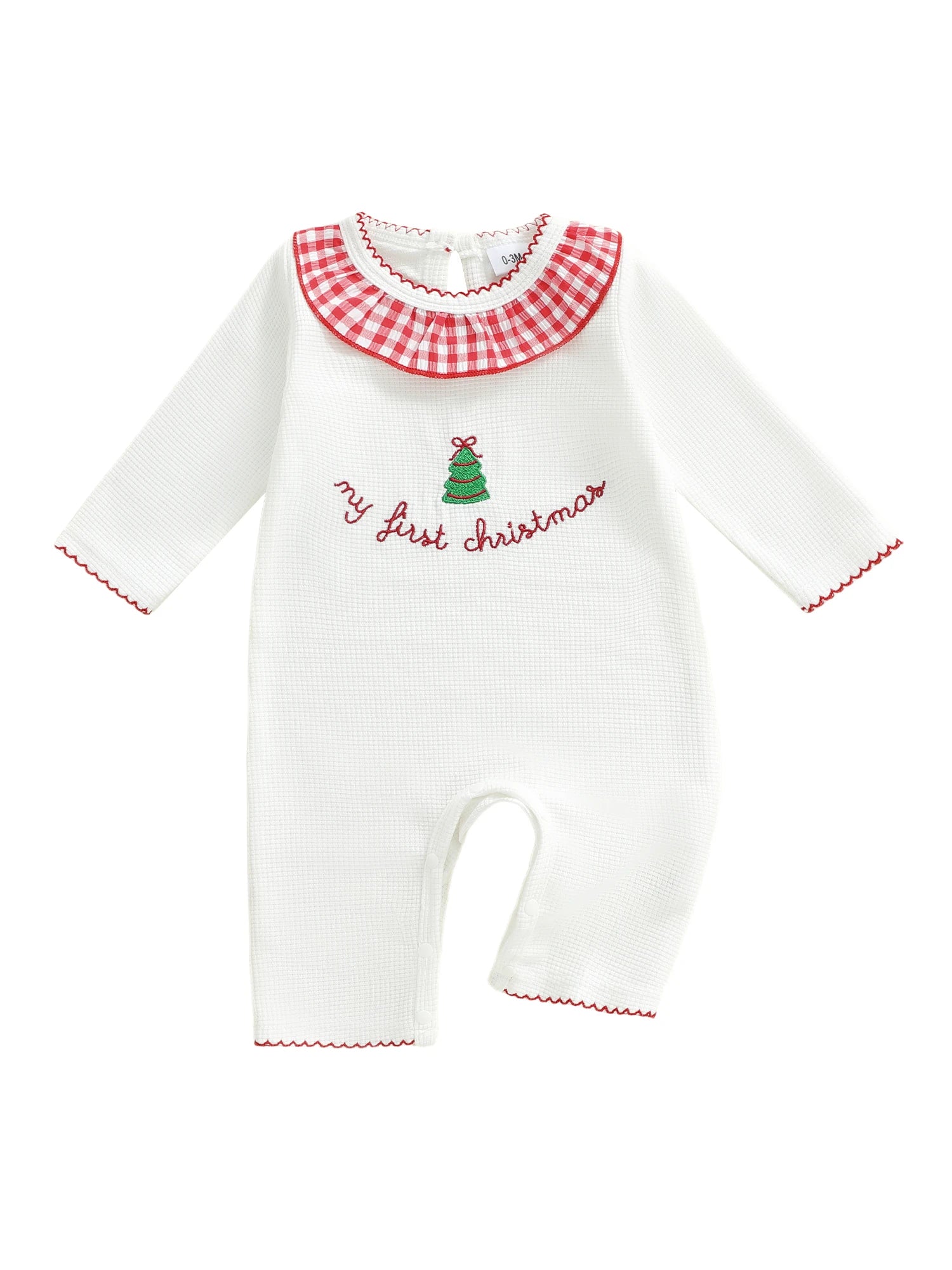 Dress your little one in this adorable Christmas jumpsuit featuring charming tree and letter embroidery with plaid pattern and ruffle trim details. This long sleeve romper is perfect for newborns and babies during the festive season, suitable for both boys and girls.