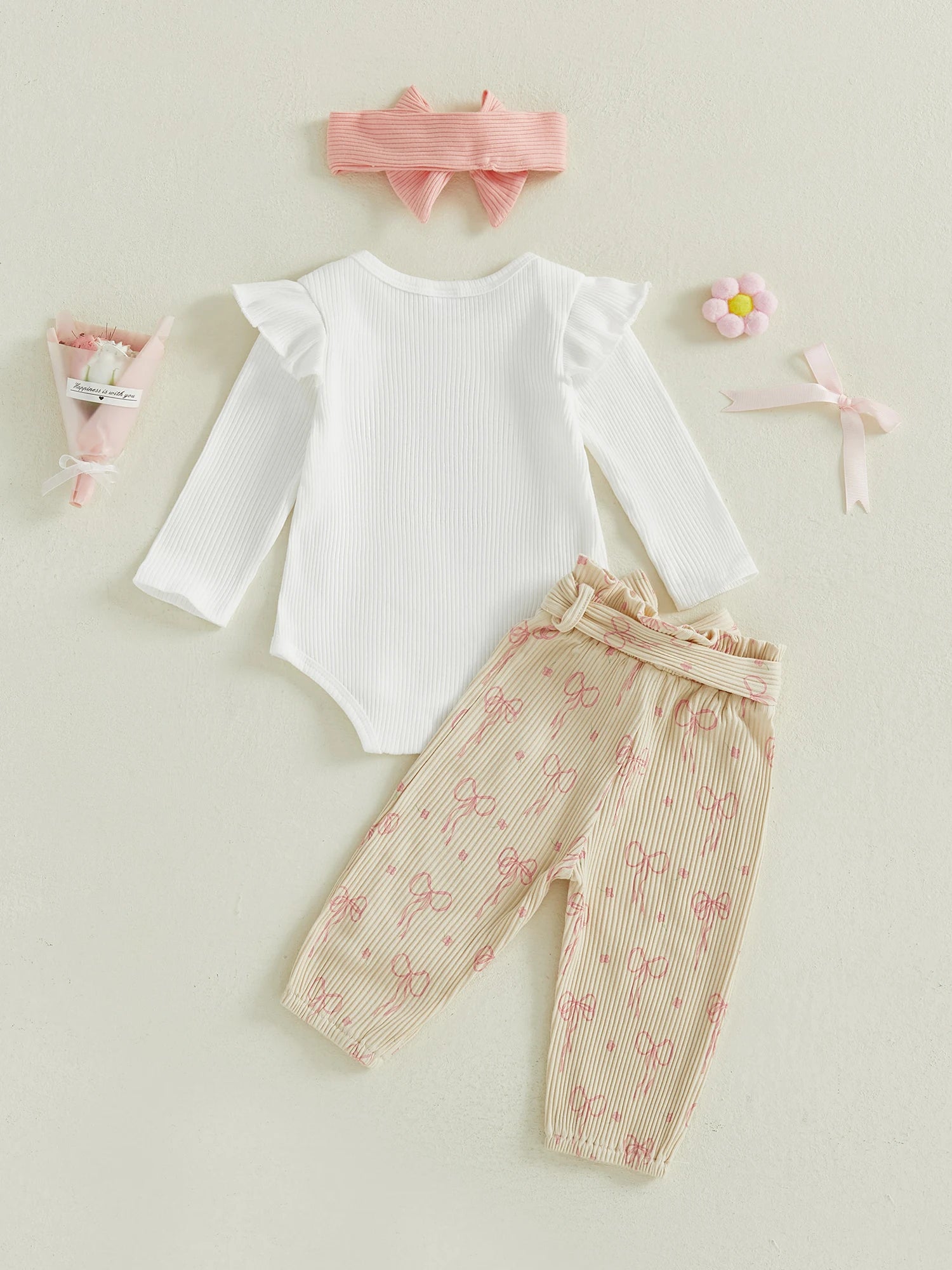 Newborn Baby 4-Piece Outfit Set - Long Sleeve Romper, Pants, Belt & Headband