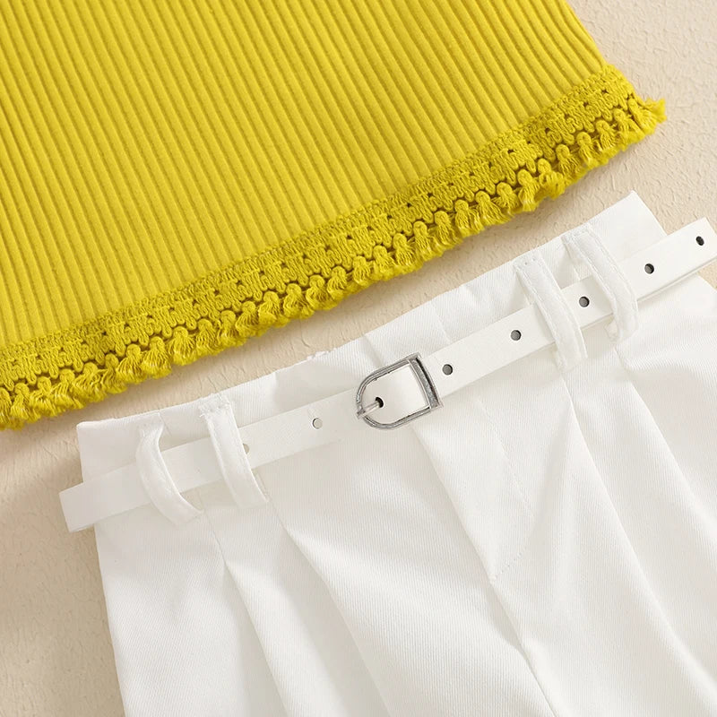 Girl Summer Clothes Solid Ribbed Halter Cami Tops + Shorts with Belt 2 Pcs Set