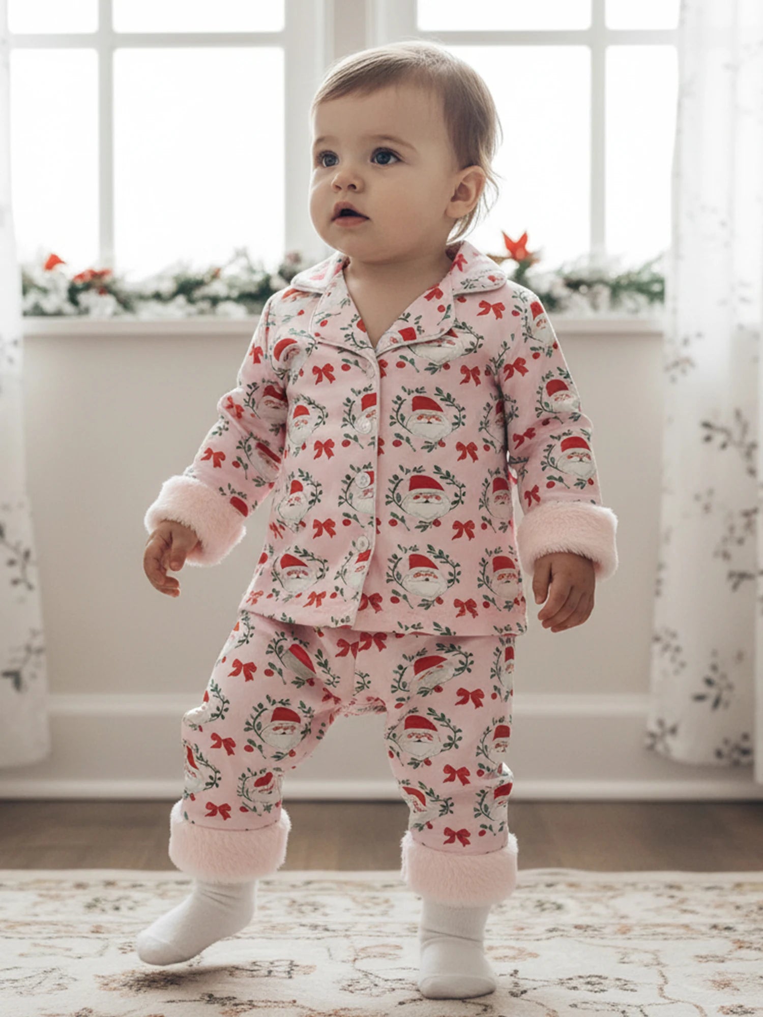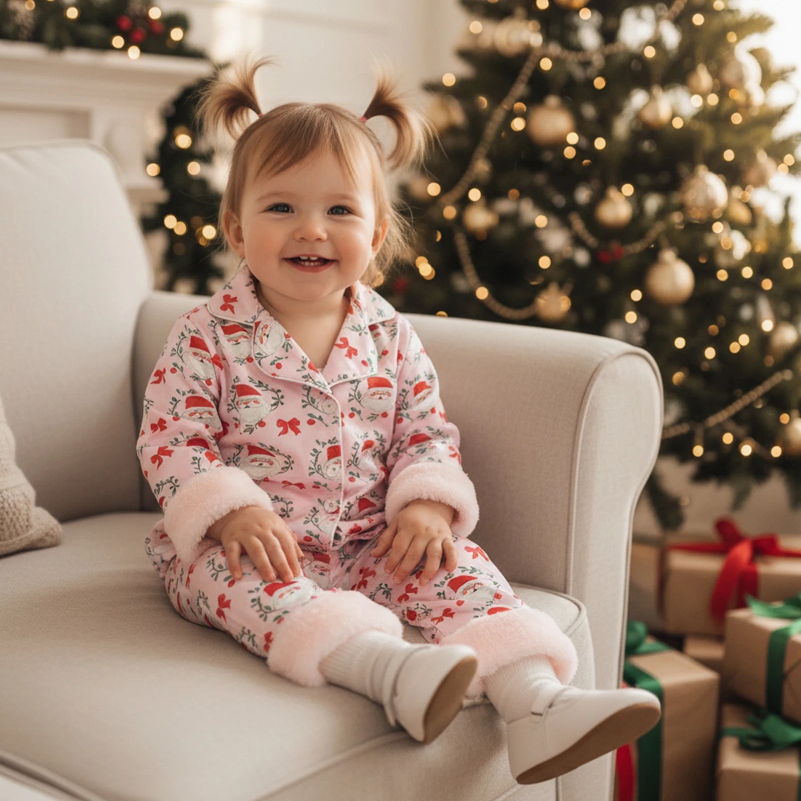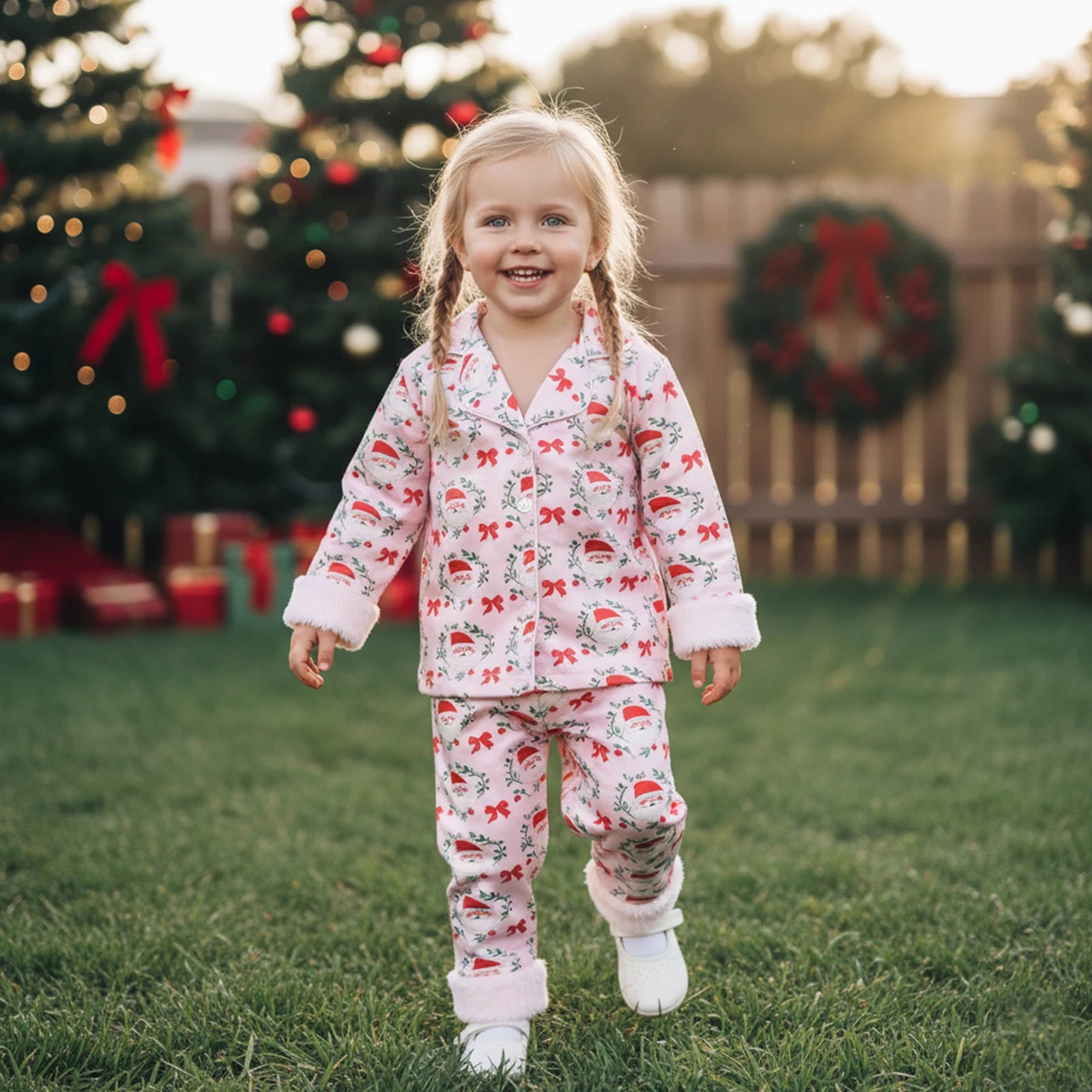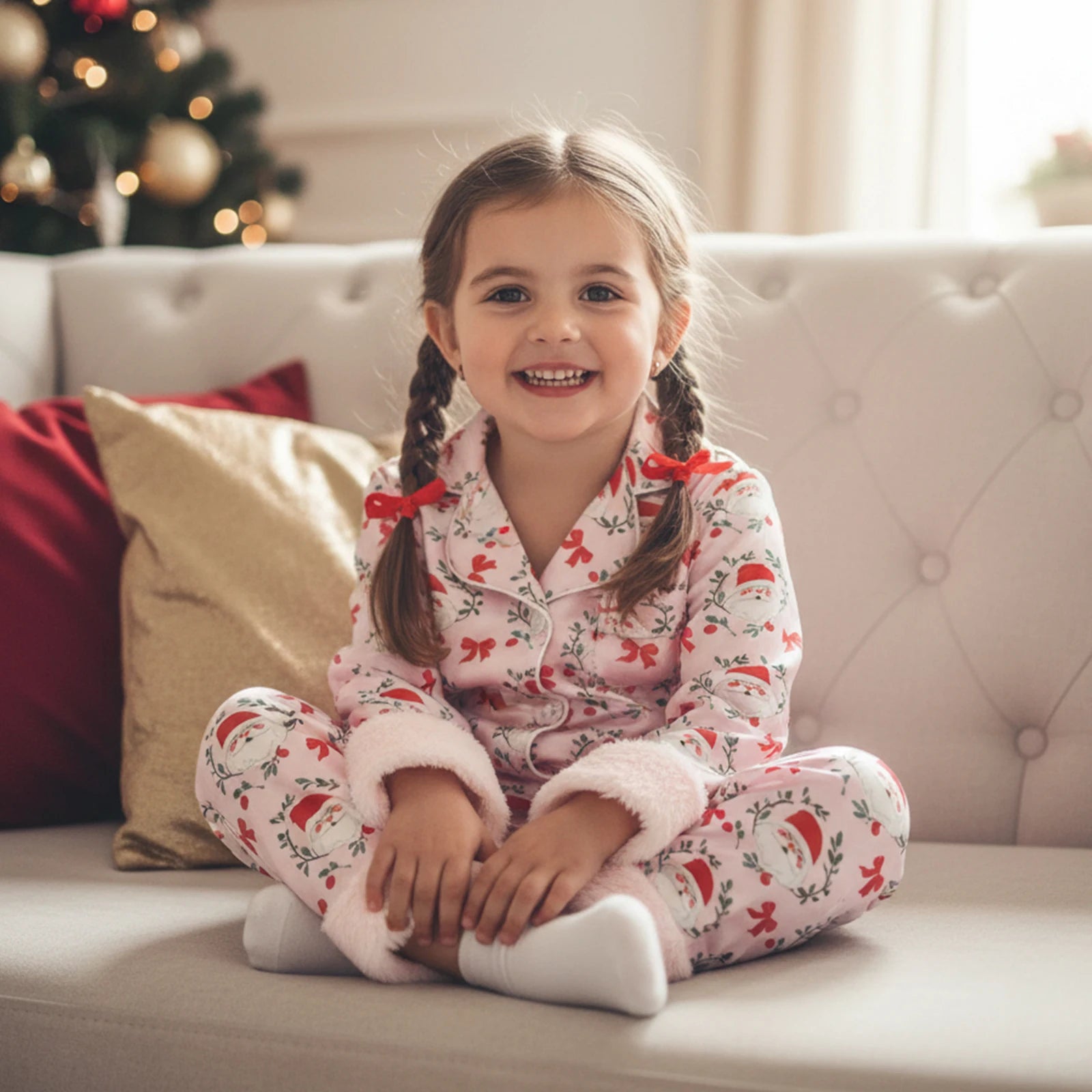 Make bedtime magical this holiday season with this adorable Christmas pajamas set for little girls. Featuring a charming Santa Claus and bow print long sleeve top paired with comfortable elastic waist pants, this cozy ensemble is perfect for Christmas Eve, holiday mornings, and festive family photos.