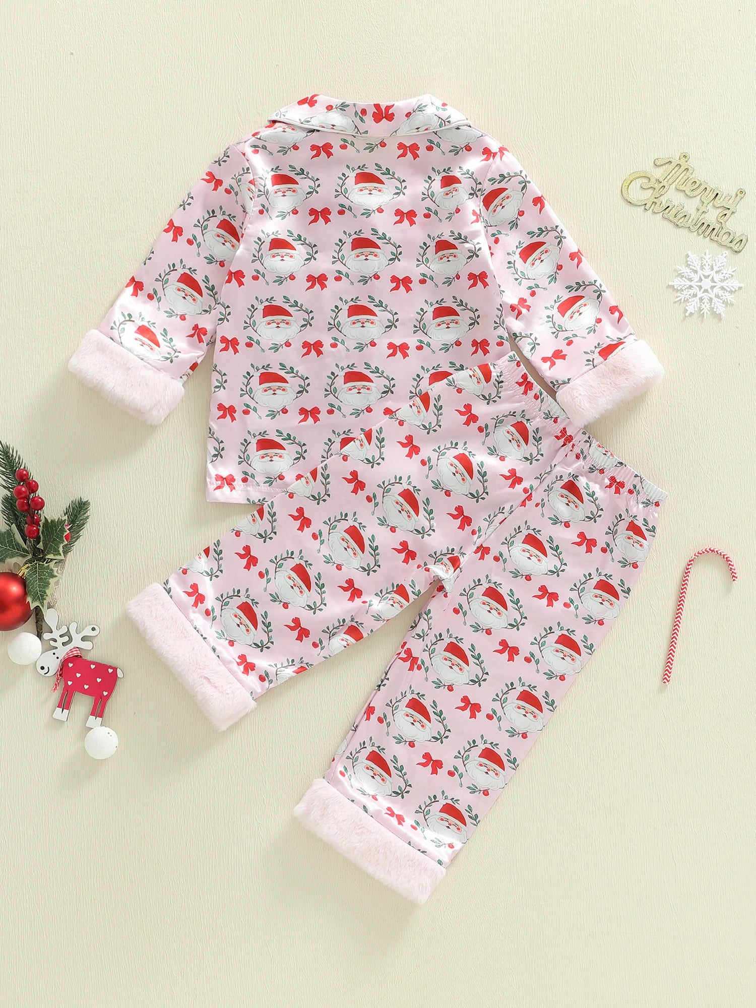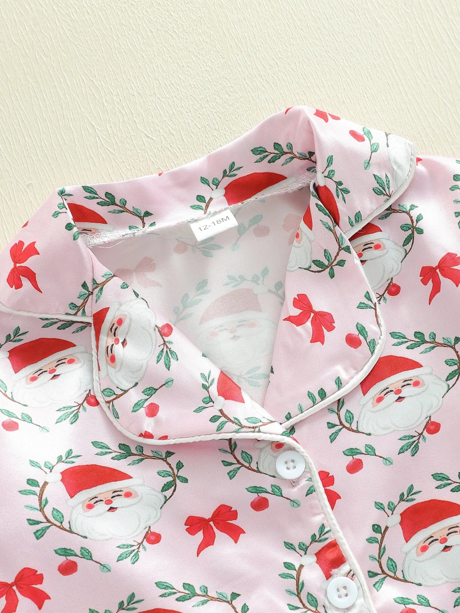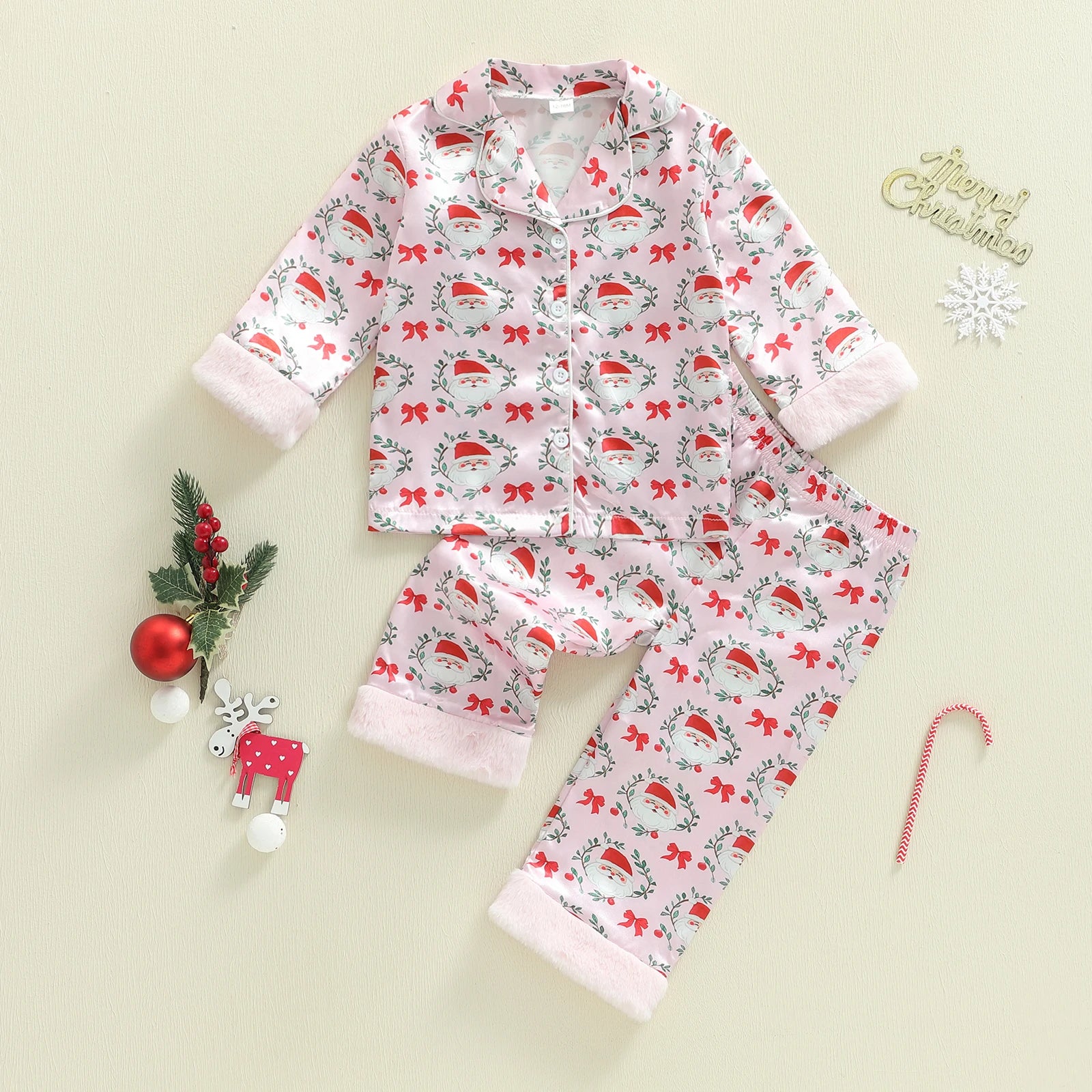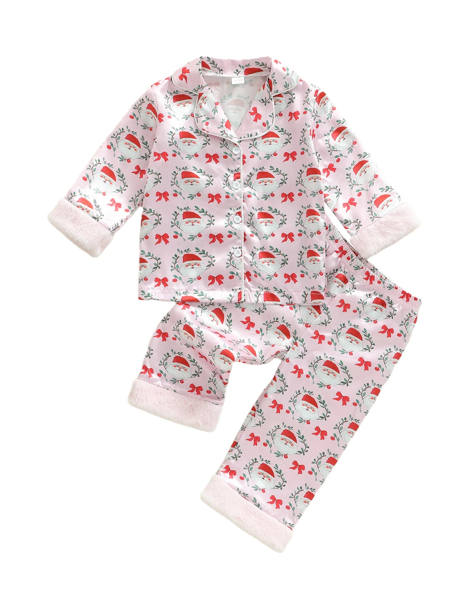 Toddler Girls Christmas Pajamas Set - Santa Claus Bow Print Long Sleeve Top & Pants 1-5Y