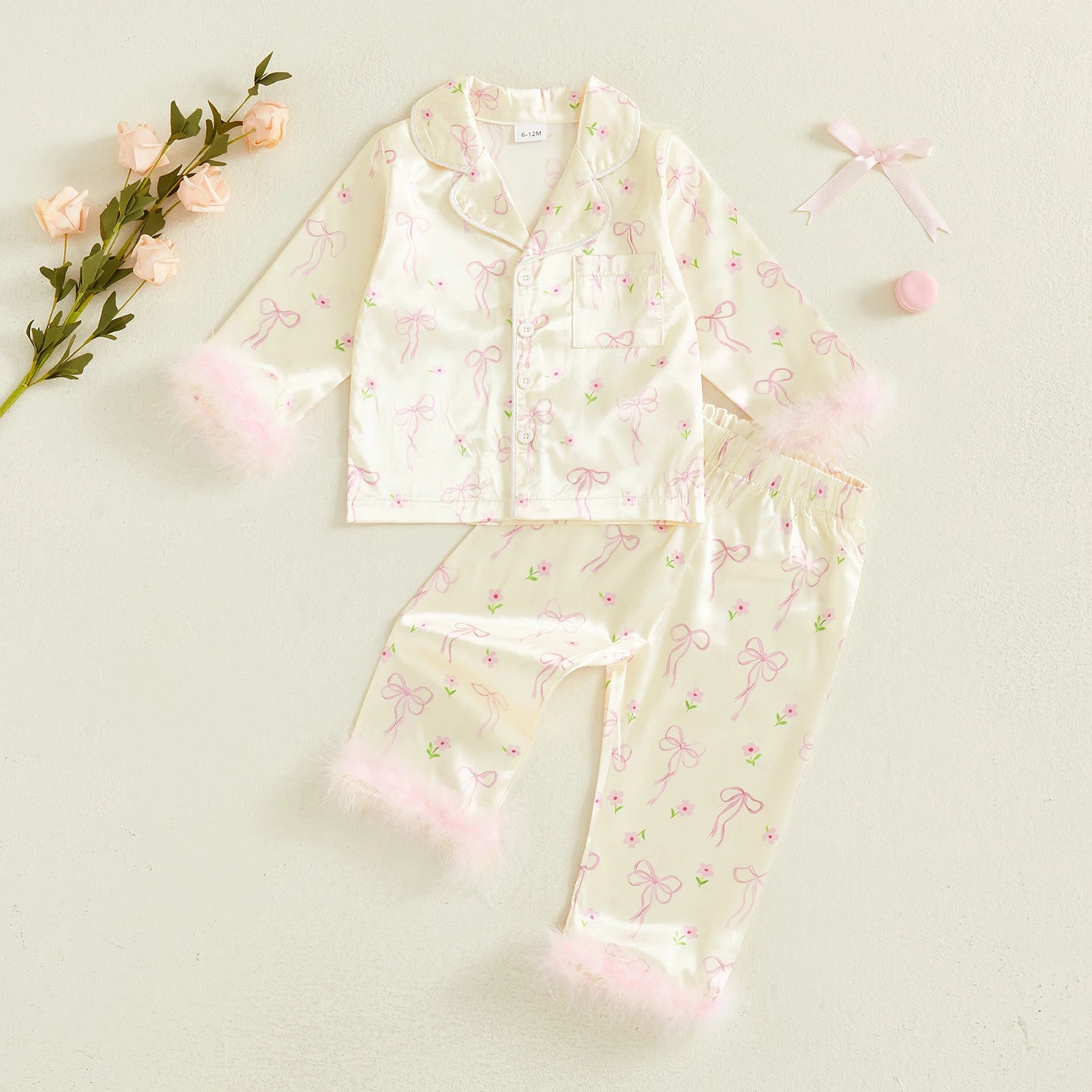 Toddler Girls Satin Pajama Set - Bow Furry Cuff Long Sleeve Top & Pants (1-5Y)