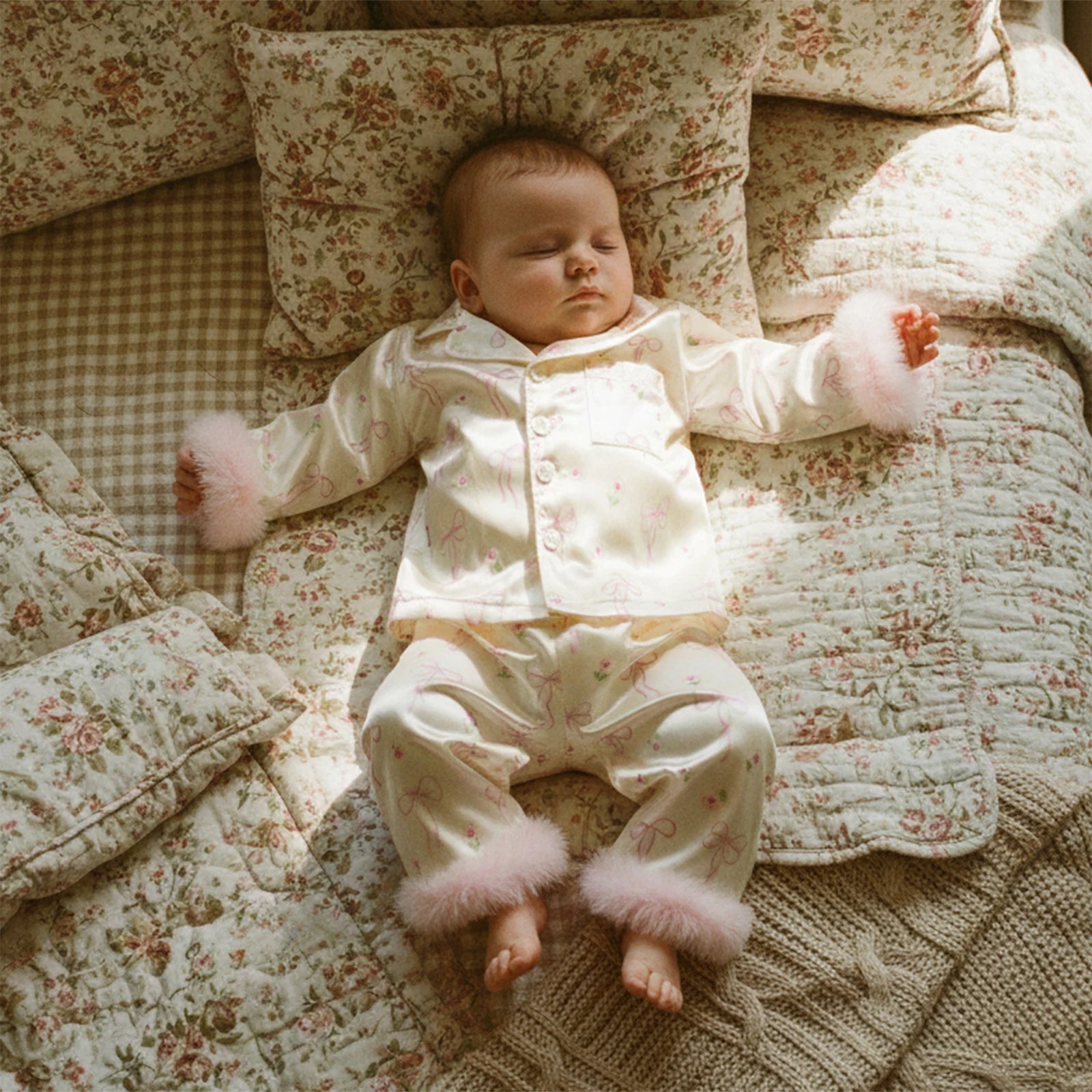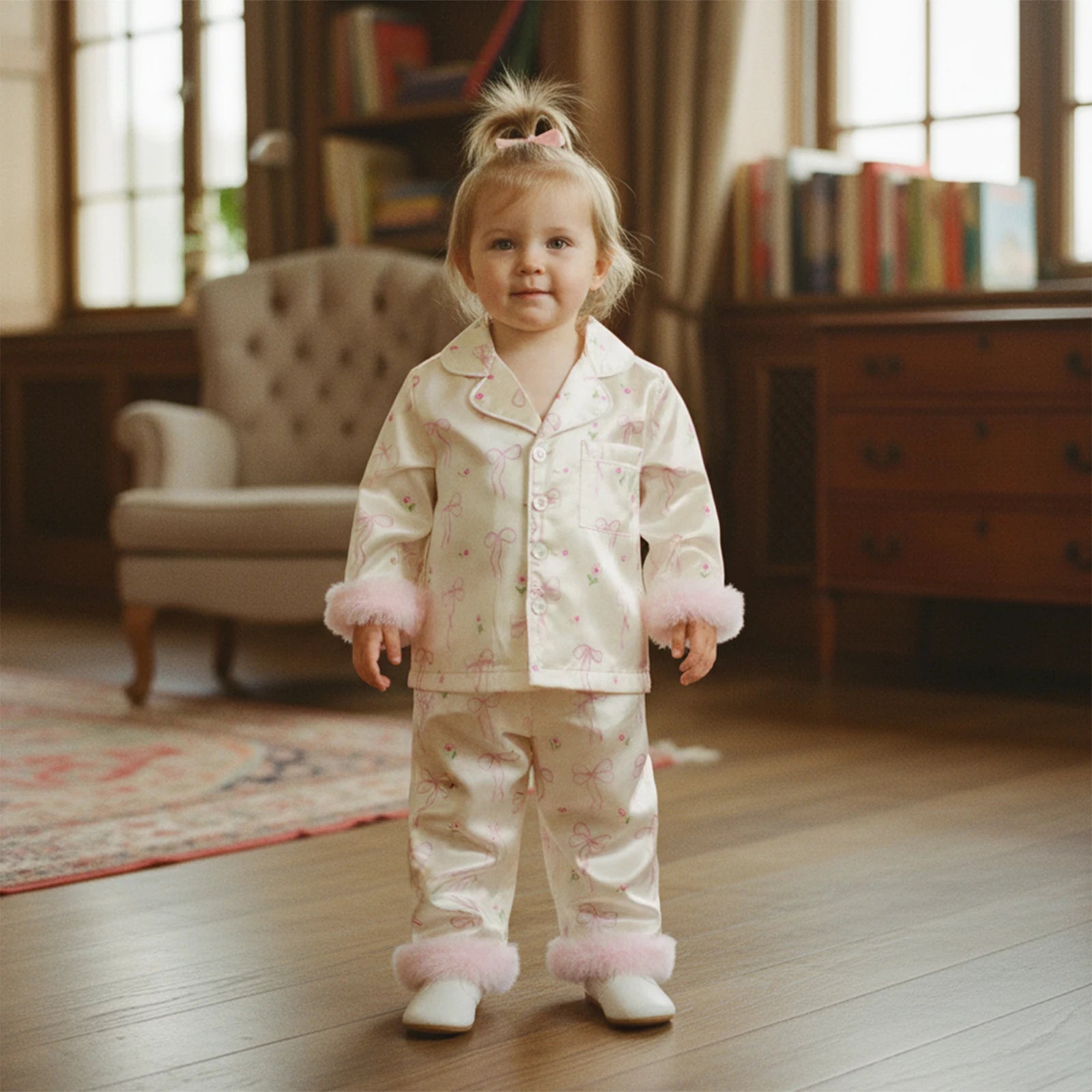 Luxuriously soft and utterly charming, this satin pajama set is perfect for cosy autumn and winter nights. Featuring a long-sleeve top with elegant turn-down collar and adorable bow details, paired with matching pants with furry cuff hems, this ensemble will make bedtime the highlight of your little one's day.