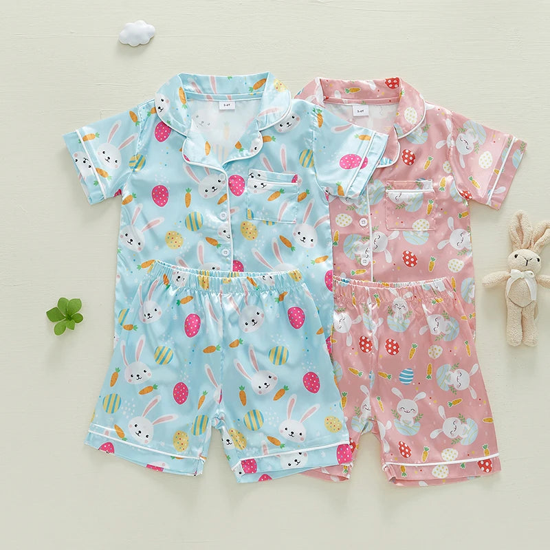 1-7Y Kids Girls Easter Pyjamas Clothes Set Rabbit Carrot Print Button Down V Neck Short Sleeve Tops and Shorts