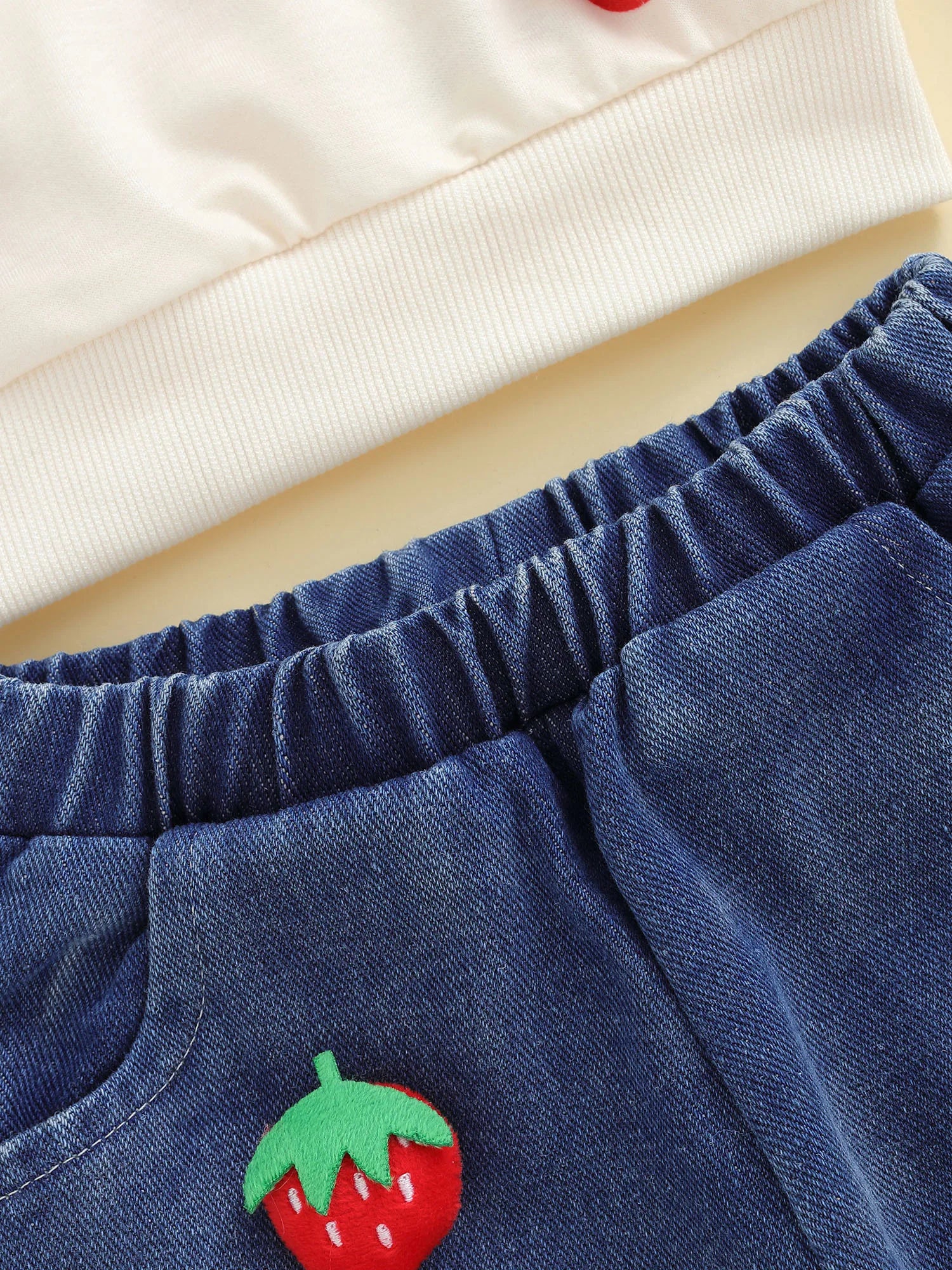 Kids Girls Fall Winter Clothes Set - 3D Strawberry Long Sleeve Pullover Top & Ripped Denim Flare Pants