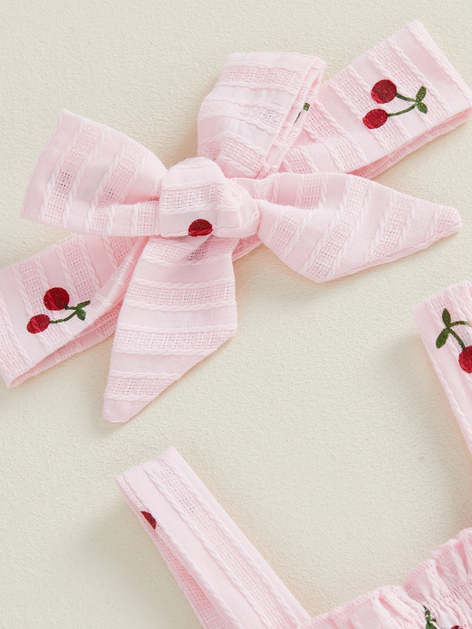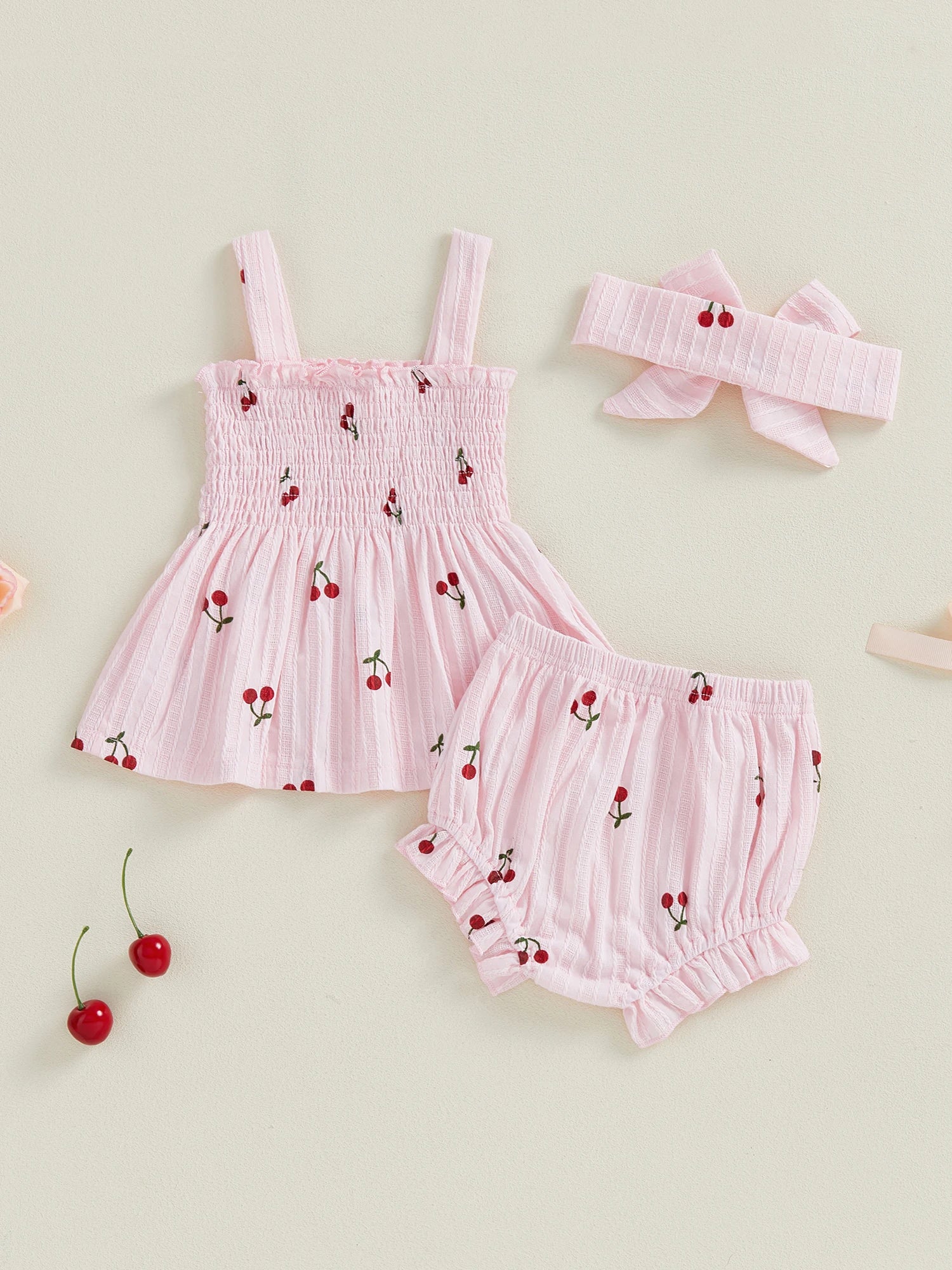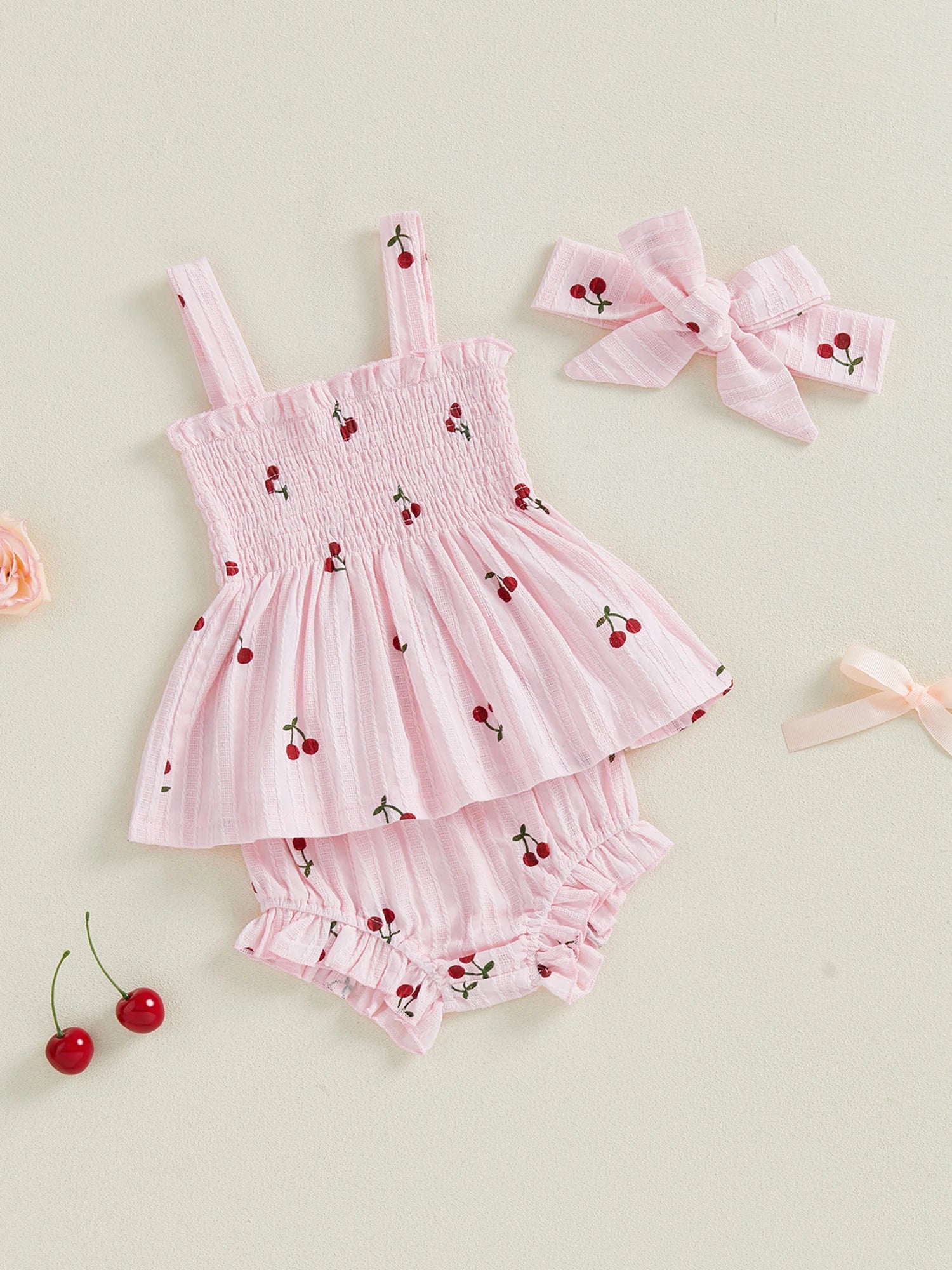 Dress your little one in sweet summer style with this charming 3-piece outfit set. Featuring a sleeveless square collar top with delightful cherry print, coordinating ruffled shorts, and a matching headband, this ensemble is perfect for warm weather adventures and sunny days.