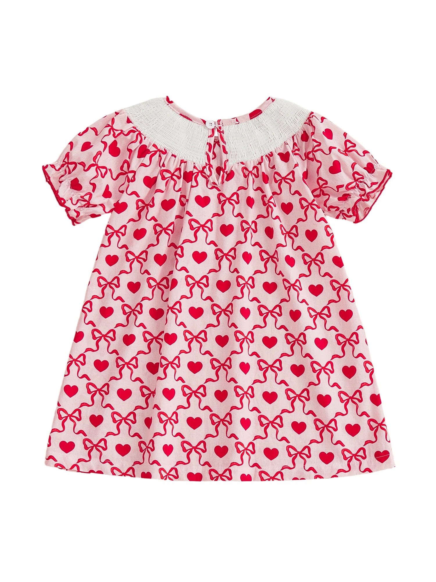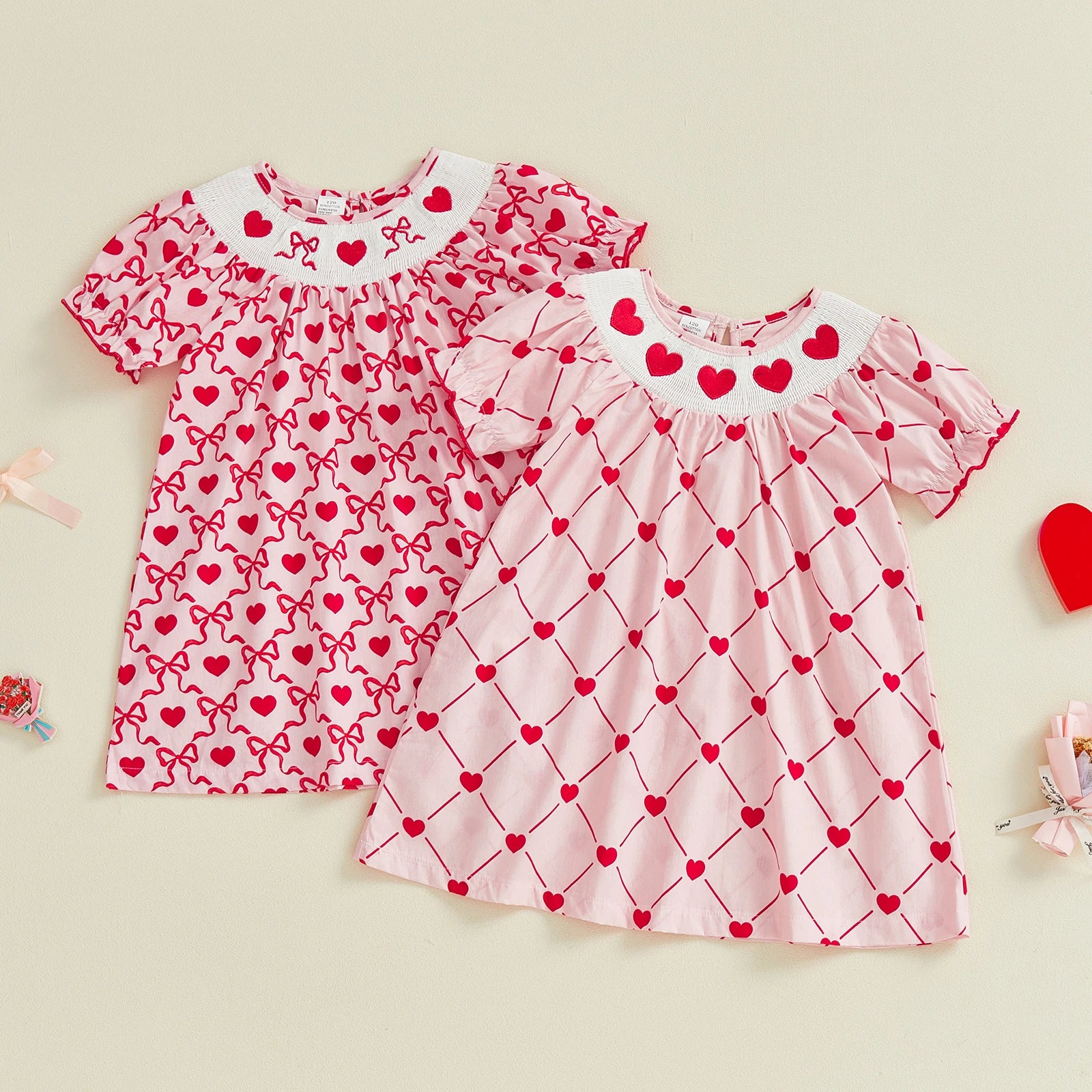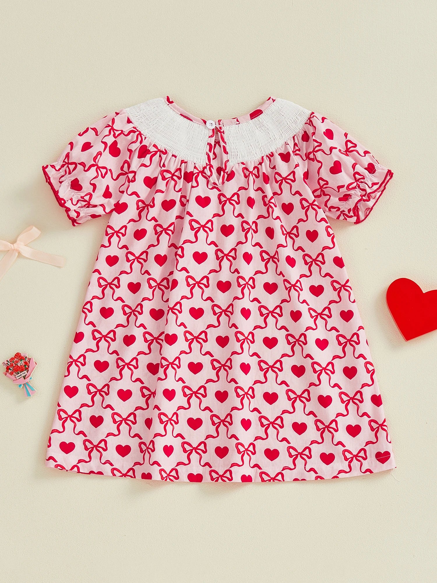 Little Girls Valentine's Day Short Sleeve Heart Embroidery Print A-Line Dress