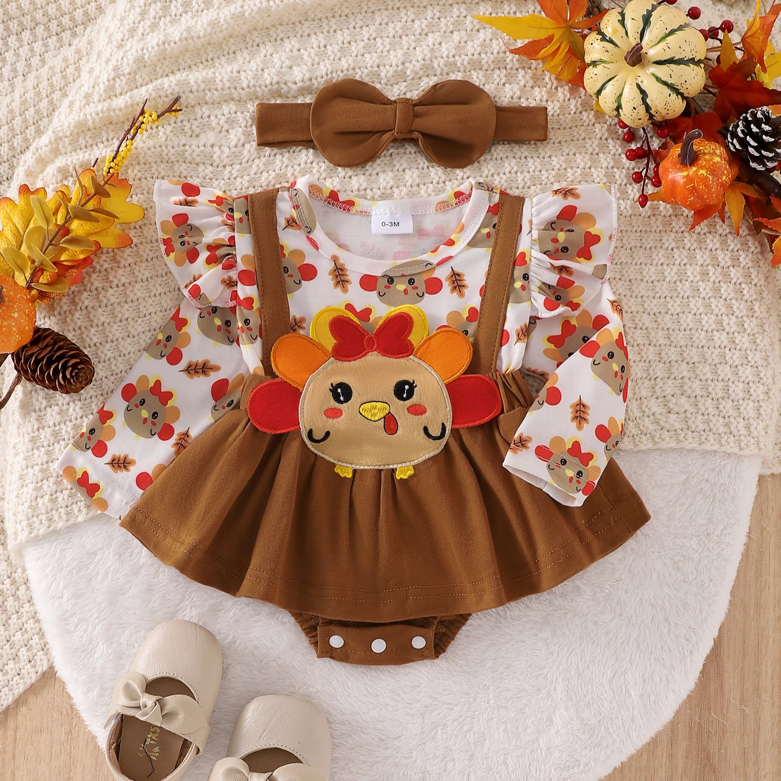 Celebrate the holidays in style with this adorable 2-piece set featuring a long sleeve romper dress with festive turkey or Santa print and matching headband. Perfect for Thanksgiving, Christmas, and all the special moments in between.