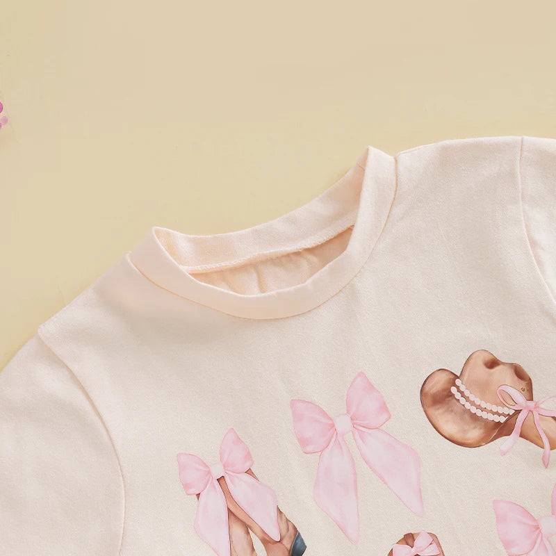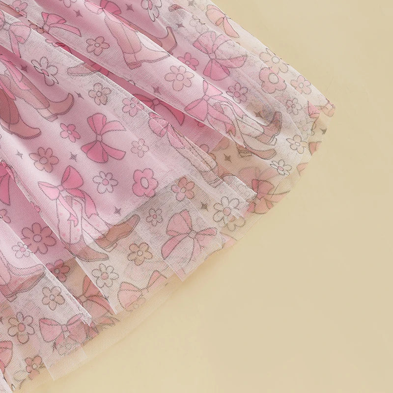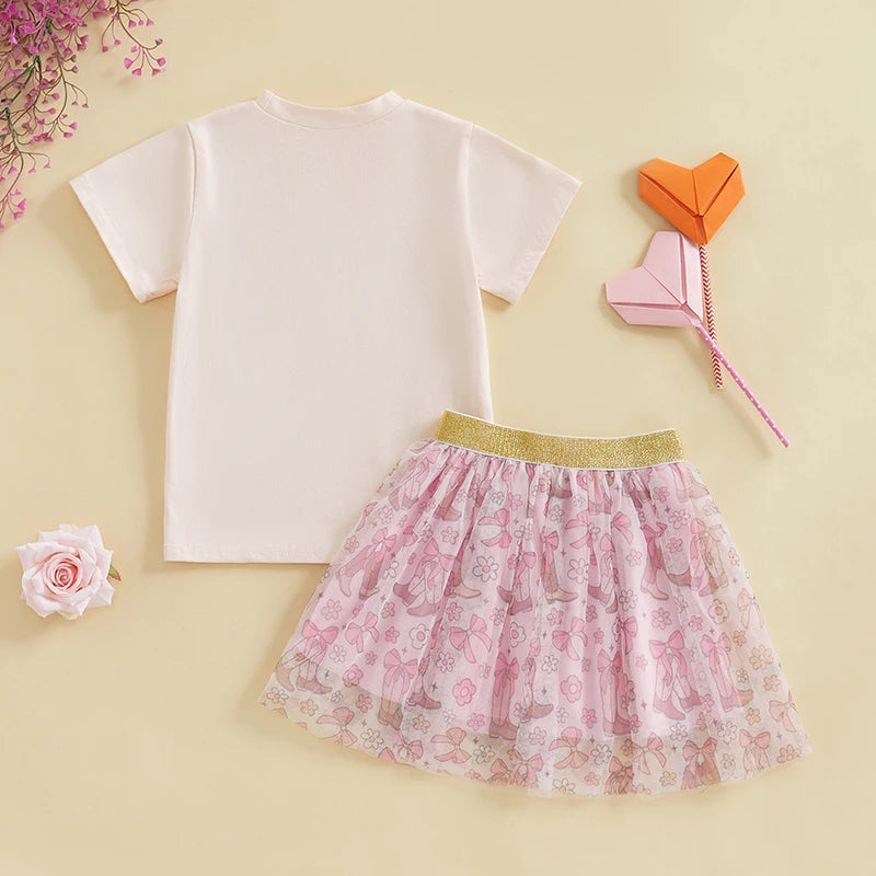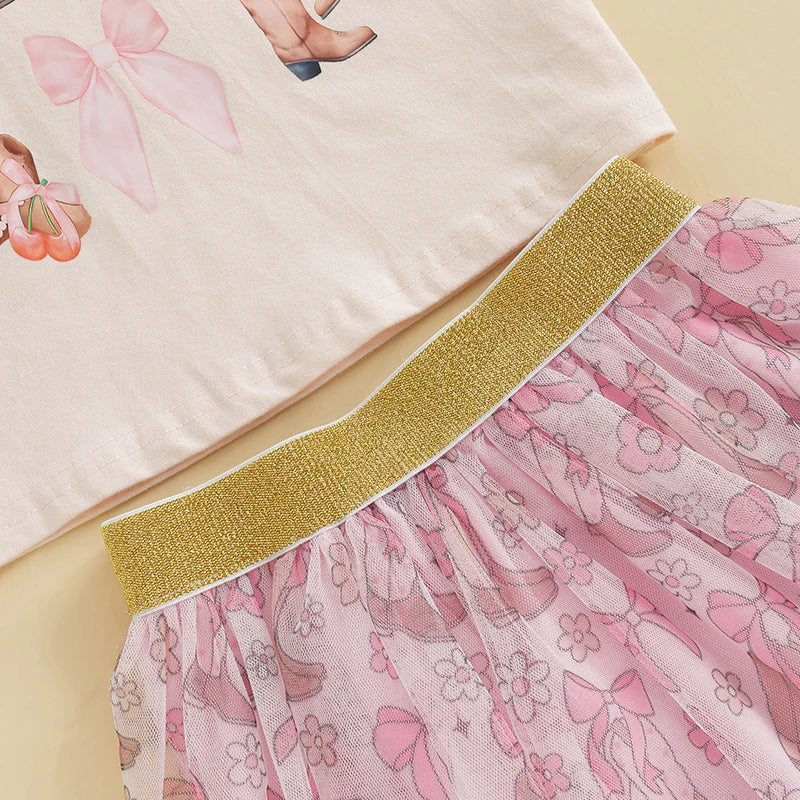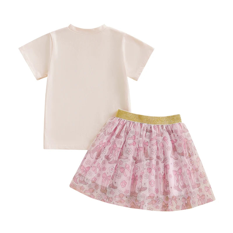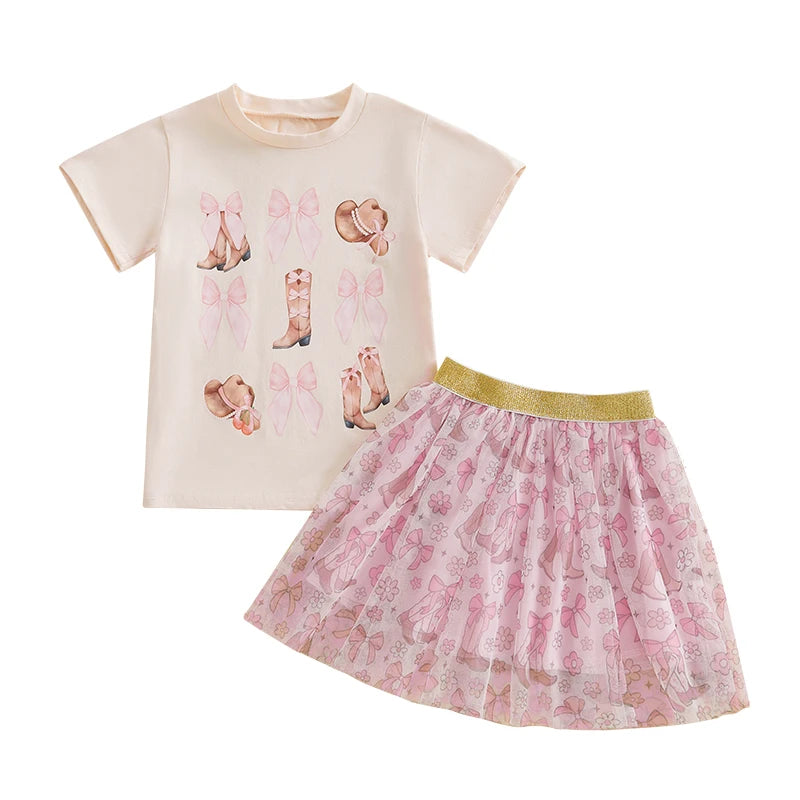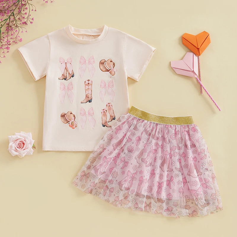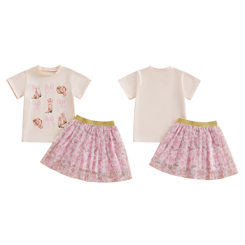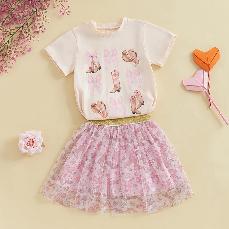 2pcs Kids Girls Summer Clothes Set Short Sleeve Bow Boots Print T Shirt and Tulle Skirt 0-5Y