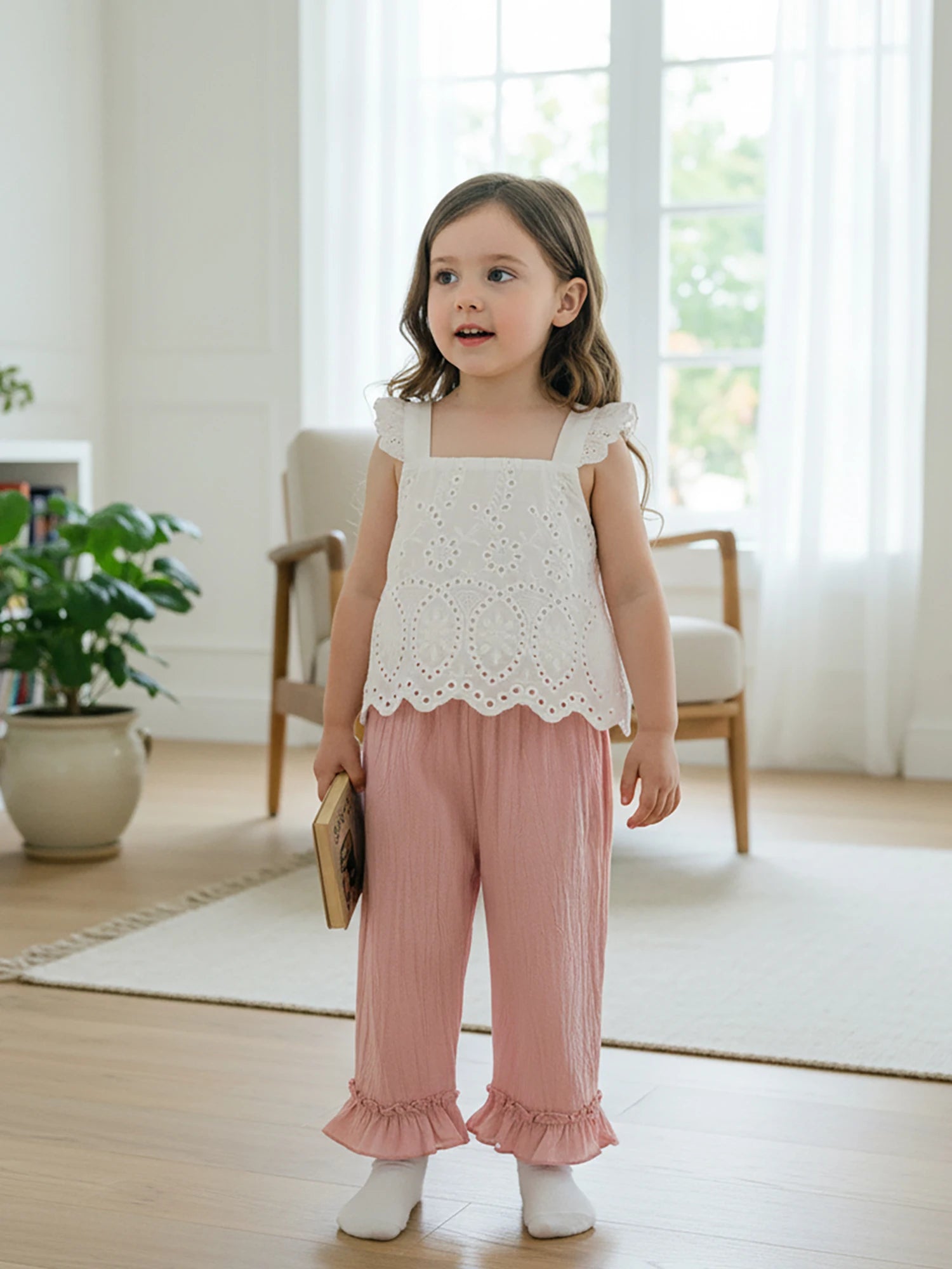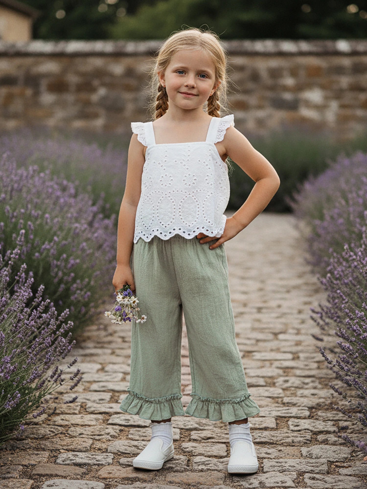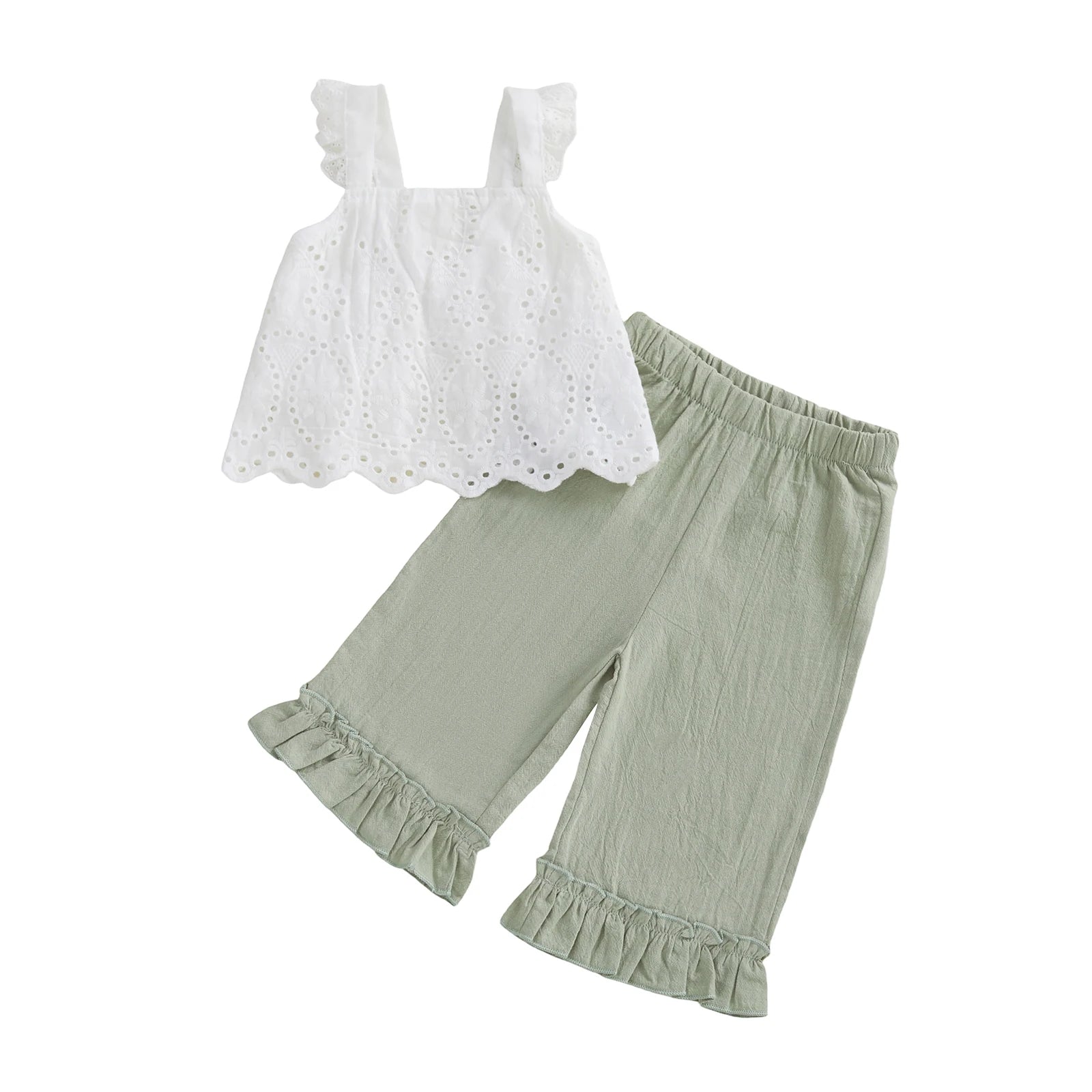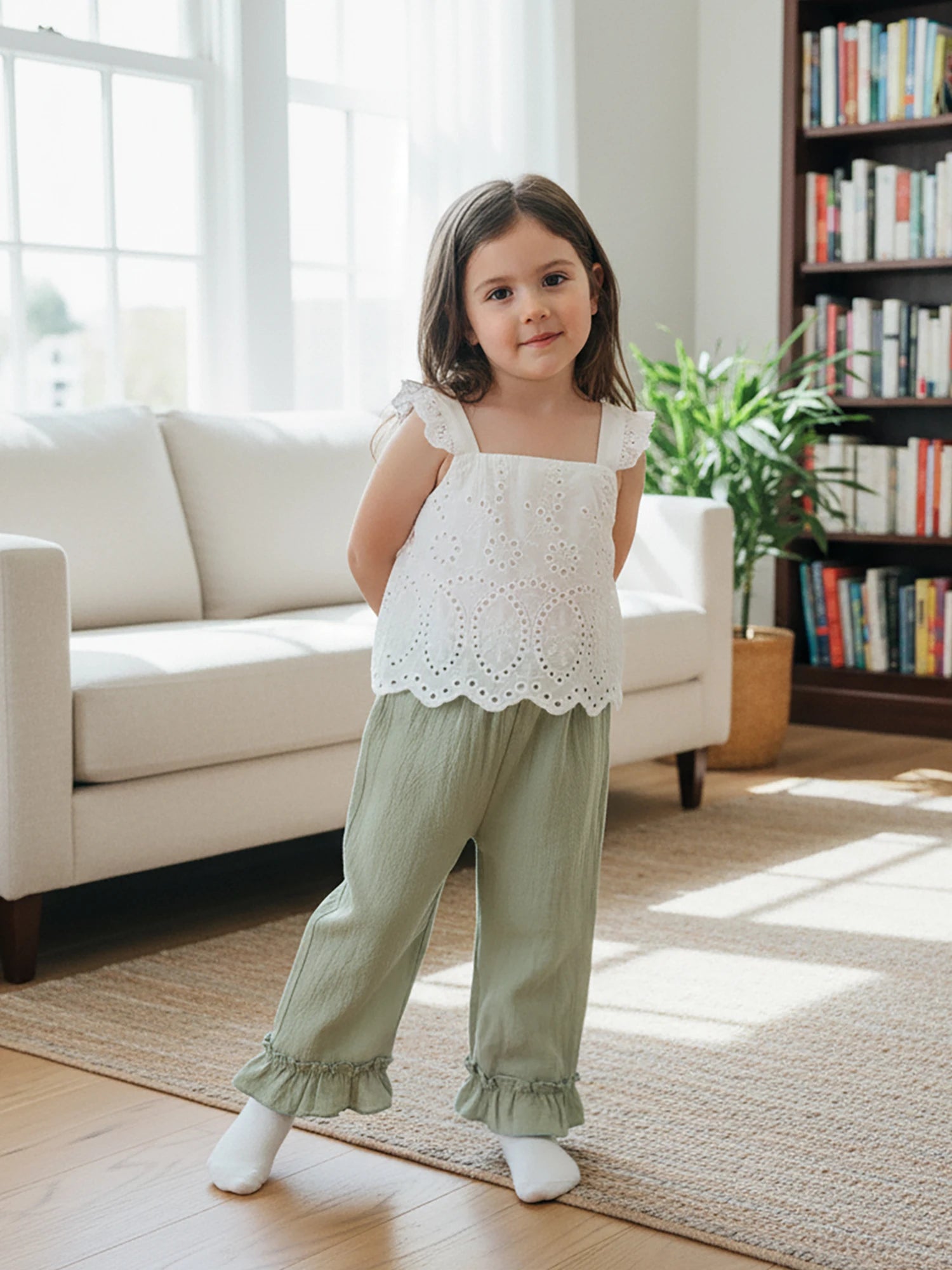 Girls Spring Outfit Set - Lace Ruffle Sleeveless Top & Wide Leg Pants (2-7Y)