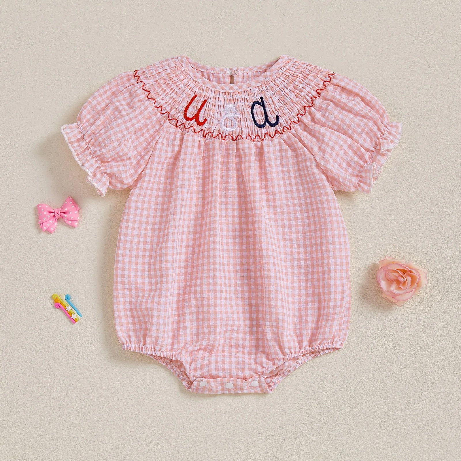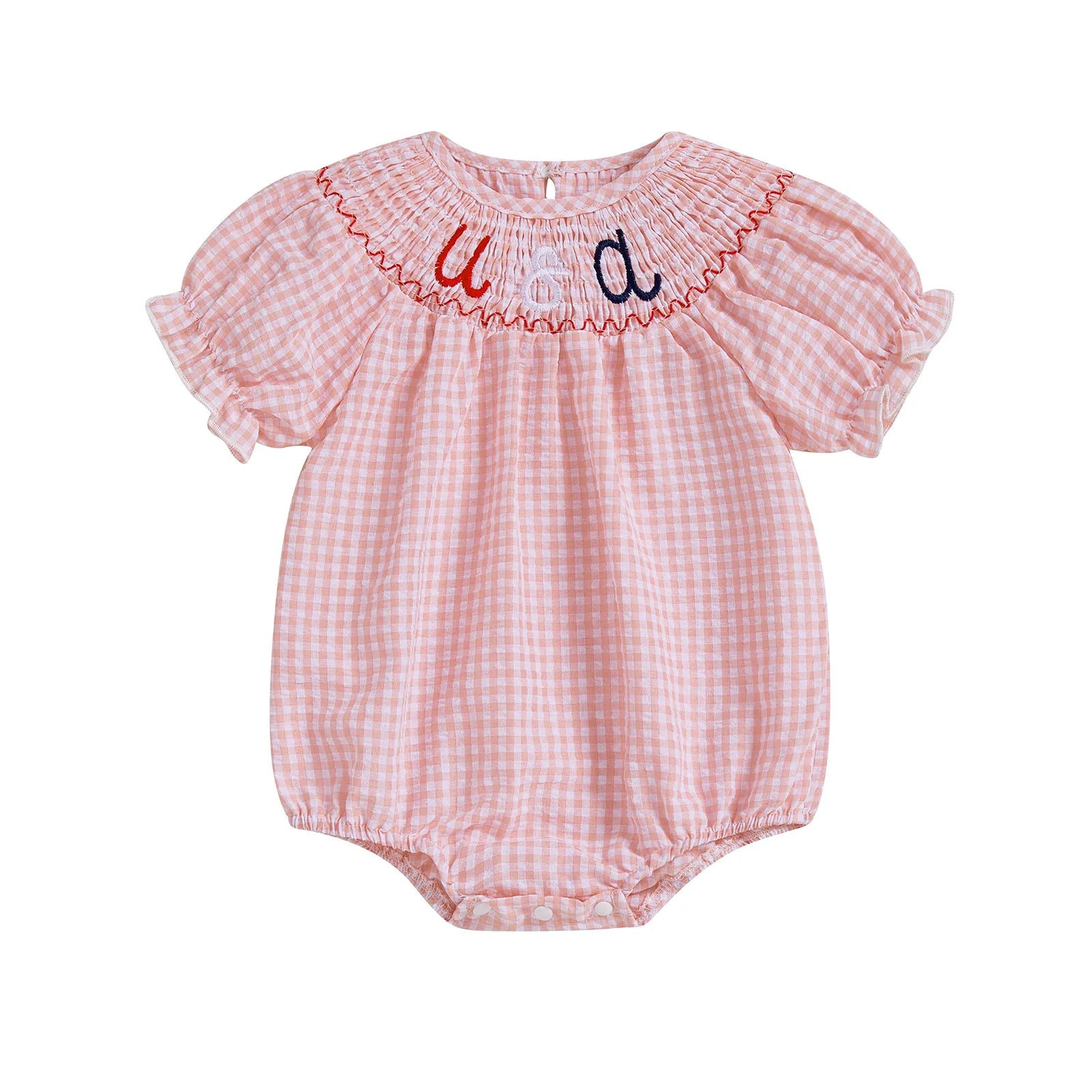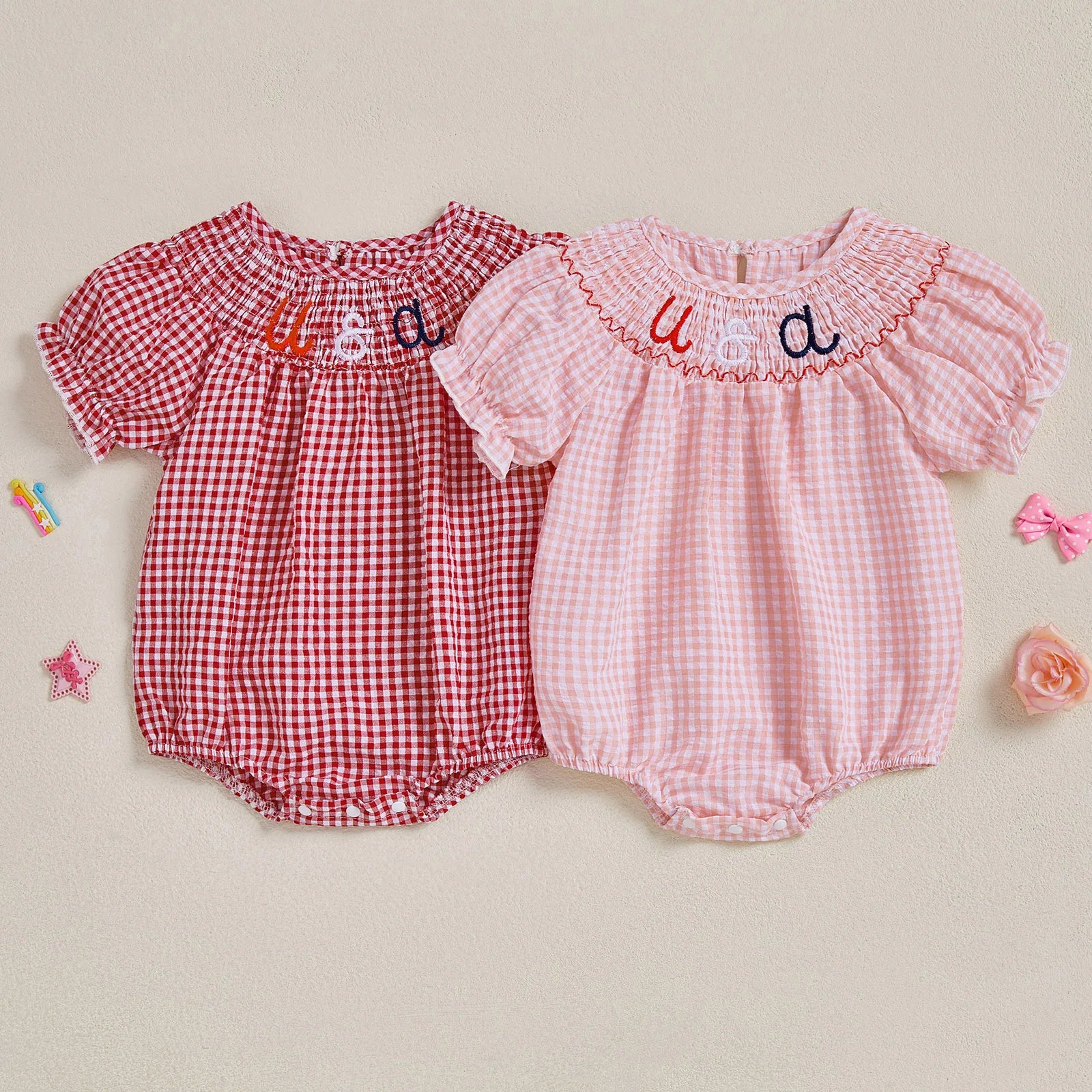 Celebrate in patriotic style with these charming baby girls rompers available in 3 beautiful colors. Featuring delightful letter embroidery and classic plaid print, these short sleeve jumpsuits are perfect for Independence Day celebrations, summer outings, or any special occasion for your little princess.