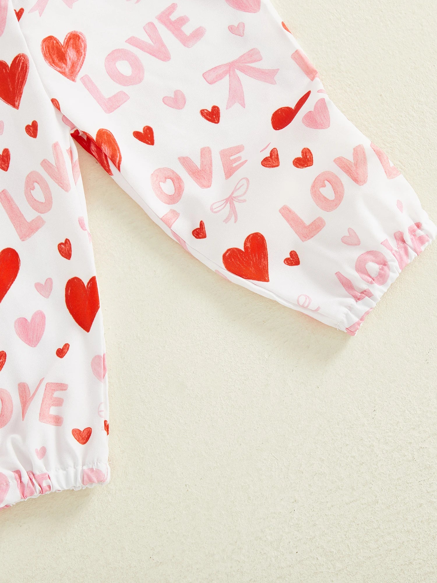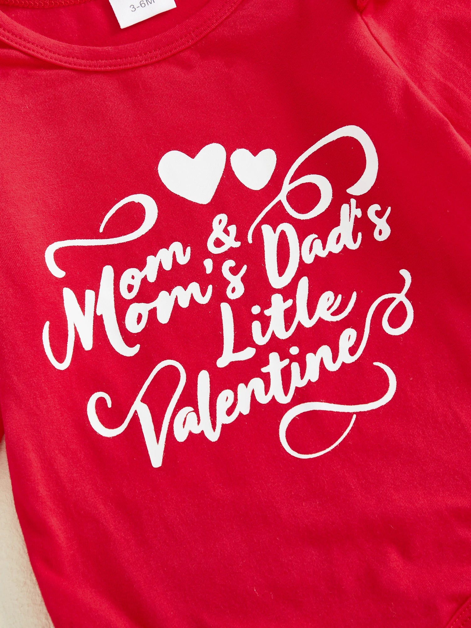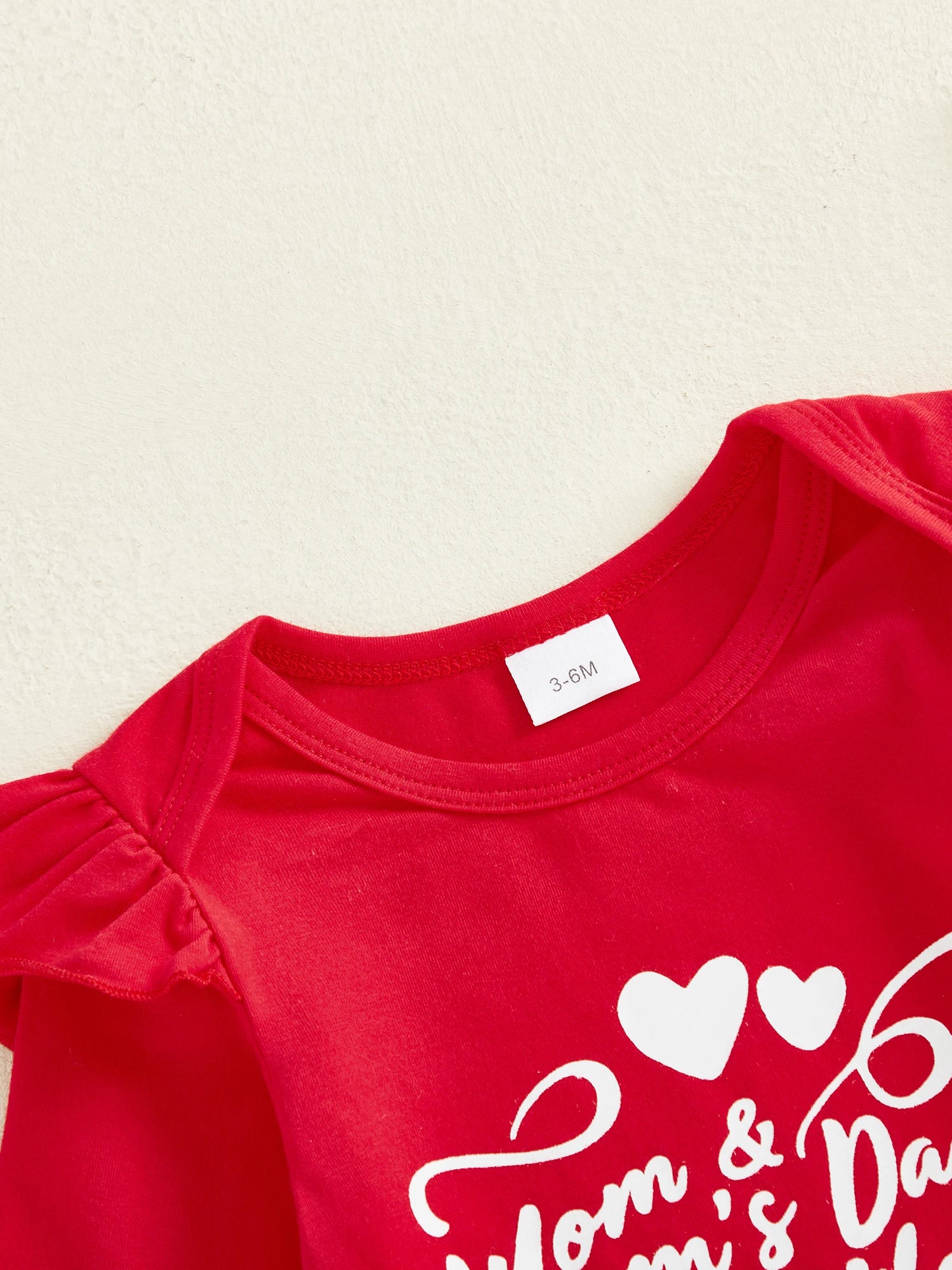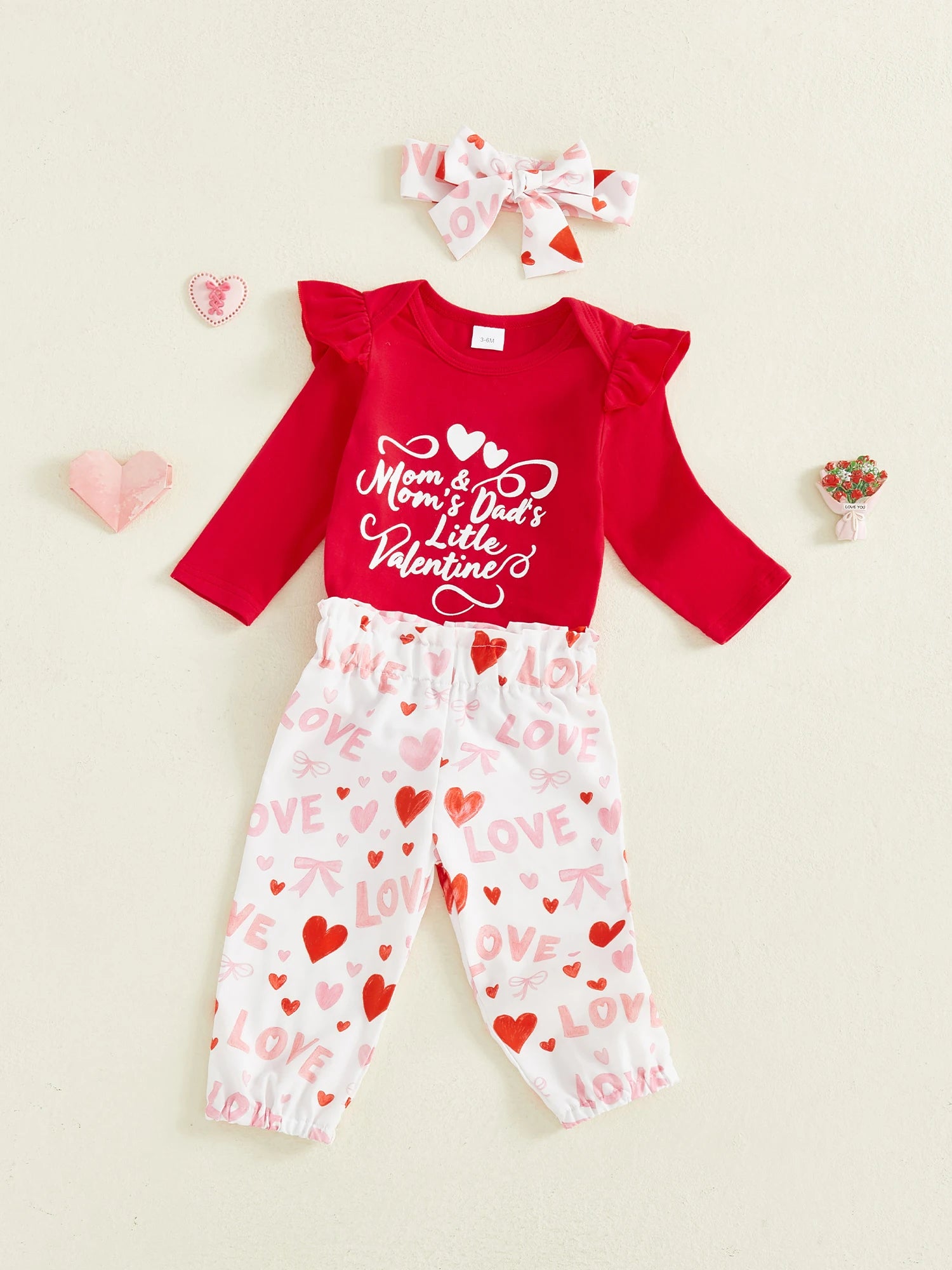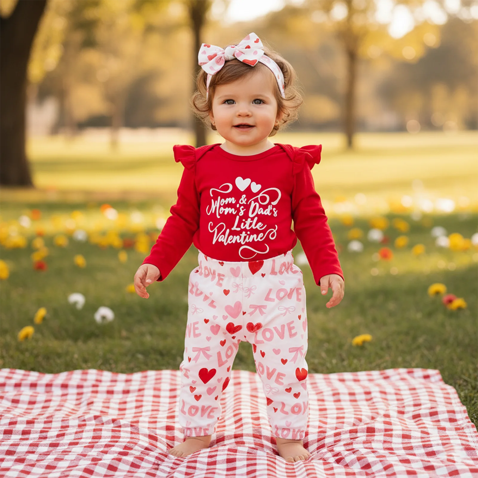 This charming outfit features a ruffle-detailed romper with sweet letter print, coordinating pants, and a matching headband, creating the perfect ensemble for Valentine's Day celebrations, photoshoots, or special occasions.