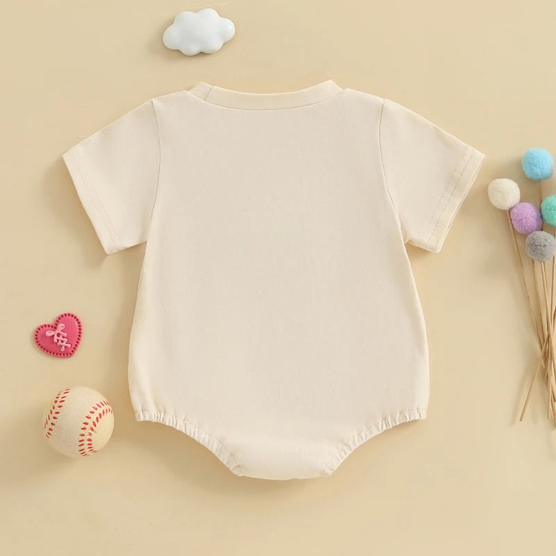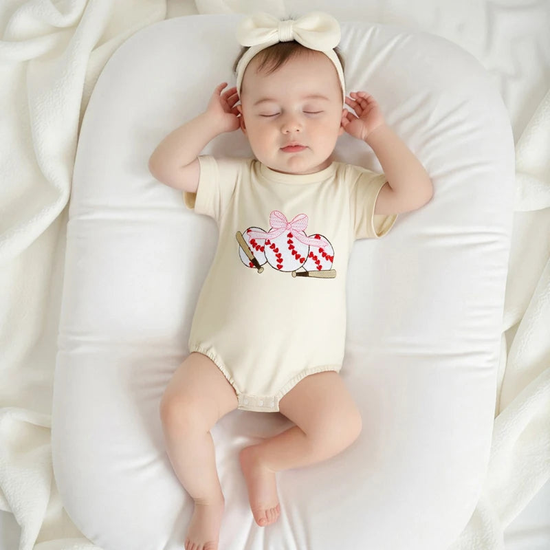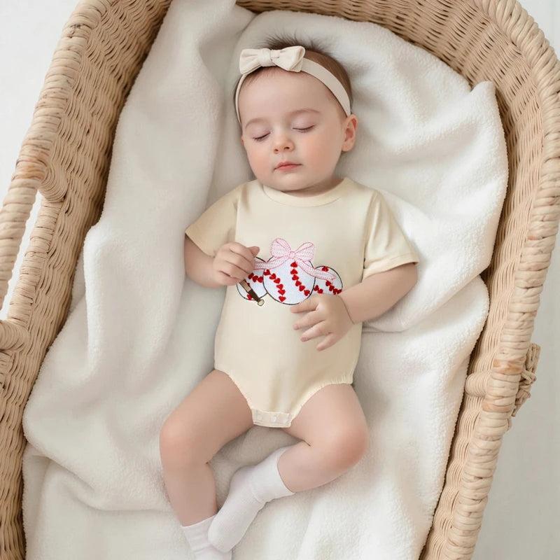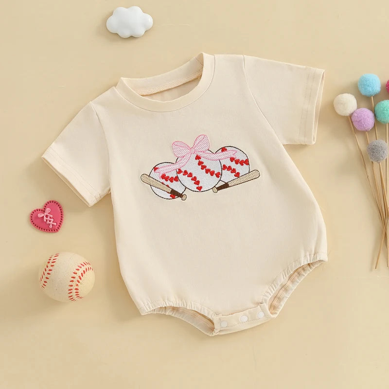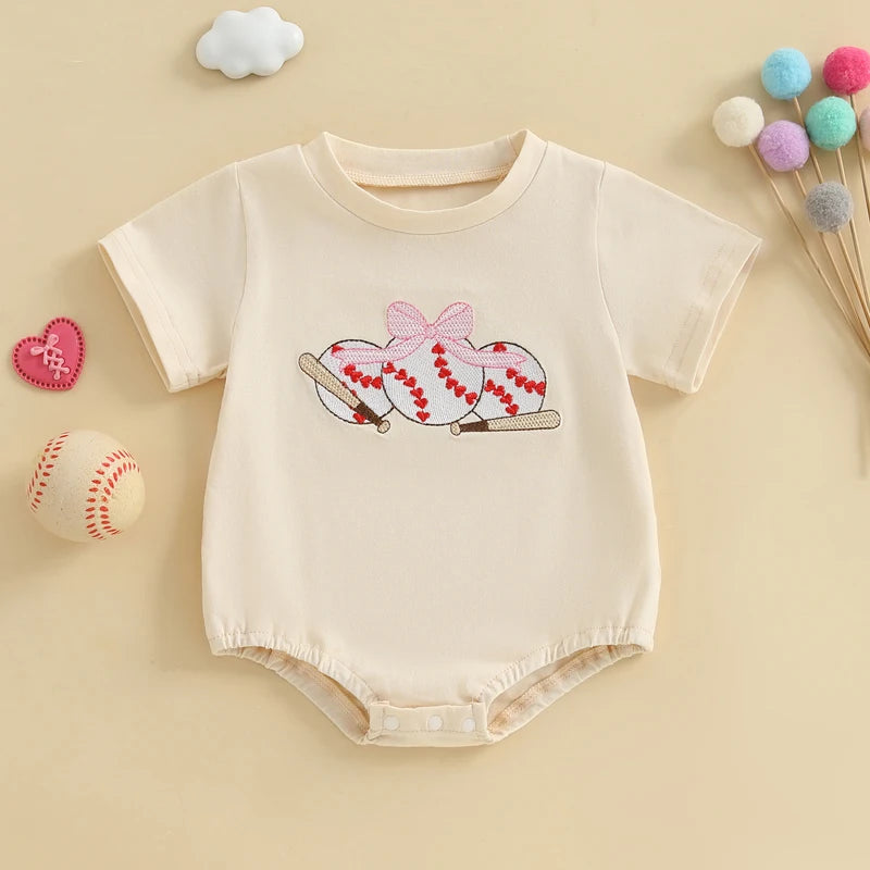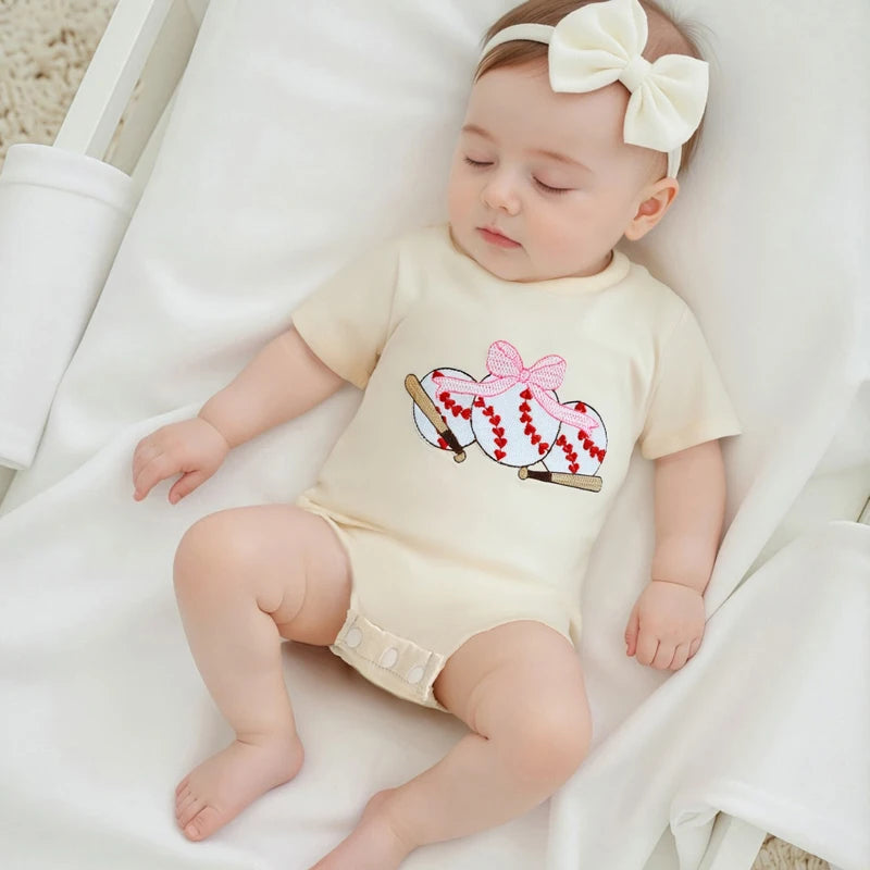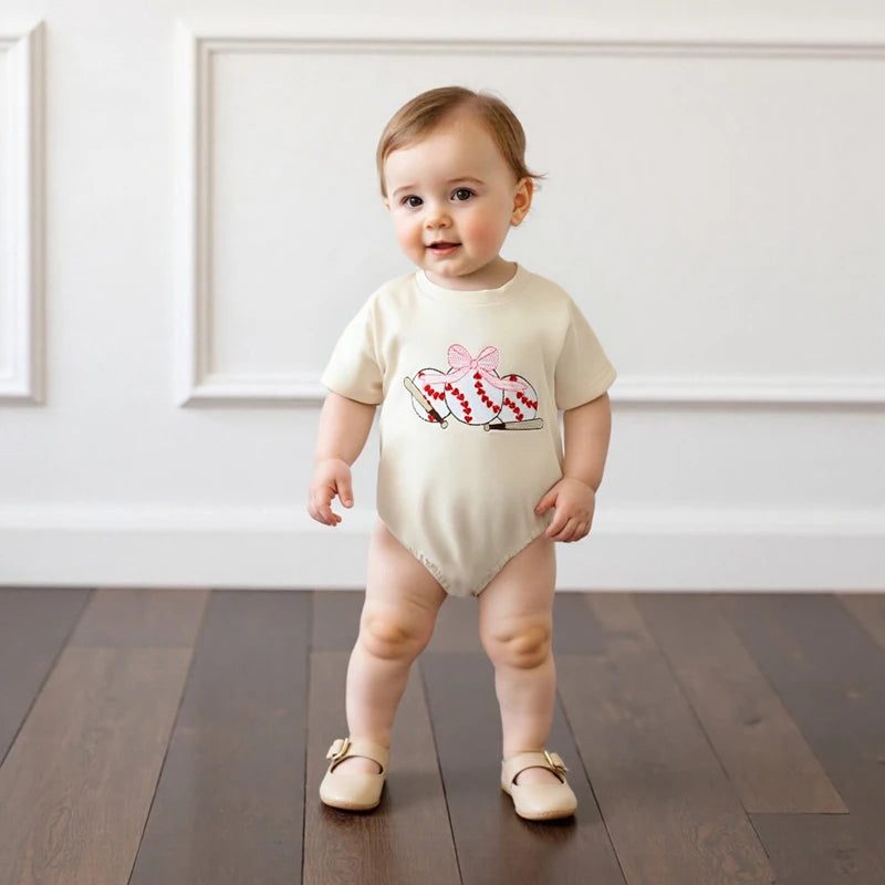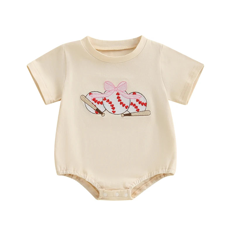 Baby Girls Boys Summer Romper Short Sleeve Round Neck Bow Baseball Embroidery Bodysuit Jumpsuit Babygrow