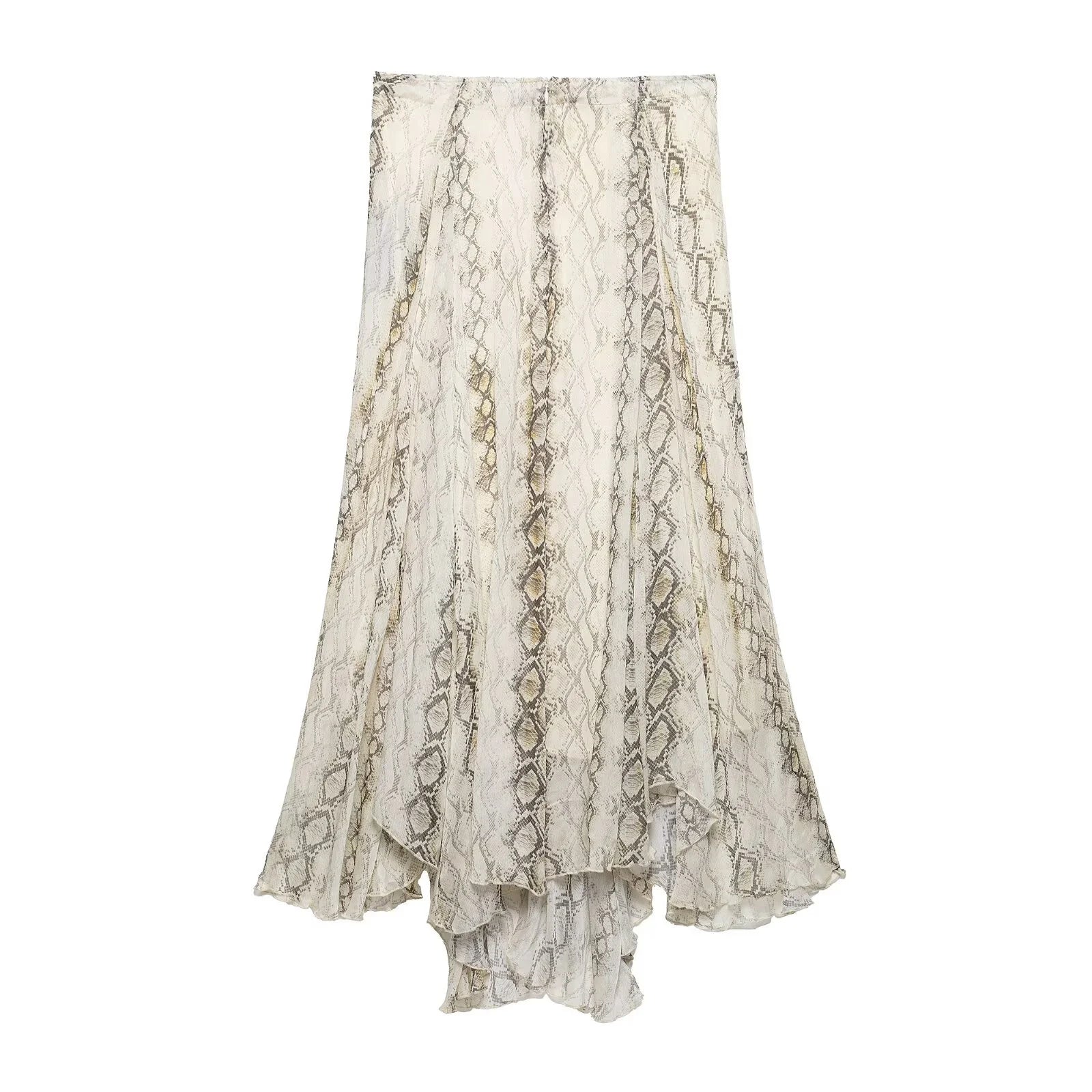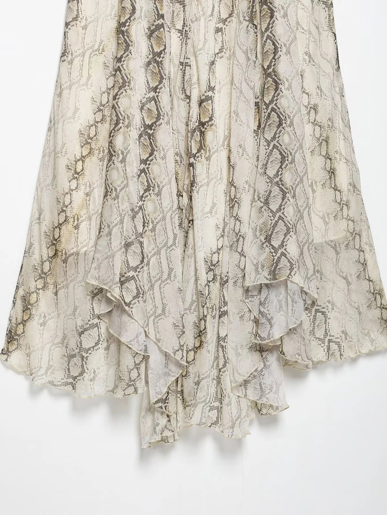 This captivating midi skirt brings together the timeless appeal of retro vacation style with contemporary fashion sensibilities. The irregular snake pattern adds visual interest while the versatile design makes it perfect for creating effortlessly chic summer looks.