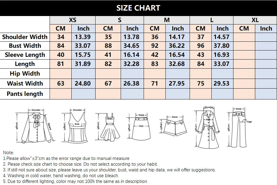 - Small: Bust 32-34", Waist 26-28", Length 36"