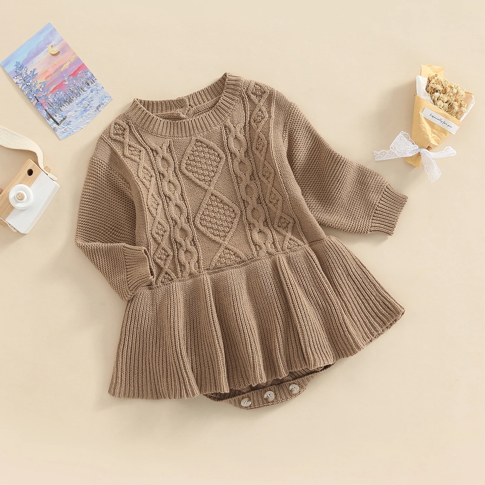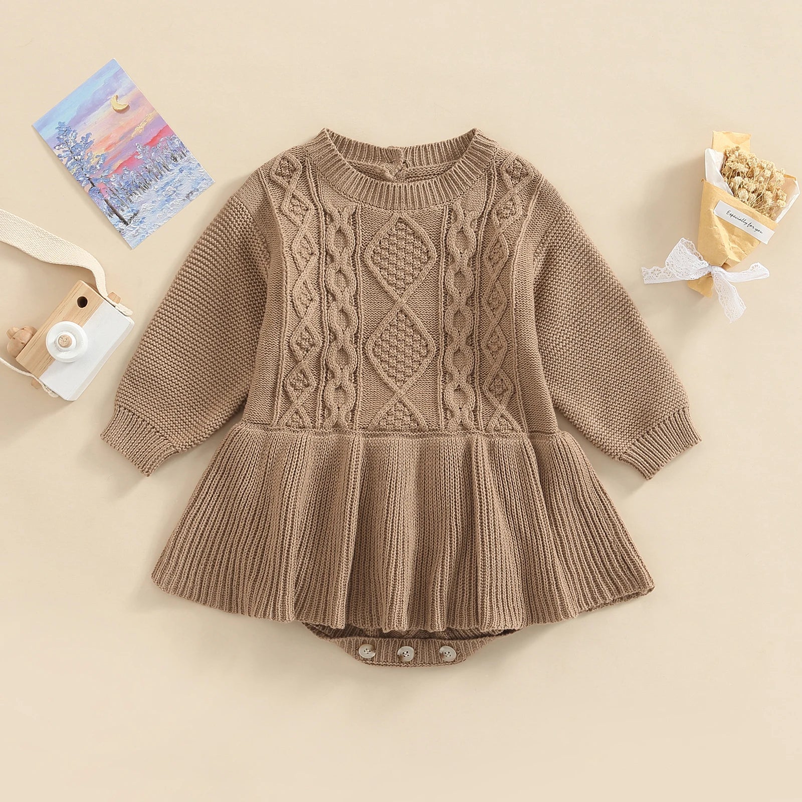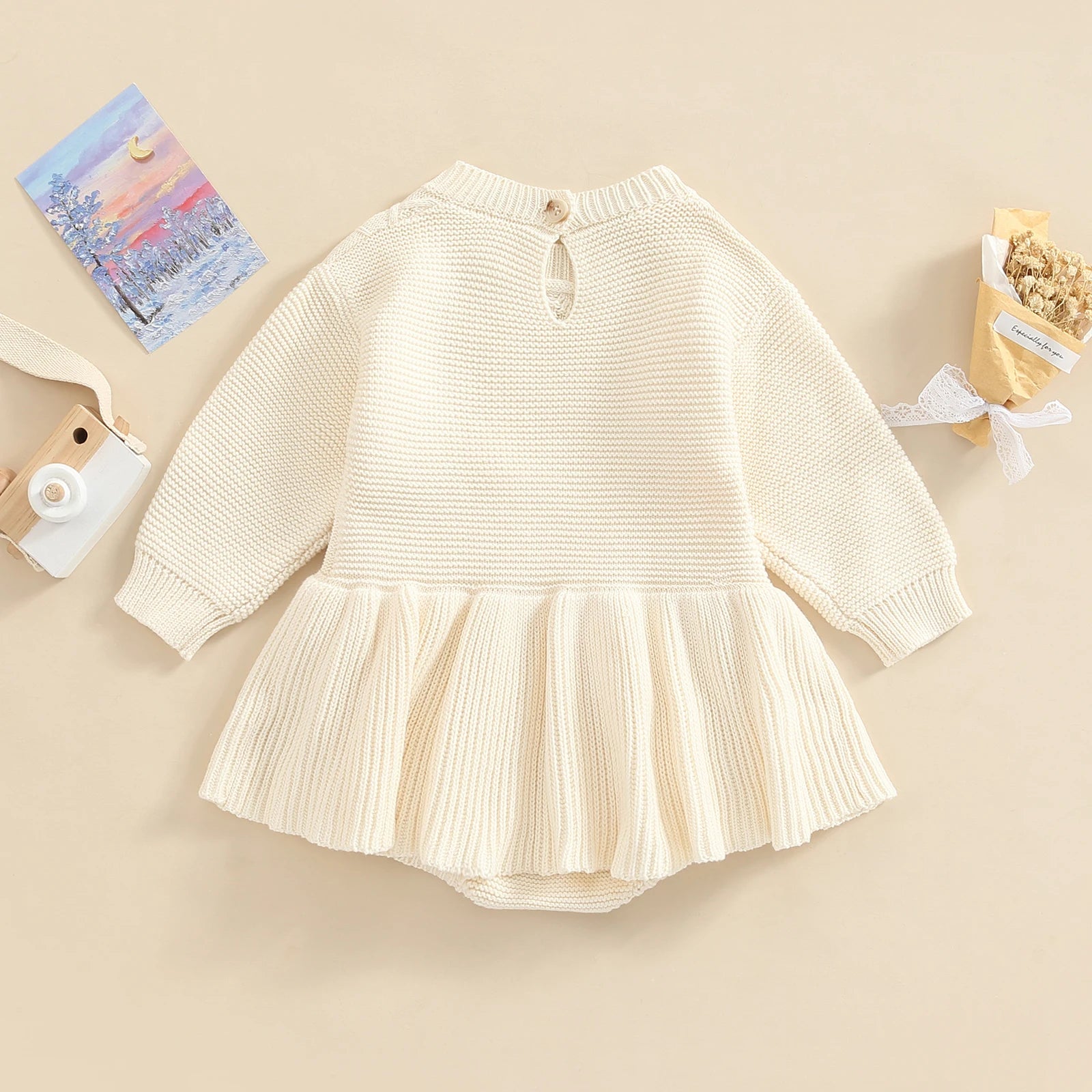 Girls 0-24M Knitted Sweater Romper Dress - Long Sleeve Solid Button Jumpsuit