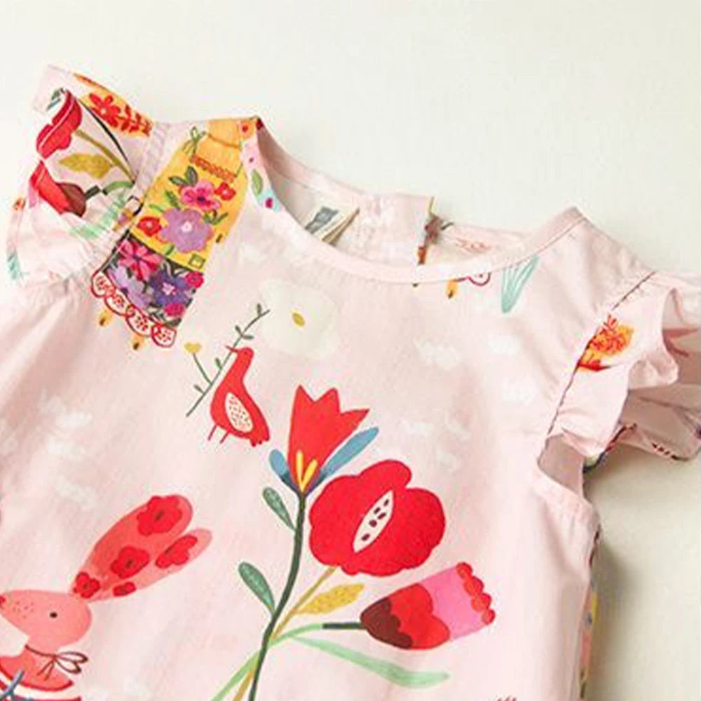 Girls' Round Neck Flying Sleeve Flower Print Dress