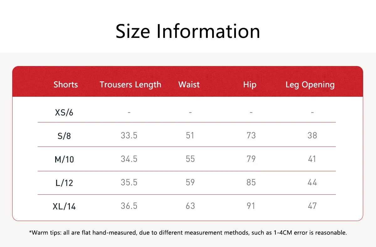 | Size | Waist (cm) | Hip (cm) | Inseam (cm) |