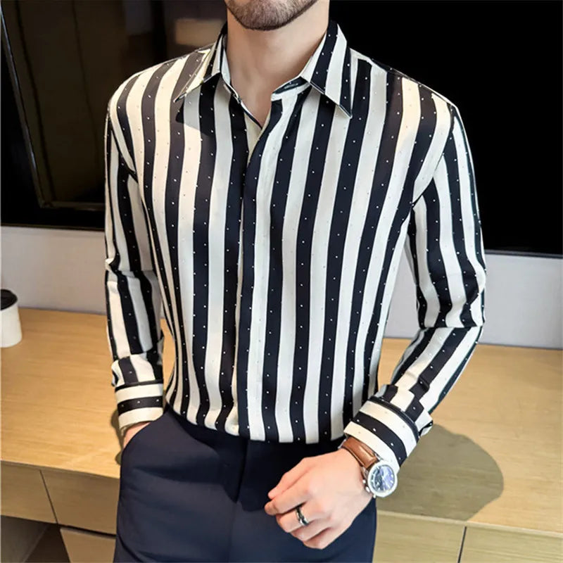 Elevate your smart-casual wardrobe with this sophisticated striped shirt featuring a distinctive square collar and single-breasted button closure. Perfect for spring and autumn styling, this versatile piece combines contemporary design with timeless appeal for the modern gentleman.