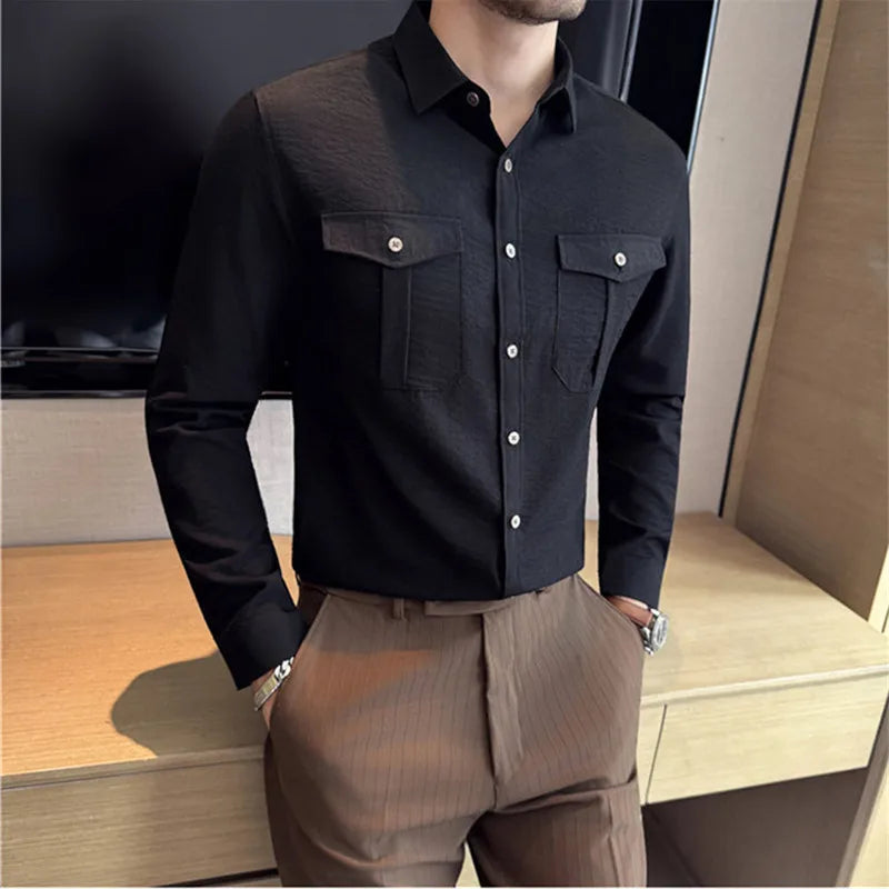 Men's Minimalist Slim Fit Shirt - Long Sleeve Solid Colour Smart Casual Pocket Blouse