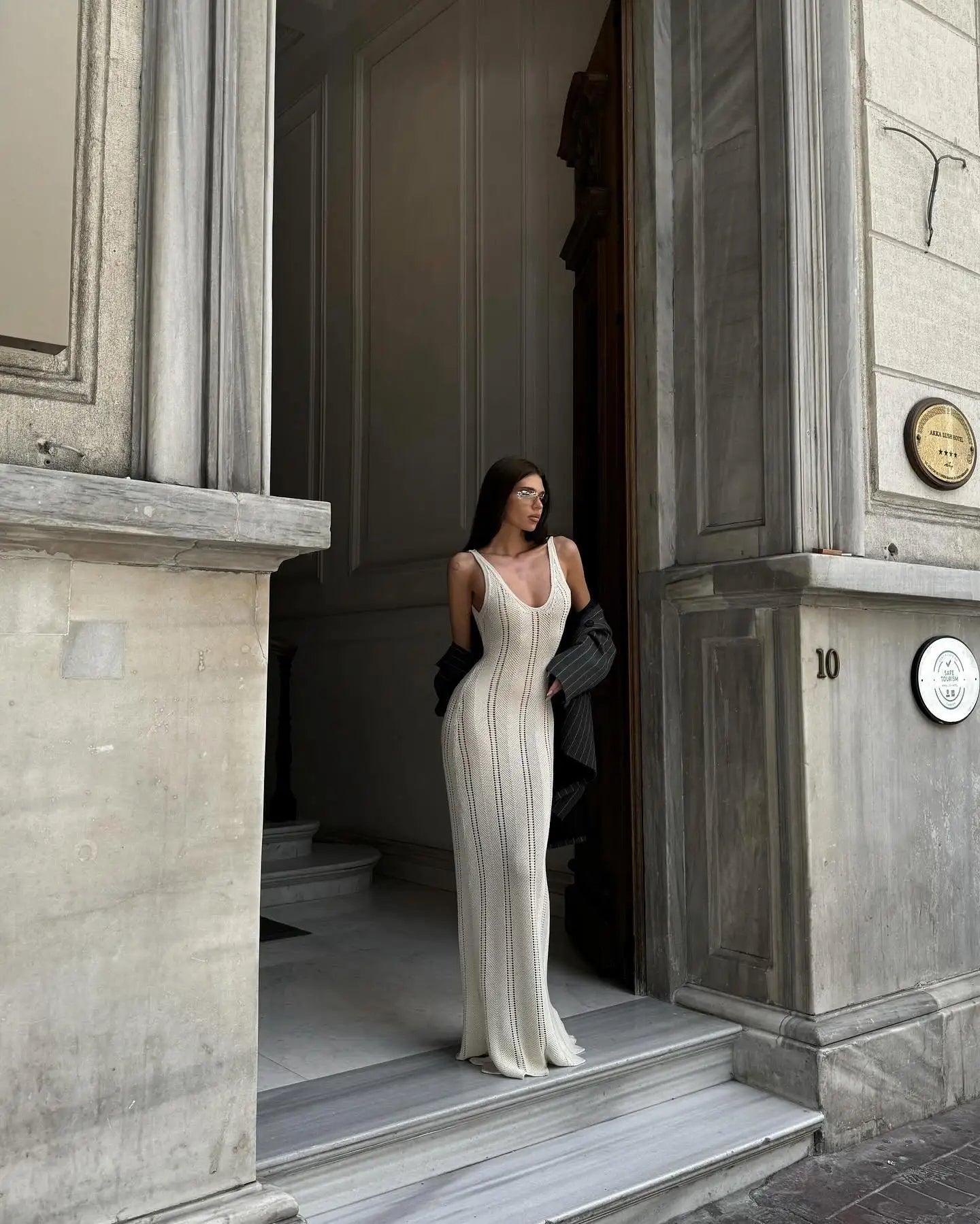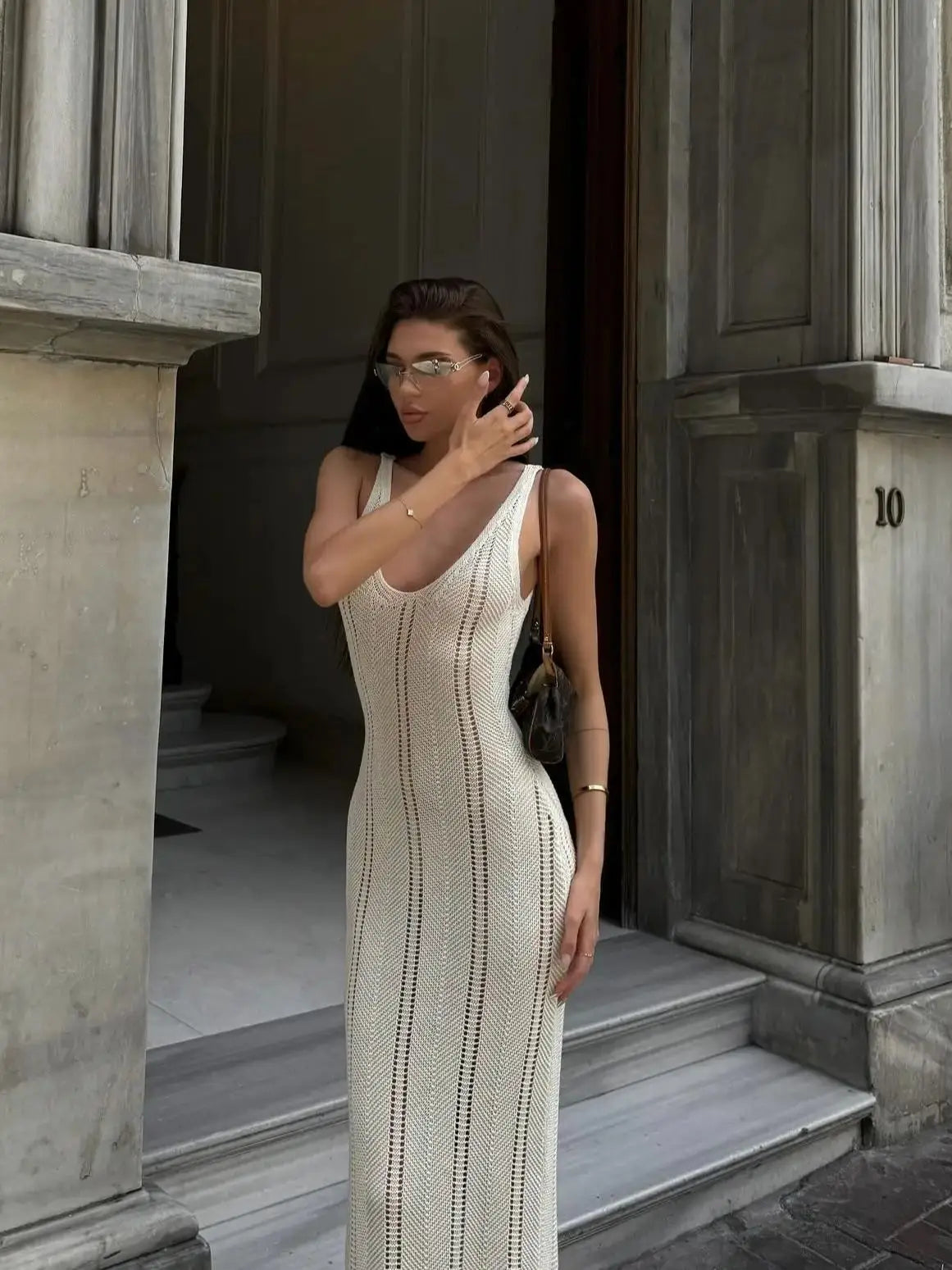 Embrace effortless elegance with this stunning crochet knit long dress that perfectly balances comfort and style. Featuring intricate knit detailing and a figure-flattering bodycon silhouette, this versatile piece transitions seamlessly from beach cover-up to evening party dress.