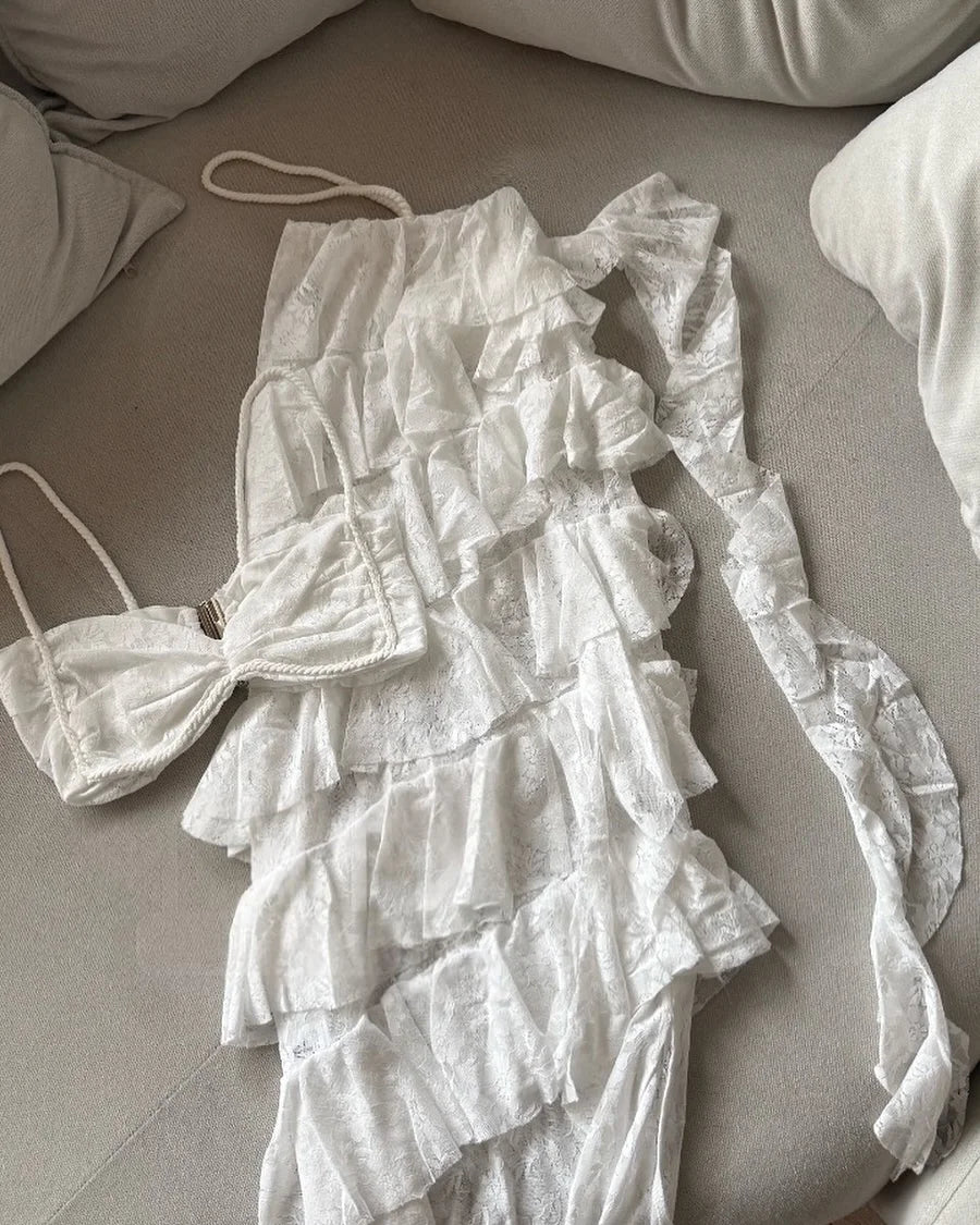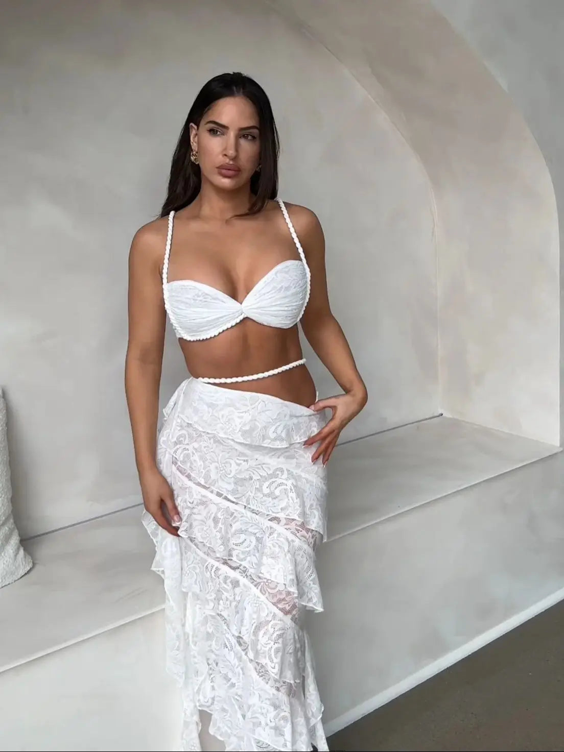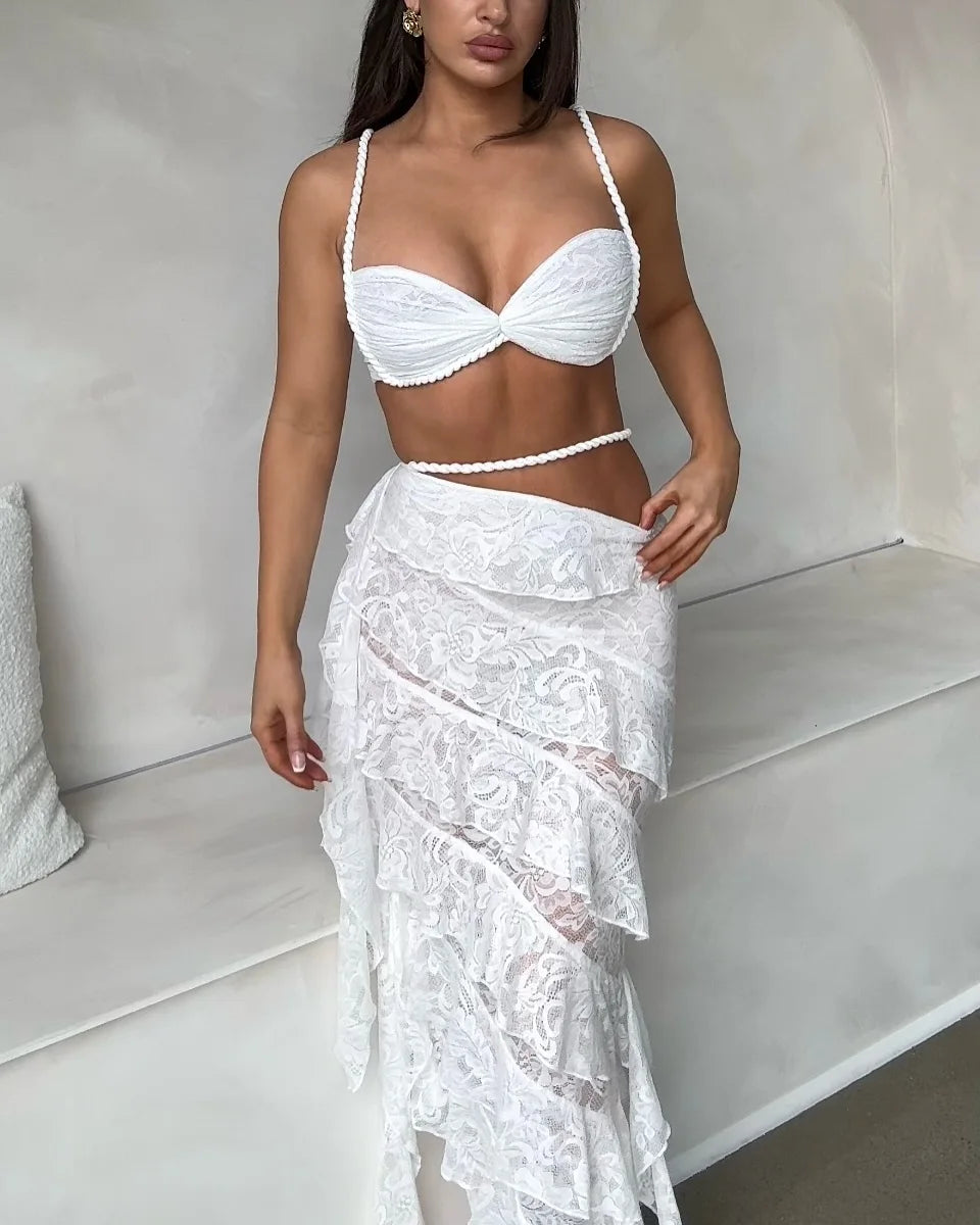 Women's Lace Ruffle Skirt Set Braid Skirt Halter Straps Tube Top Skirt Bra High Waist Chic Beach Set