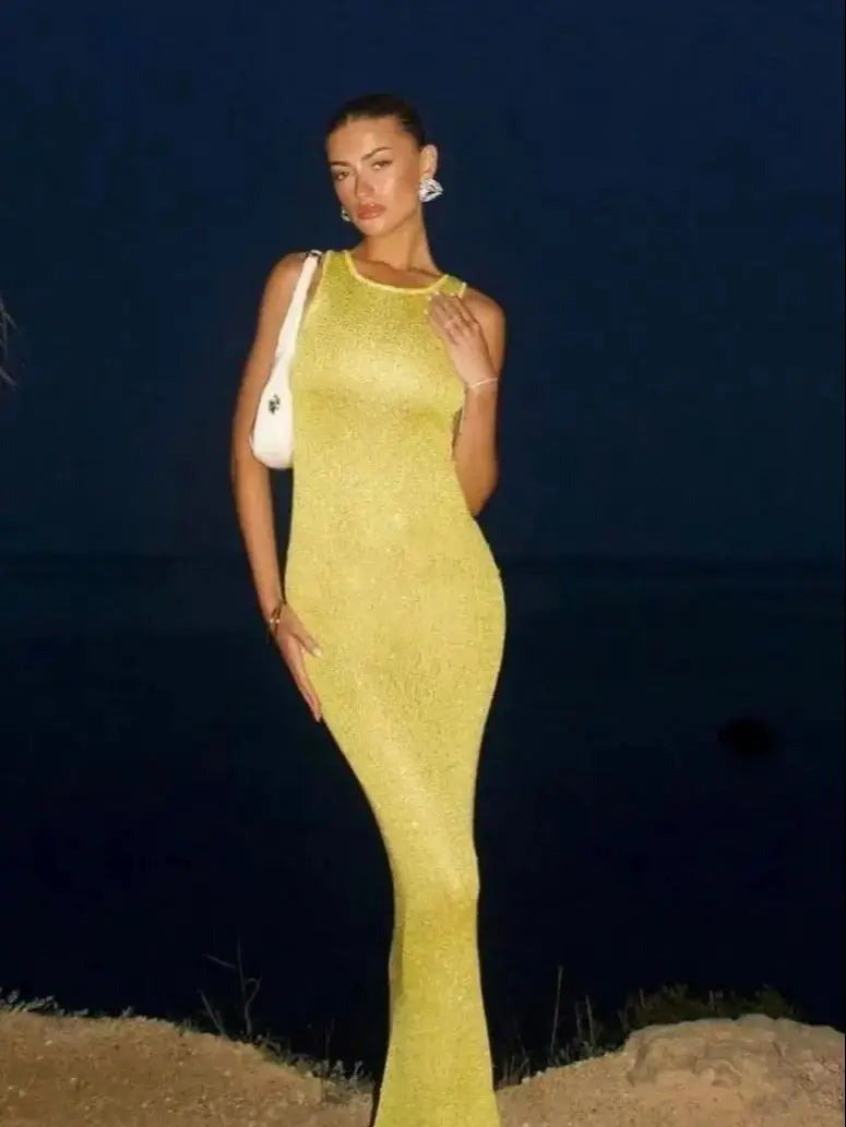 Embrace effortless elegance with this stunning backless column maxi dress that seamlessly transitions from beach cover-up to sophisticated party attire. The sleek silhouette and alluring backless design create a look that's both refined and captivating.