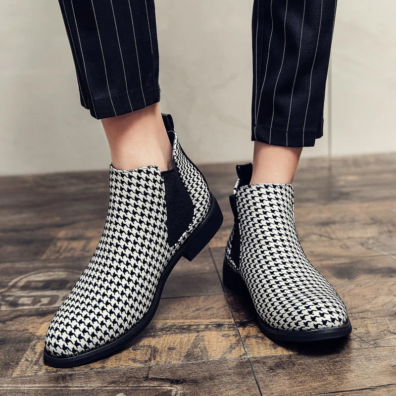 Make a statement with these distinctive houndstooth ankle boots. Crafted from premium leather with a sophisticated buckle strap detail, these pointed-toe boots deliver refined style for the modern gentleman who appreciates bold fashion choices.